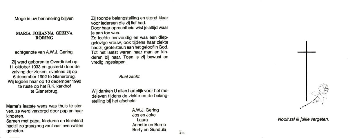 RÖRING, Maria Johanna Gezina, geboren op 11-10-1933 te Overdinkel, overleden op 6-12-1992 te Glanerbrug op 59-jarige leeftijd, begraven op 10-12-1992 te Glanerbrug.