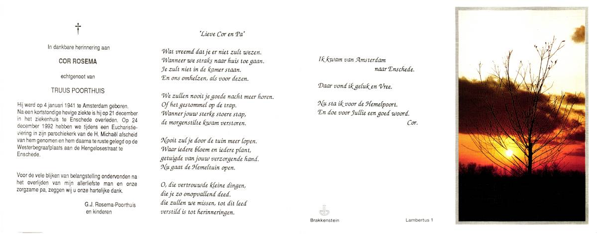 ROSEMA, Cor, geboren op 4-1-1941 te Amsterdam, overleden op 21-12-1992 te Enschede, ziekenhuis op 51-jarige leeftijd, begraven op 24-12-1992 te Enschede.