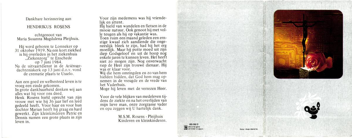 ROSENS, Hendrikus, geboren op 31-10-1919 te Lonneker, overleden op 7-6-1984 te Enschede op 64-jarige leeftijd, gecremeerd op 13-6-1984 te Usselo.