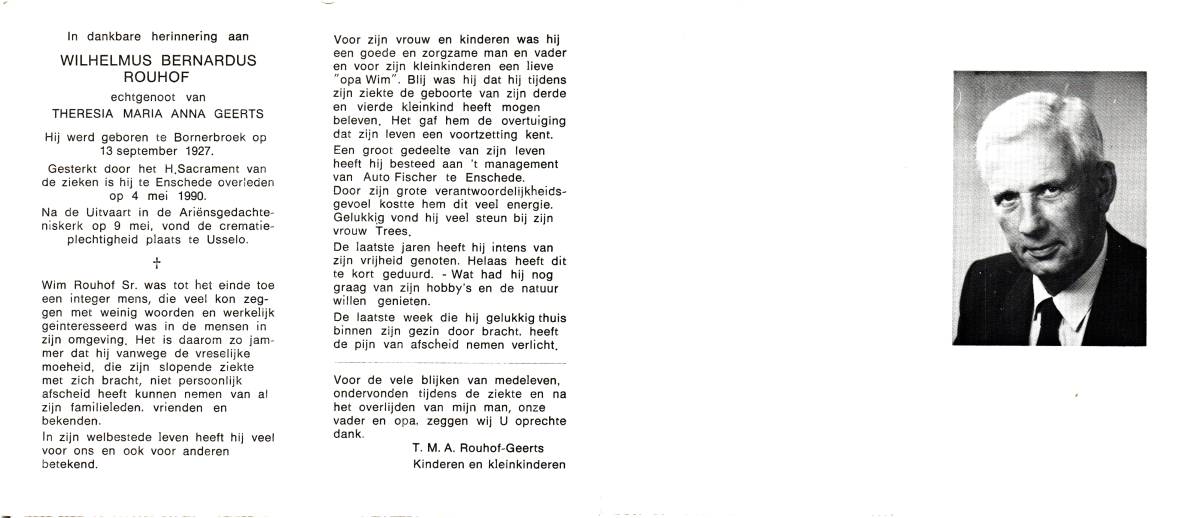 ROUHOF, Wilhelmus Bernardus, geboren op 13-9-1927 te Bornerbroek, overleden op 4-5-1990 te Enschede op 62-jarige leeftijd, gecremeerd op 9-5-1990 te Usselo.