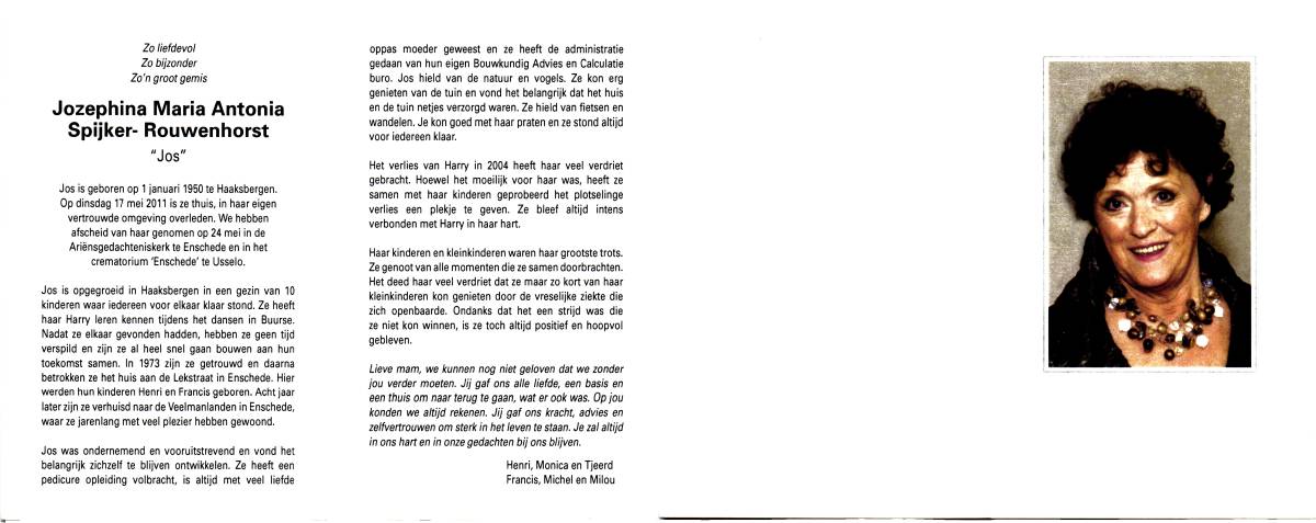 ROUWENHORST, Jozephina Maria Antonia (Jos), geboren op 1-1-1950 te Haaksbergen, overleden op 17-5-2011 te Enschede op 61-jarige leeftijd, gecremeerd op 24-5-2011 te Usselo.