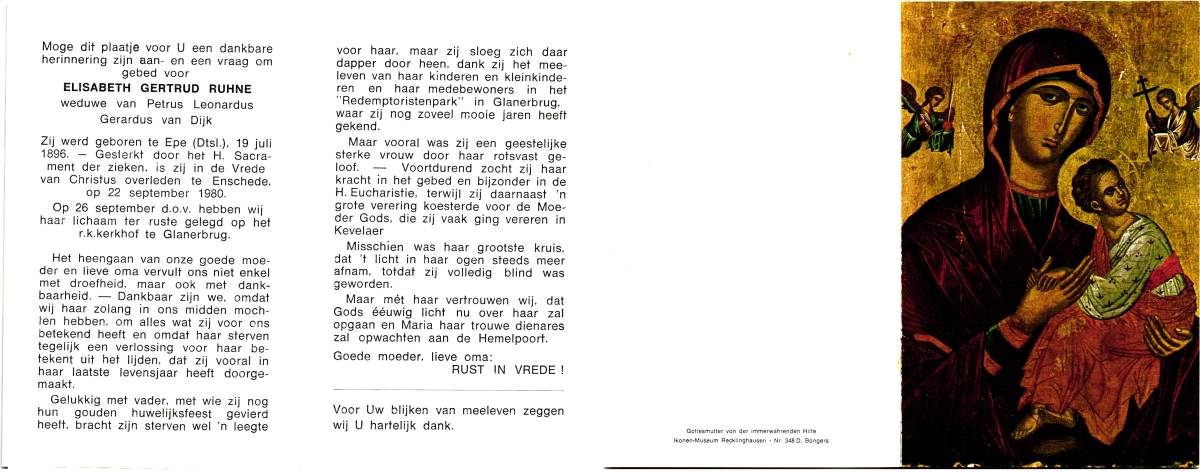 RUHNE, Elisabeth Gertrud, geboren op 19-07-1896 te Epe, Dld, overleden op 22-9-1980 te Enschede op 84-jarige leeftijd, begraven op 26-9-1980 te Glanerbrug.