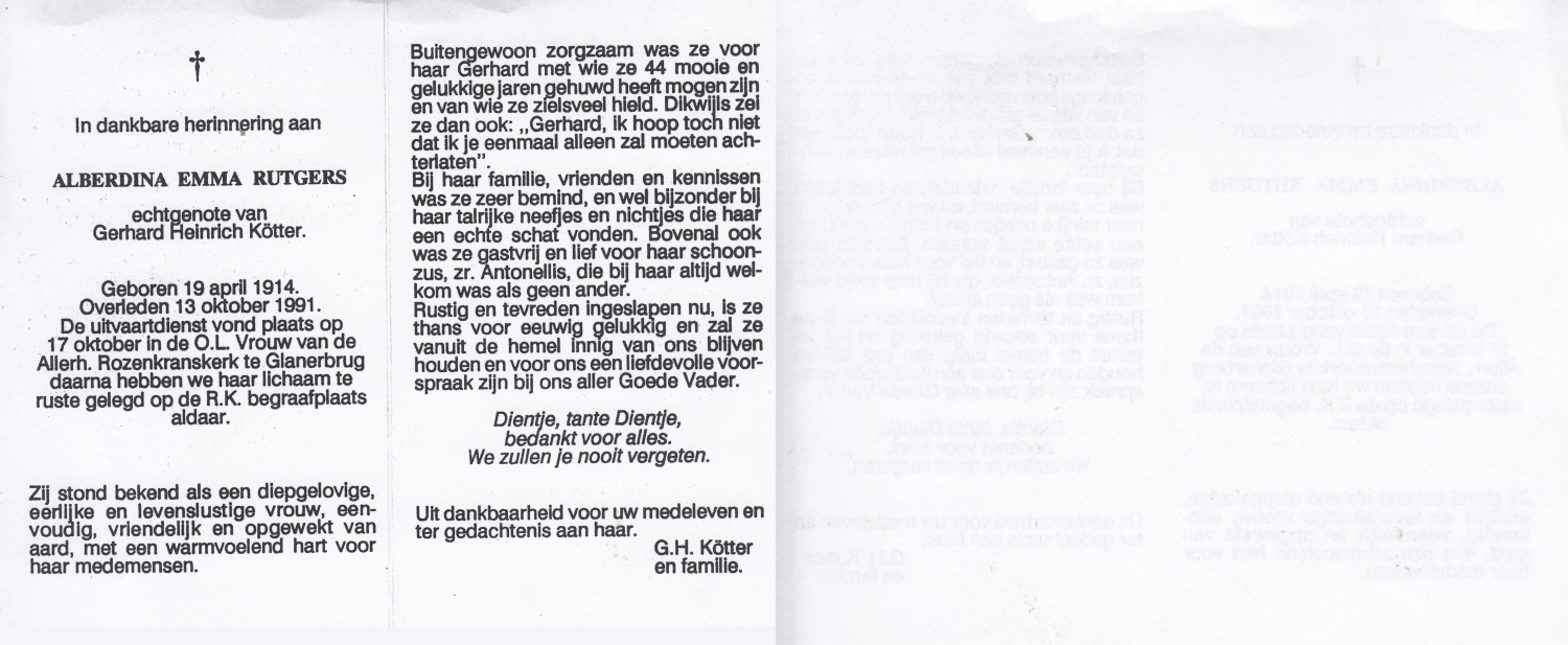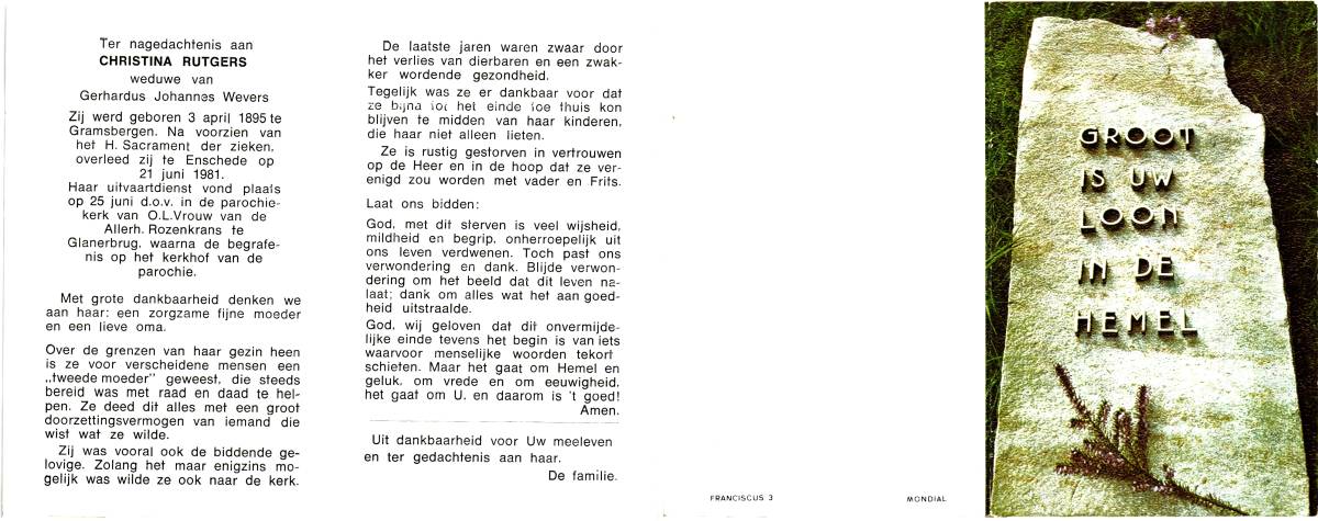 RUTGERS, Christina, geboren op 03-04-1895 te Gramsbergen, overleden op 21-6-1981 te Enschede op 86-jarige leeftijd, begraven op 25-6-1981 te Glanerbrug.