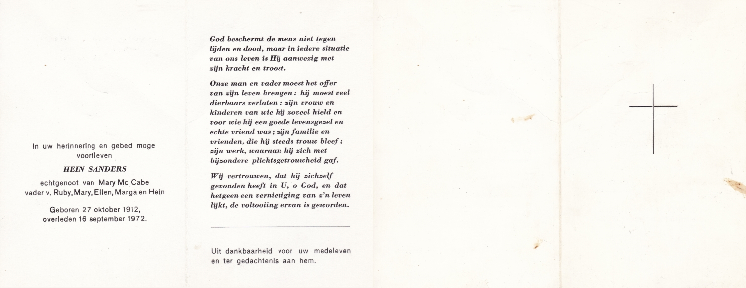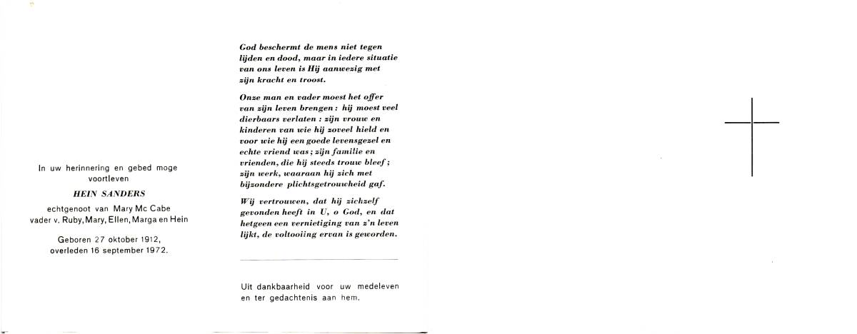 SANDERS, Hein, geboren op 27-10-1912, overleden op 16-9-1972 op 59-jarige leeftijd.