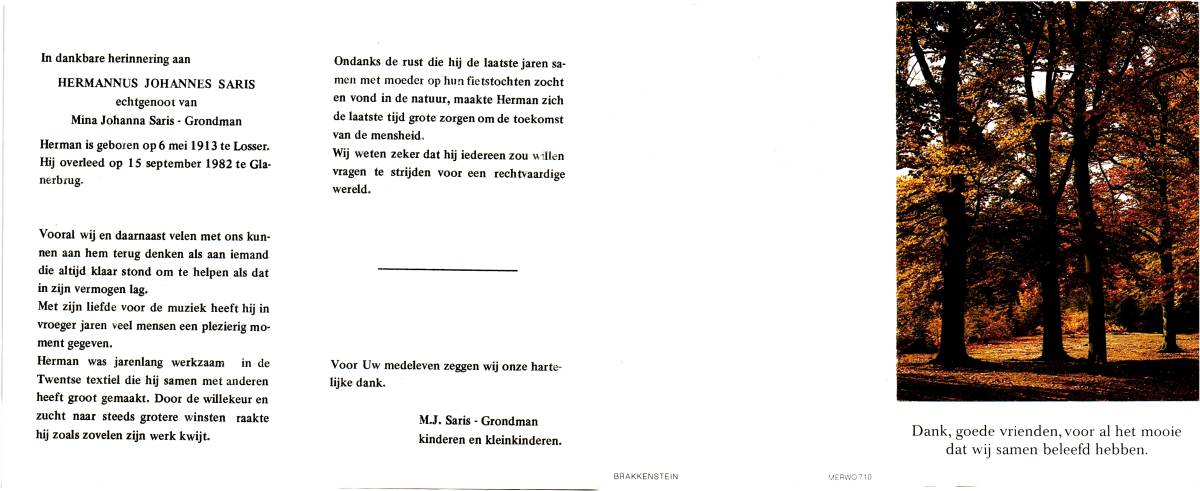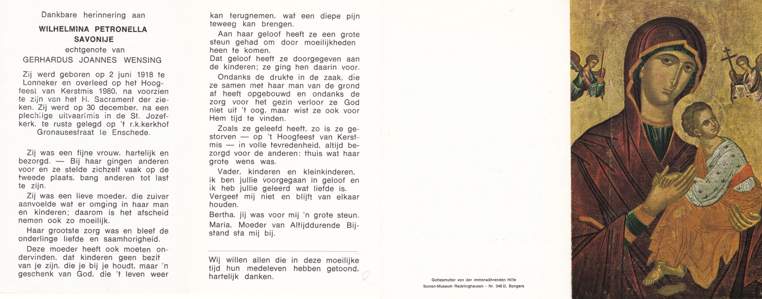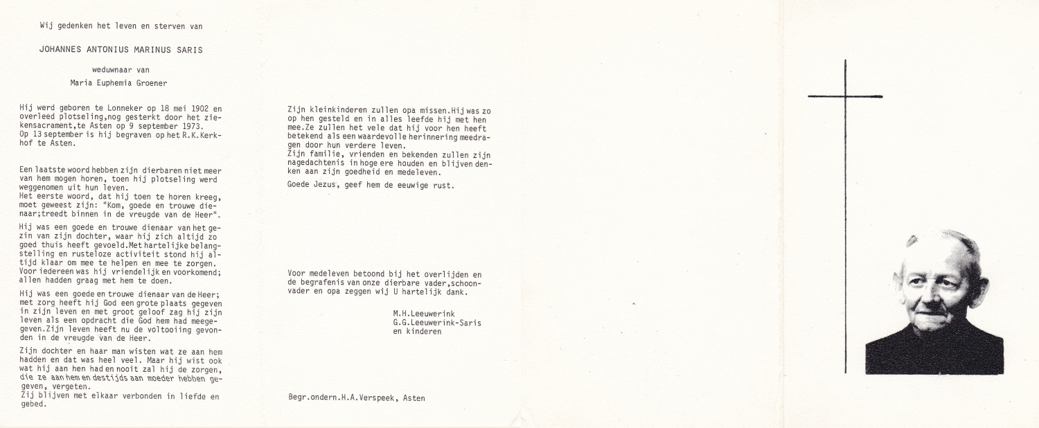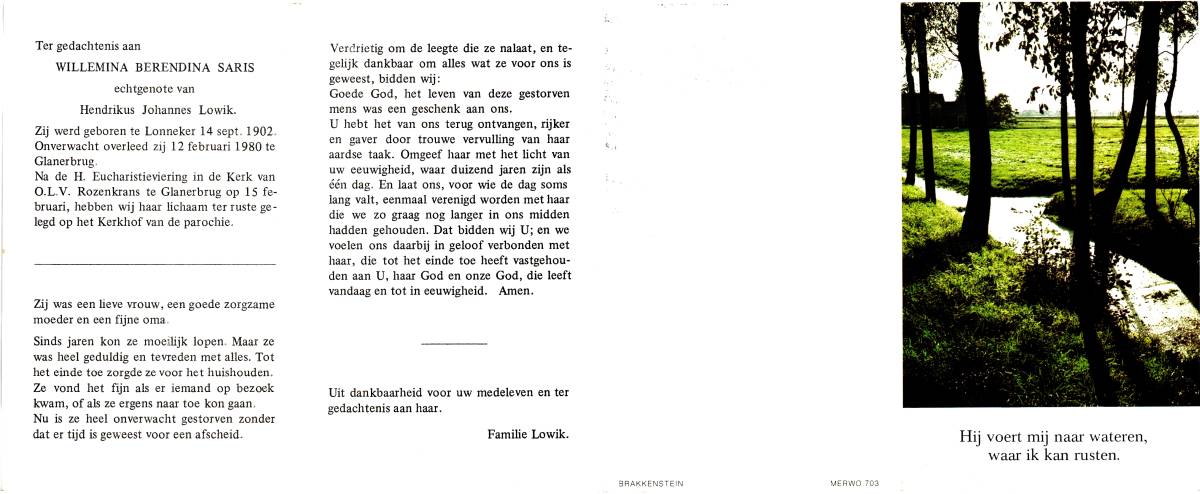 SARIS, Willemina Berendina, geboren op 14-9-1902 te Lonneker, overleden op 12-2-1980 te Glanerbrug op 77-jarige leeftijd, begraven op 15-2-1980 te Glanerbrug.