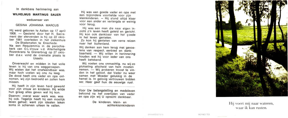 SAUER, Wilhelmus Martinus, geboren op 17-4-1908 te Aalten, overleden op 22-10-1981 te Enschede, ziekenhuis op 73-jarige leeftijd, gecremeerd op 27-10-1981 te Usselo.