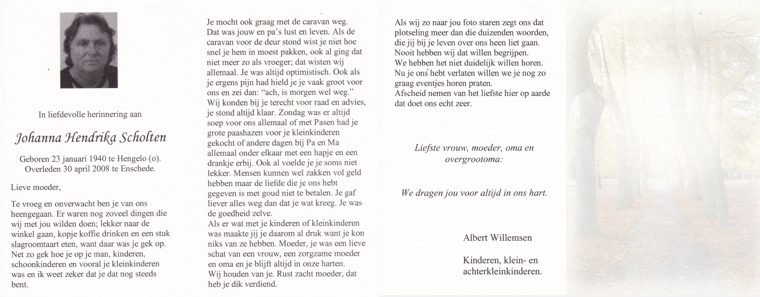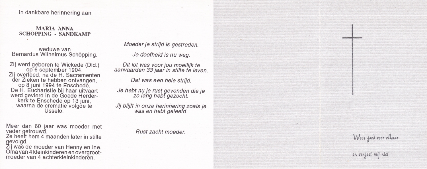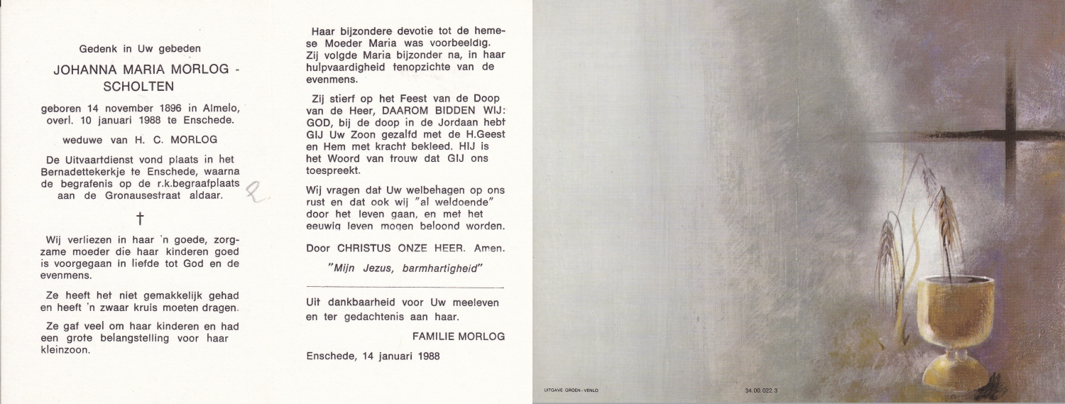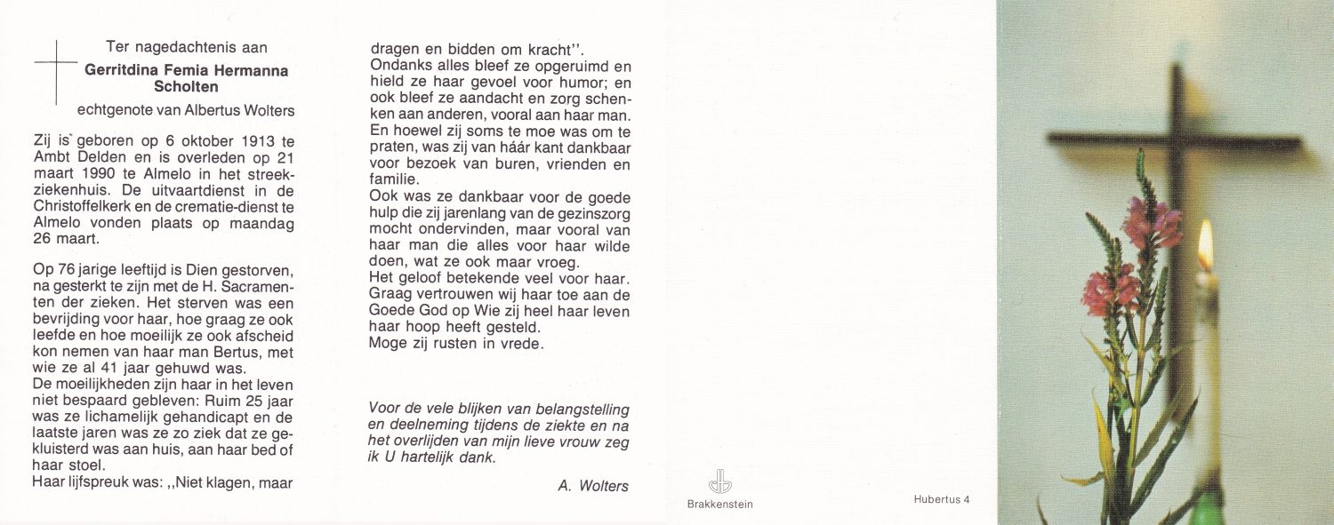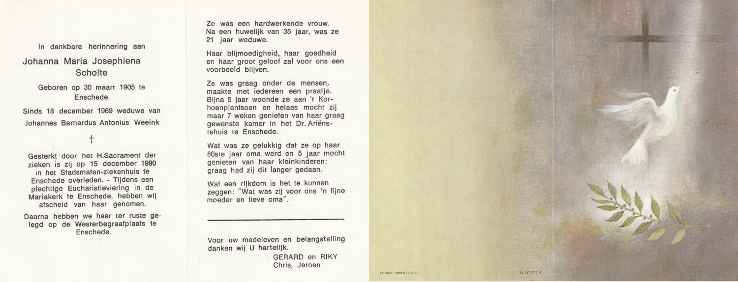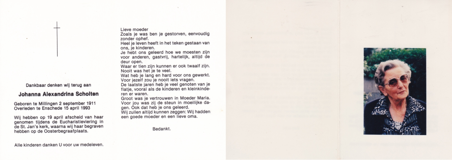 SCHOLTEN, Johanna Maria, geboren op 25-10-1907 te Enschede, overleden op 26-4-1990 te Enschede op 82-jarige leeftijd, begraven op 1-5-1990 te Enschede.