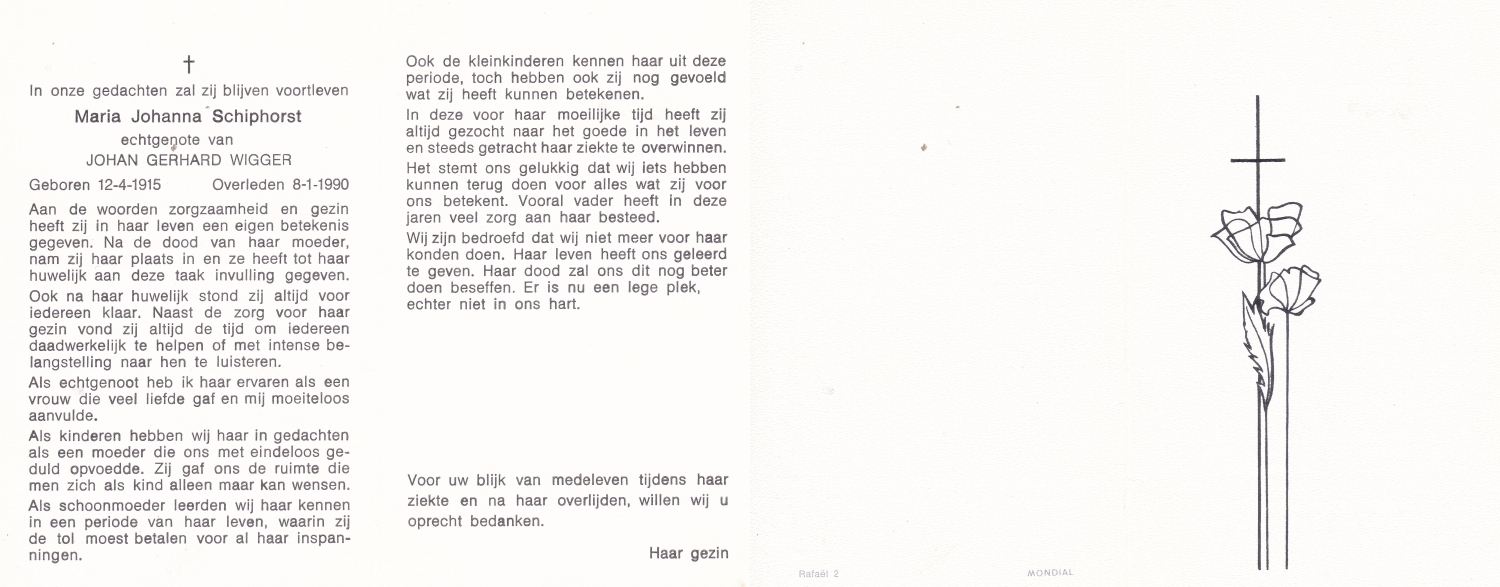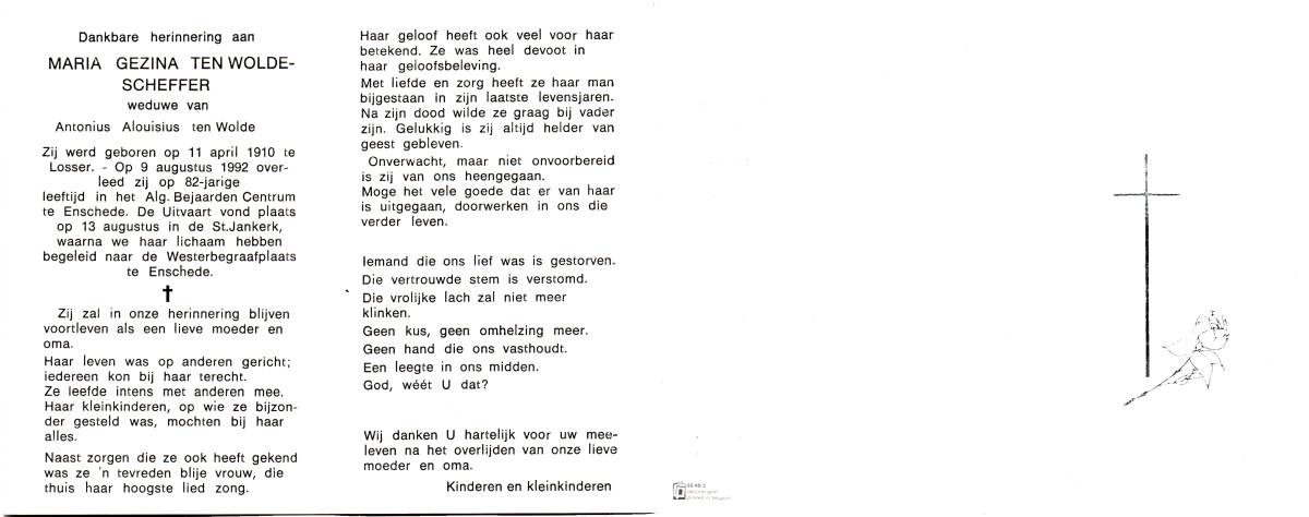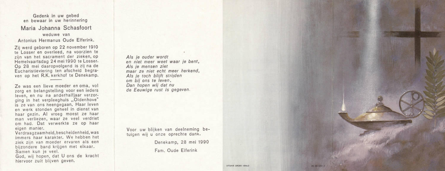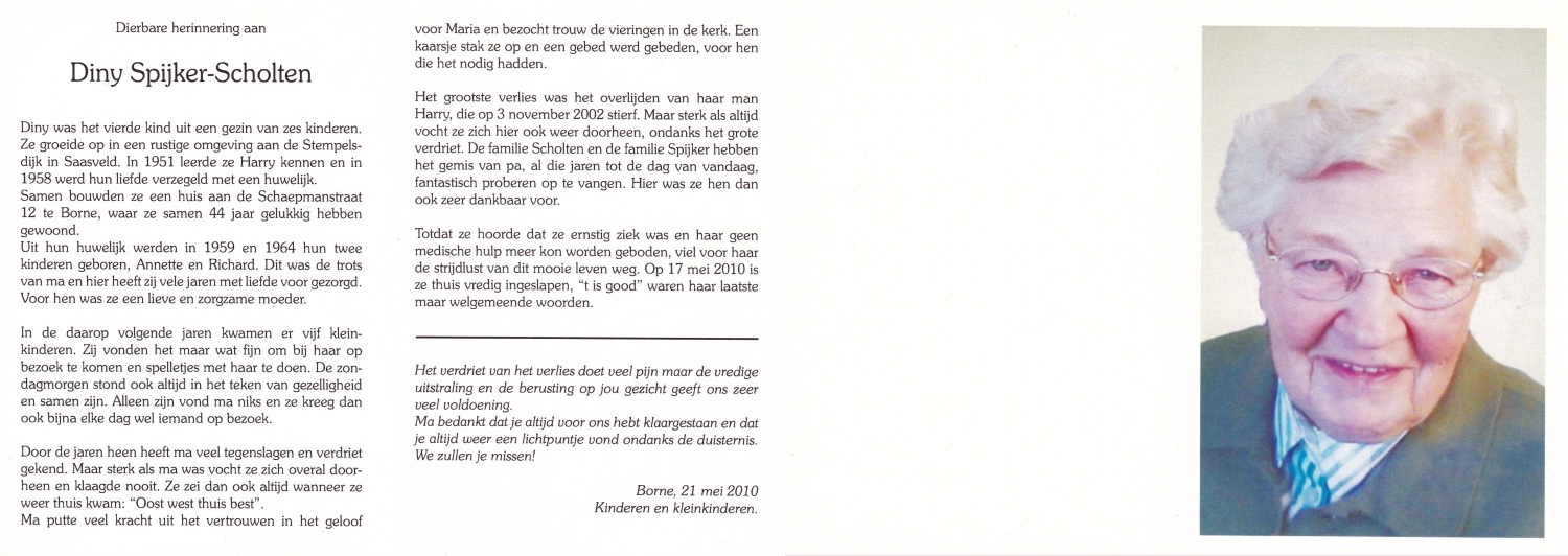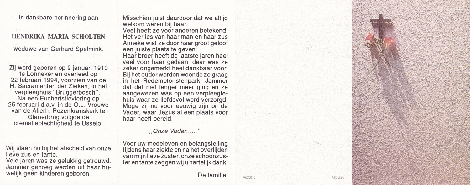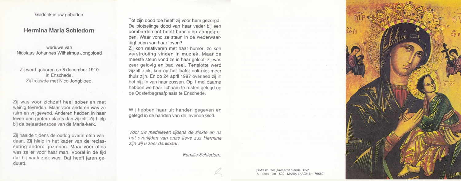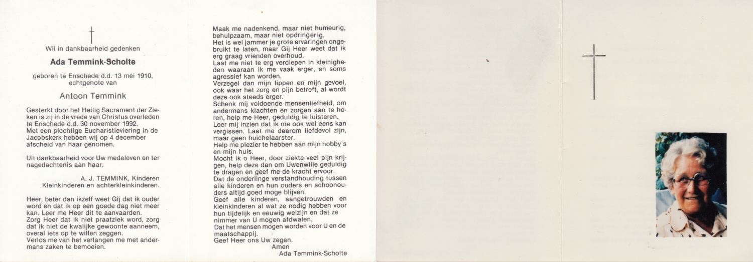 SCHOLTEN, Johanna Maria, geboren op 25-10-1907 te Enschede, overleden op 26-4-1990 te Enschede op 82-jarige leeftijd, begraven op 1-5-1990 te Enschede.