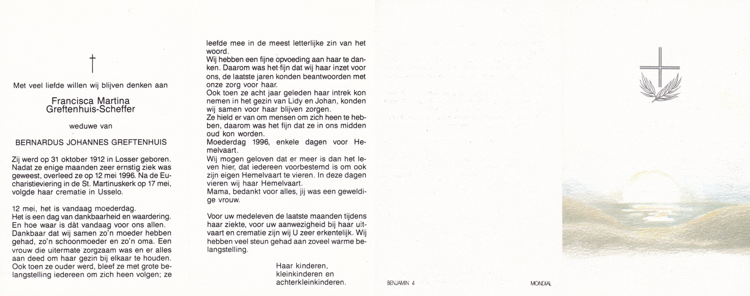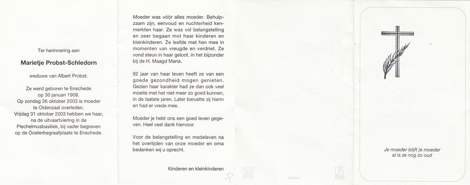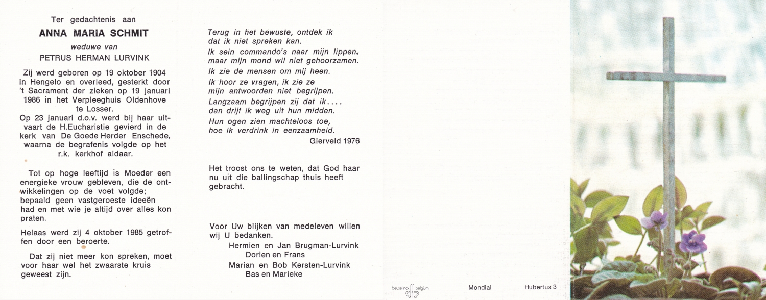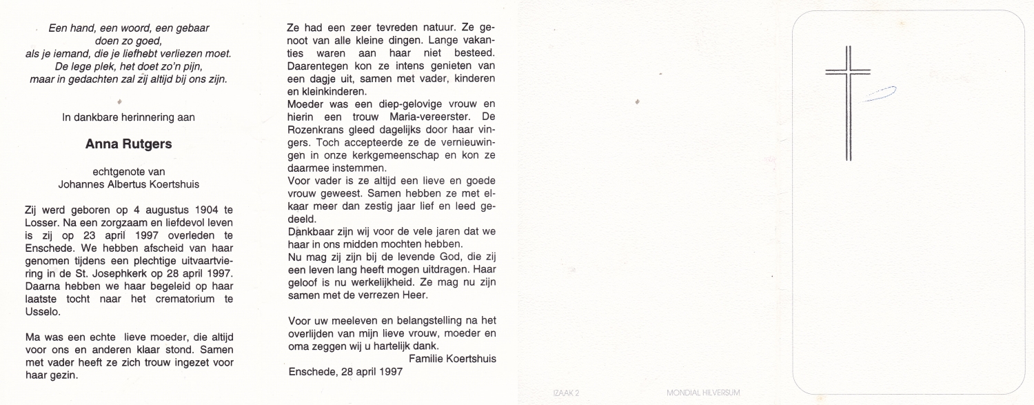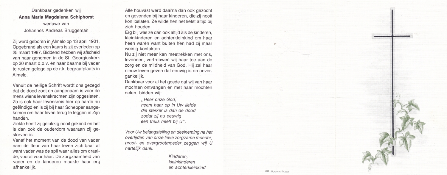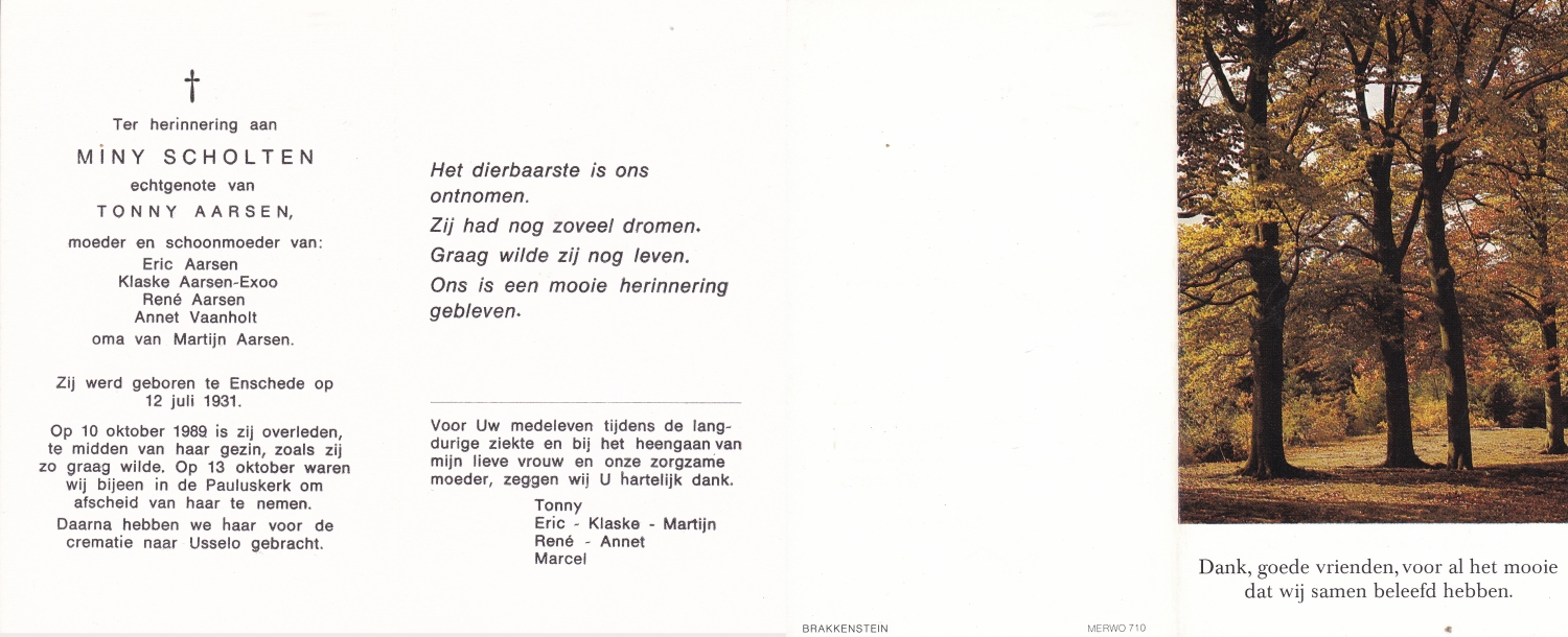 SCHOLTEN, Johanna Maria, geboren op 25-10-1907 te Enschede, overleden op 26-4-1990 te Enschede op 82-jarige leeftijd, begraven op 1-5-1990 te Enschede.