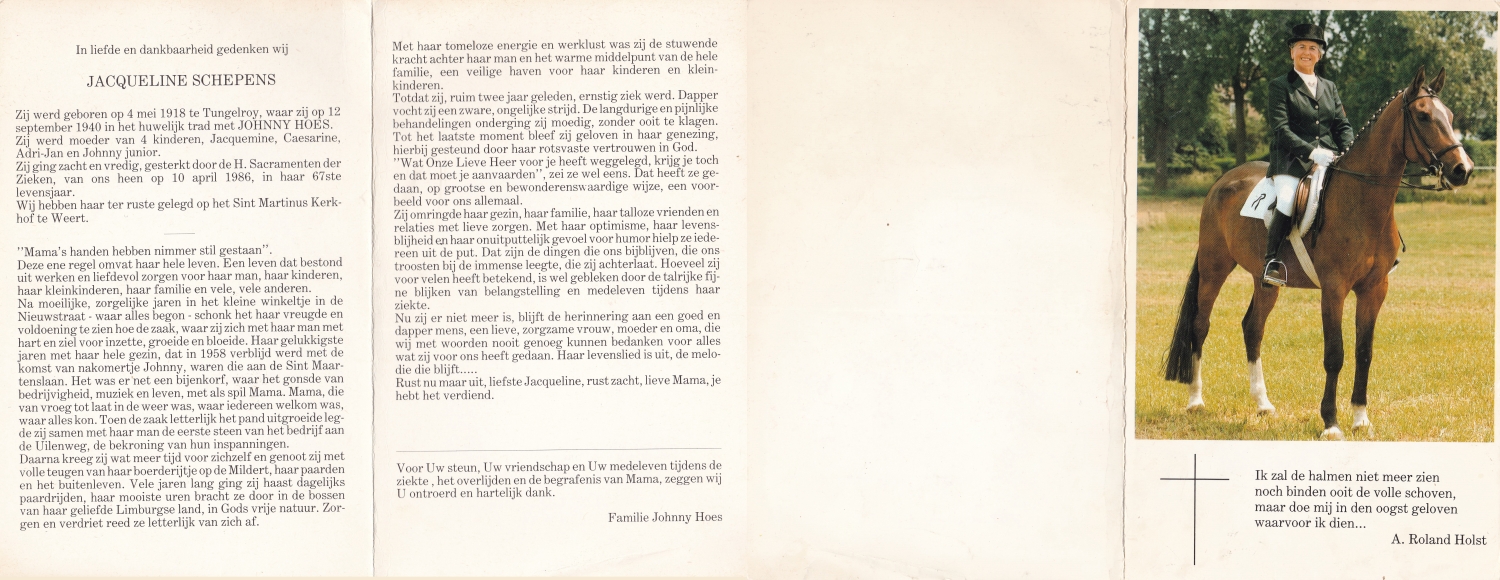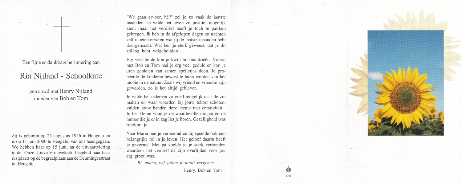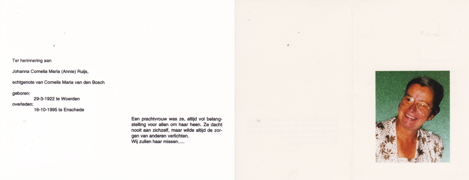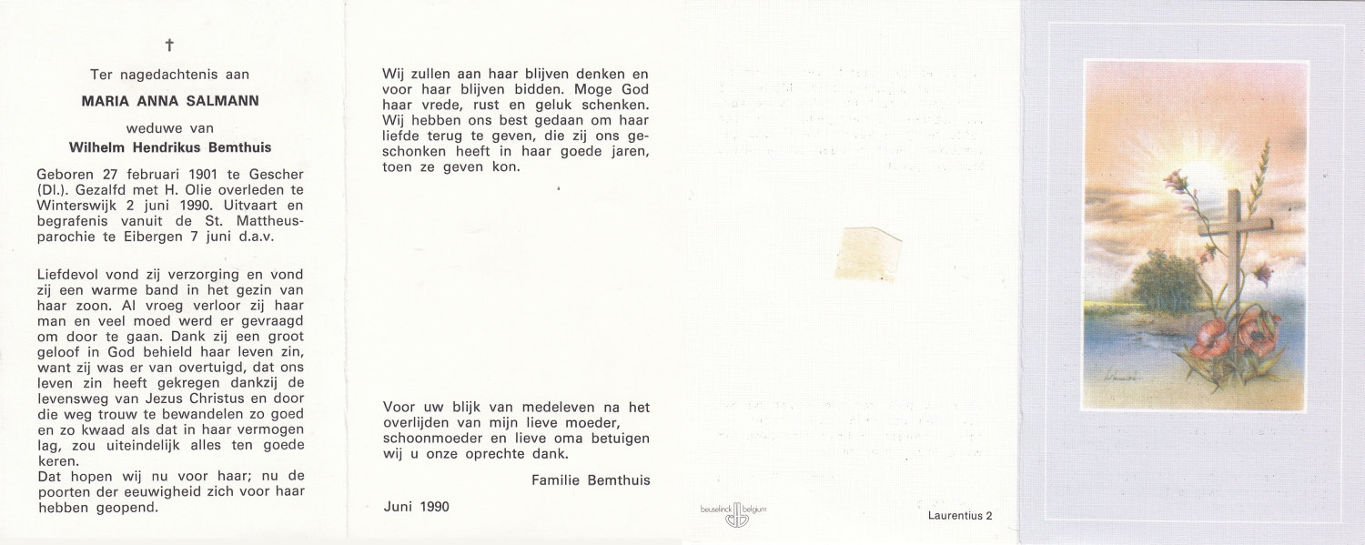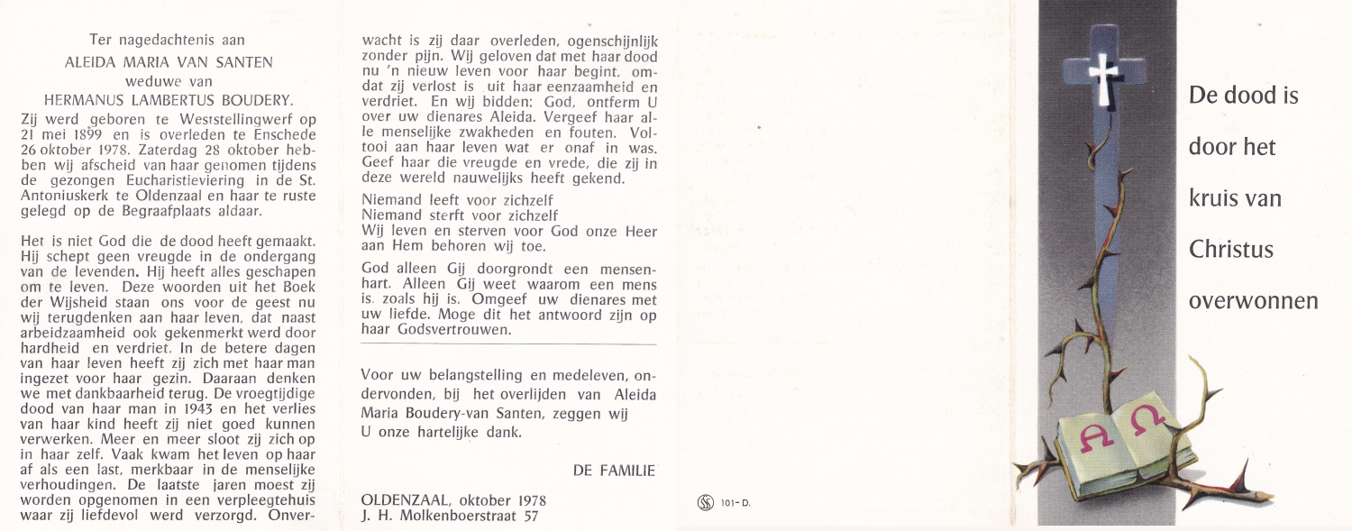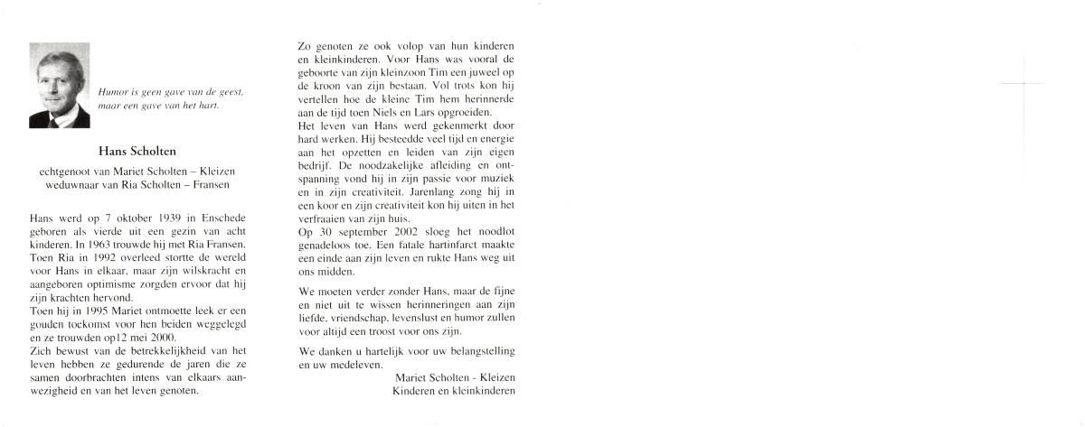 SCHOLTEN, Johanna Maria, geboren op 25-10-1907 te Enschede, overleden op 26-4-1990 te Enschede op 82-jarige leeftijd, begraven op 1-5-1990 te Enschede.