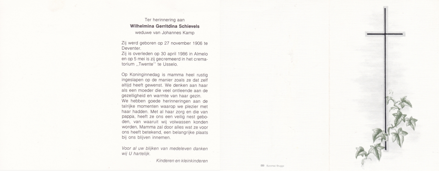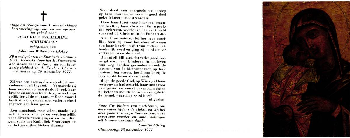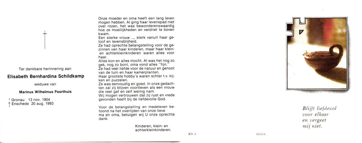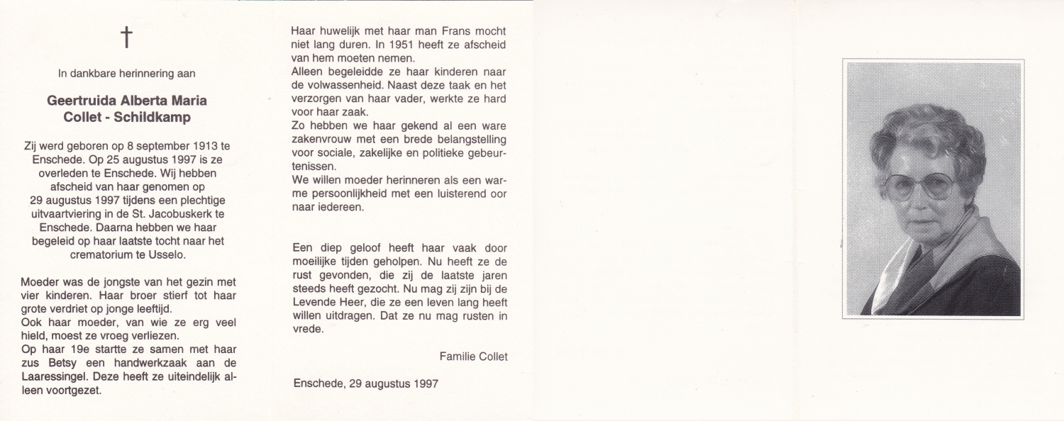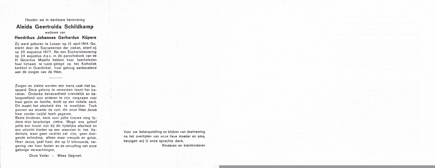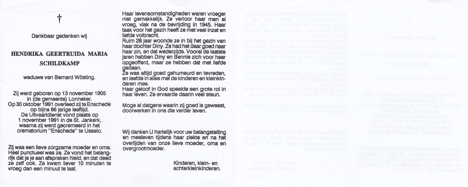 SCHILDKAMP, Elisabeth Hermanna Maria, geboren op 4-11-1908 te Enschede, overleden op 19-4-1989 te Enschede op 80-jarige leeftijd, begraven op 24-4-1989 te Enschede.