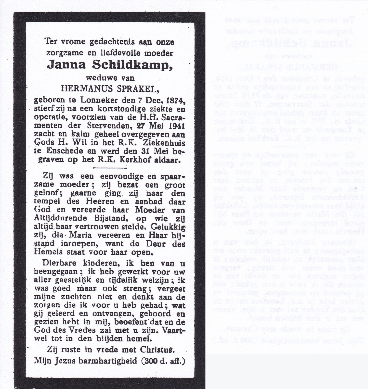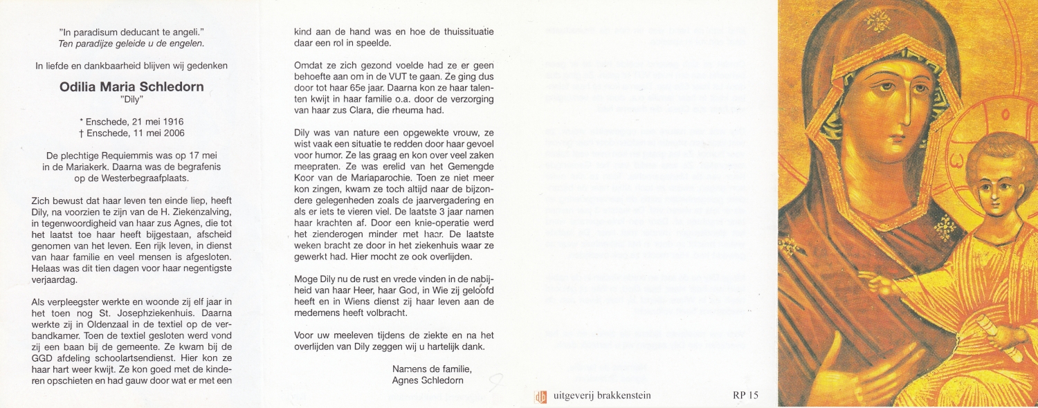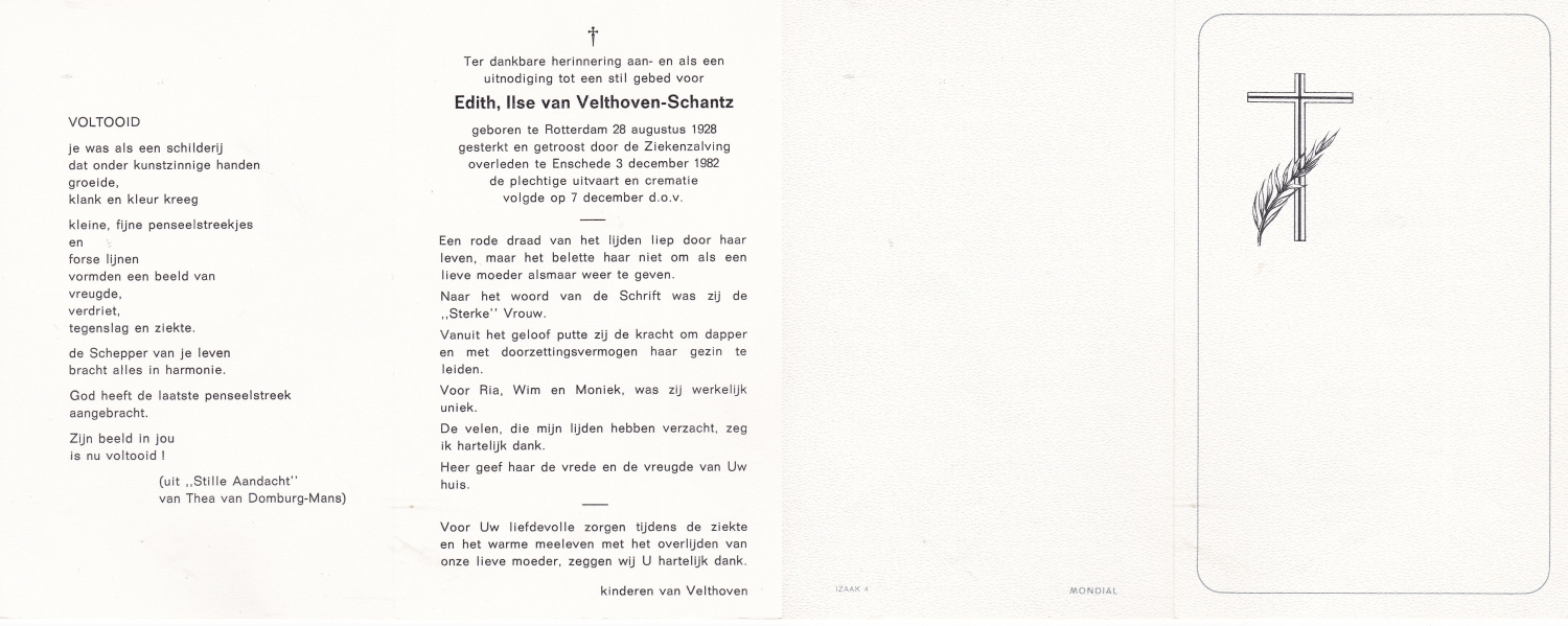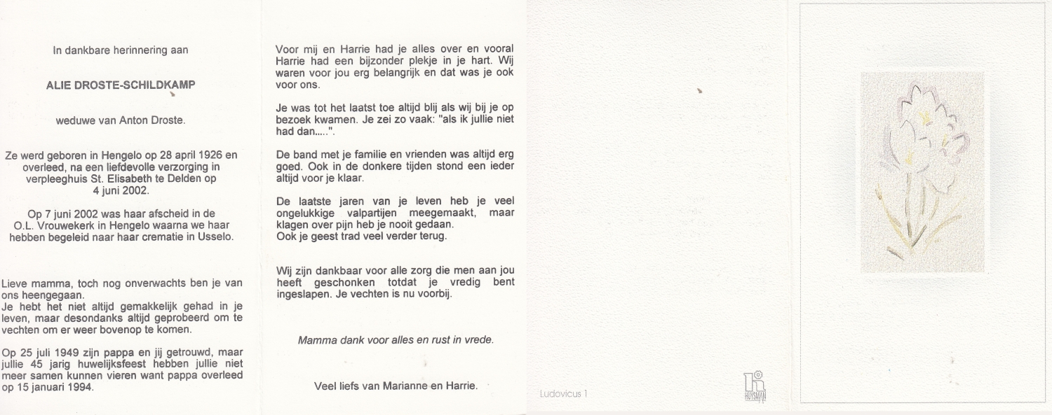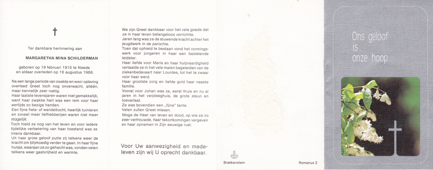 SCHILDKAMP, Elisabeth Hermanna Maria, geboren op 4-11-1908 te Enschede, overleden op 19-4-1989 te Enschede op 80-jarige leeftijd, begraven op 24-4-1989 te Enschede.