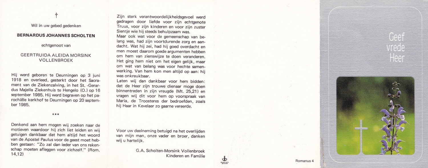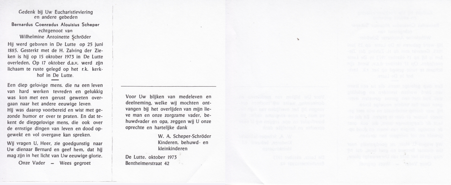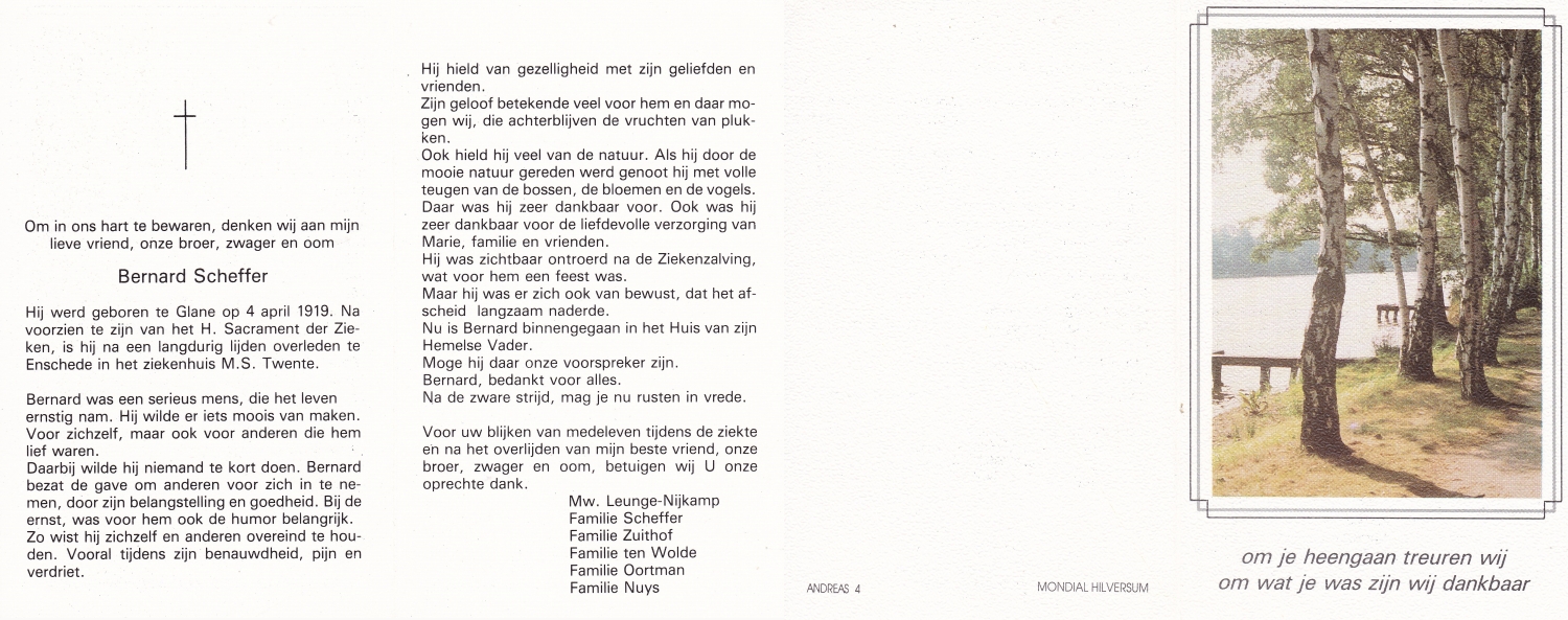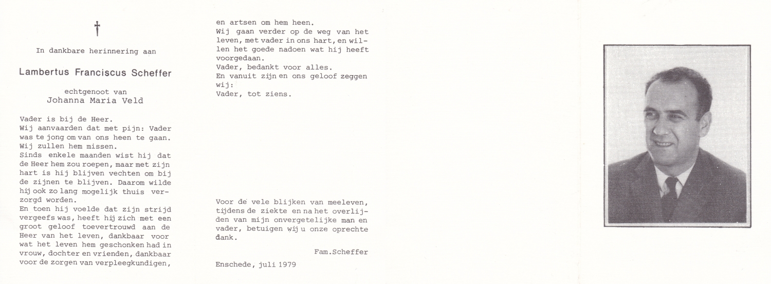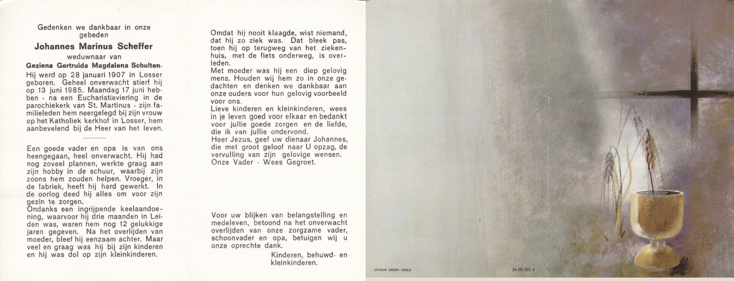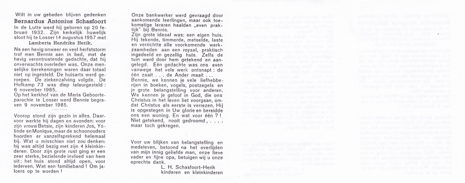 SCHEFFER, Bernardus Martinus, geboren op 8-7-1932 te Losser, overleden op 10-1-1985 te Enschede op 52-jarige leeftijd, begraven op 15-1-1985 te Overdinkel.