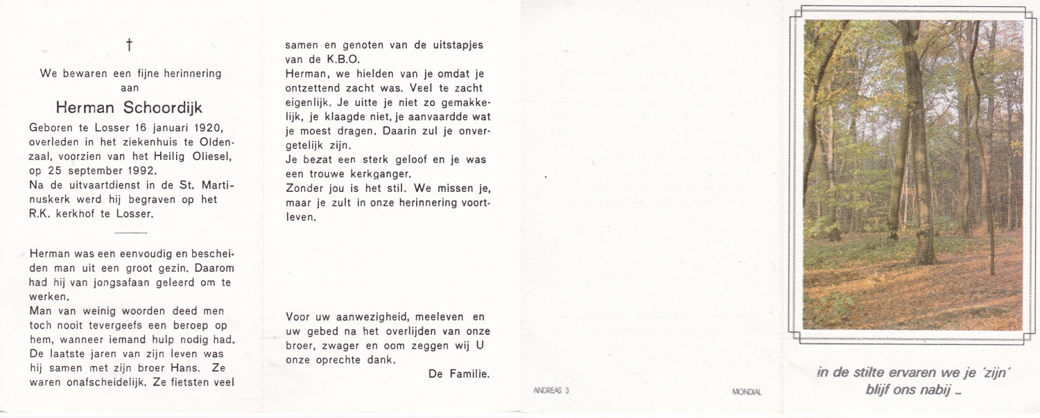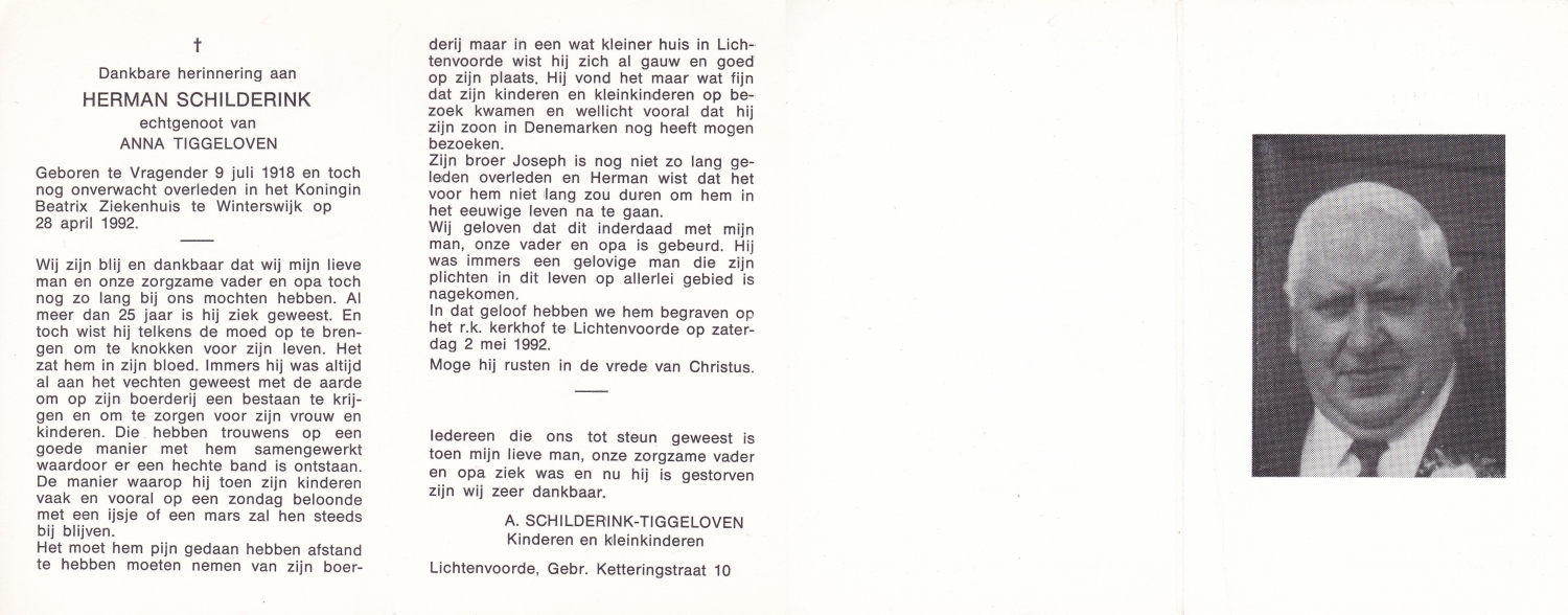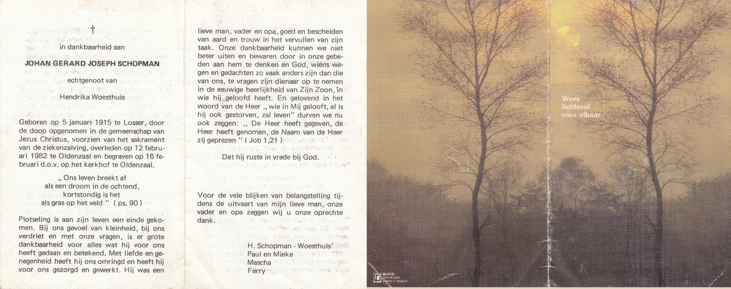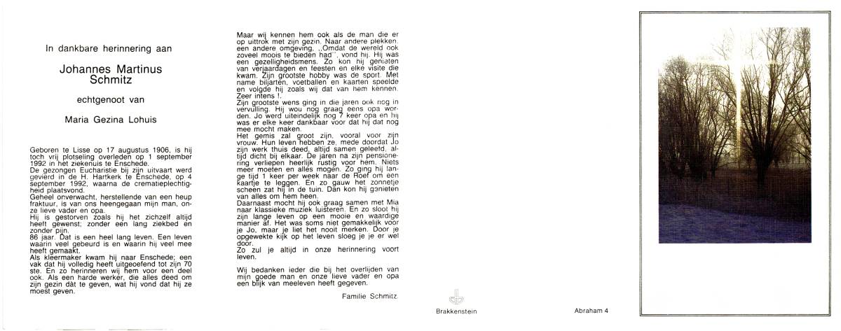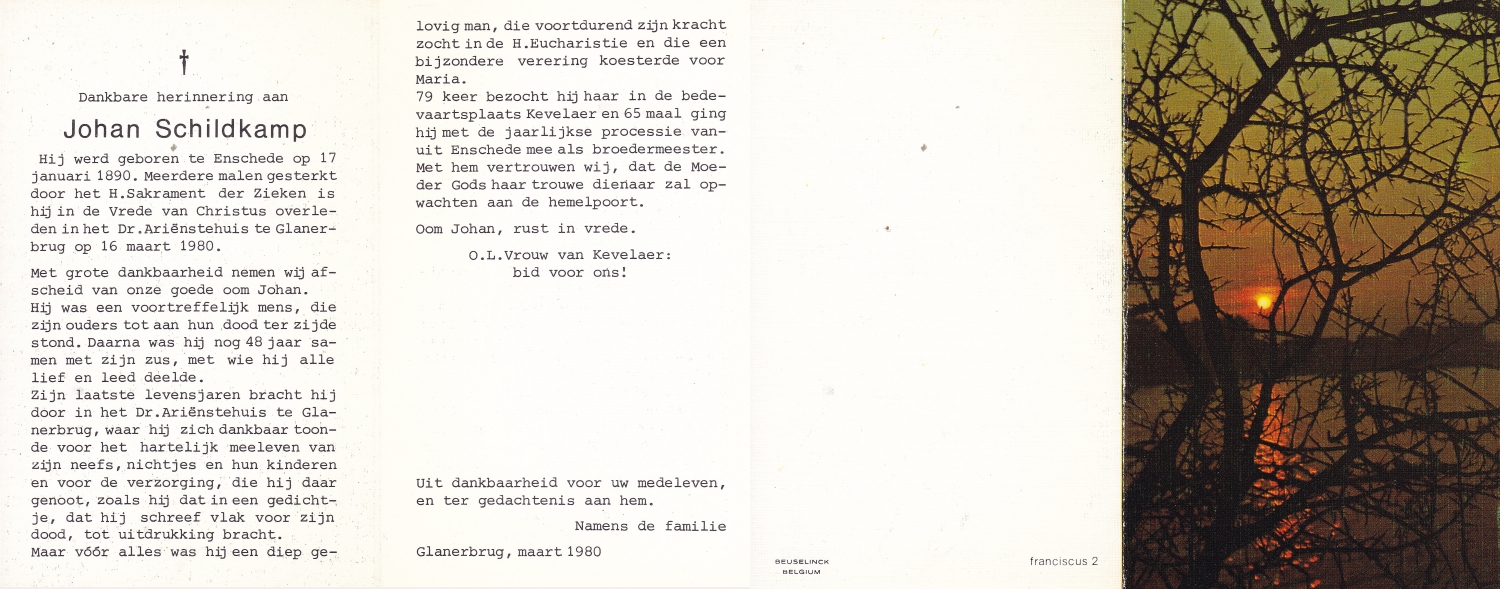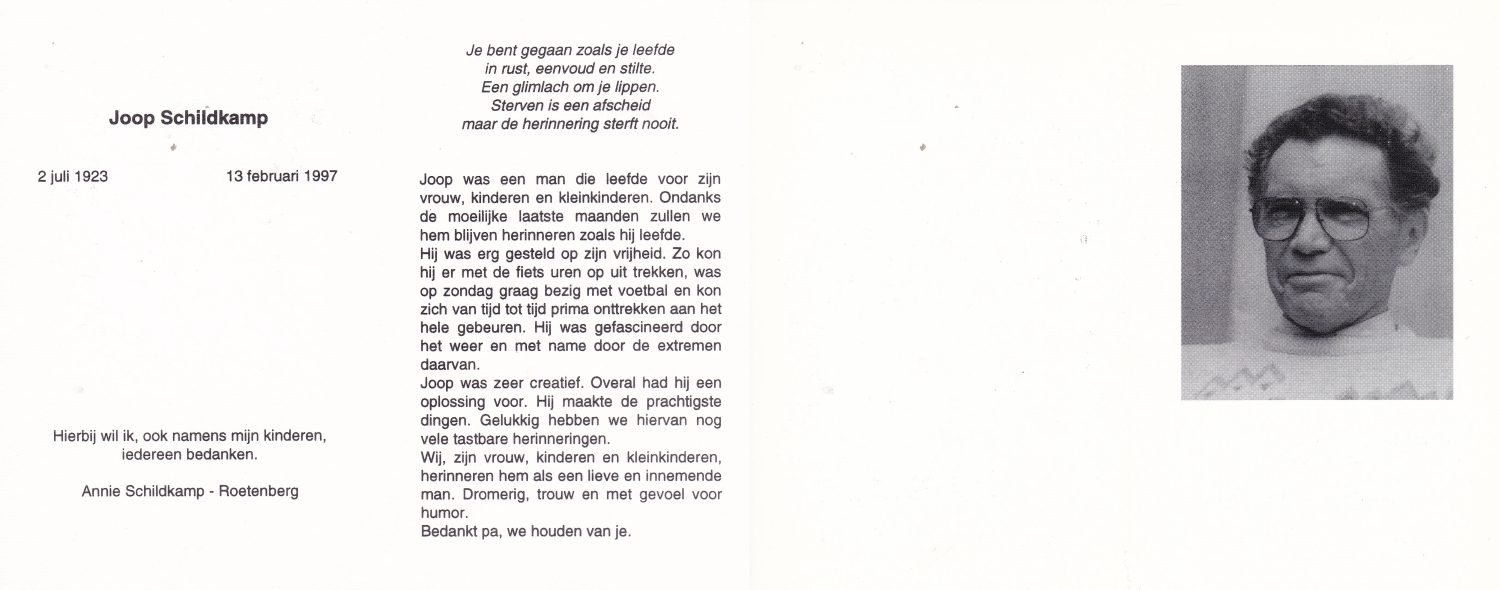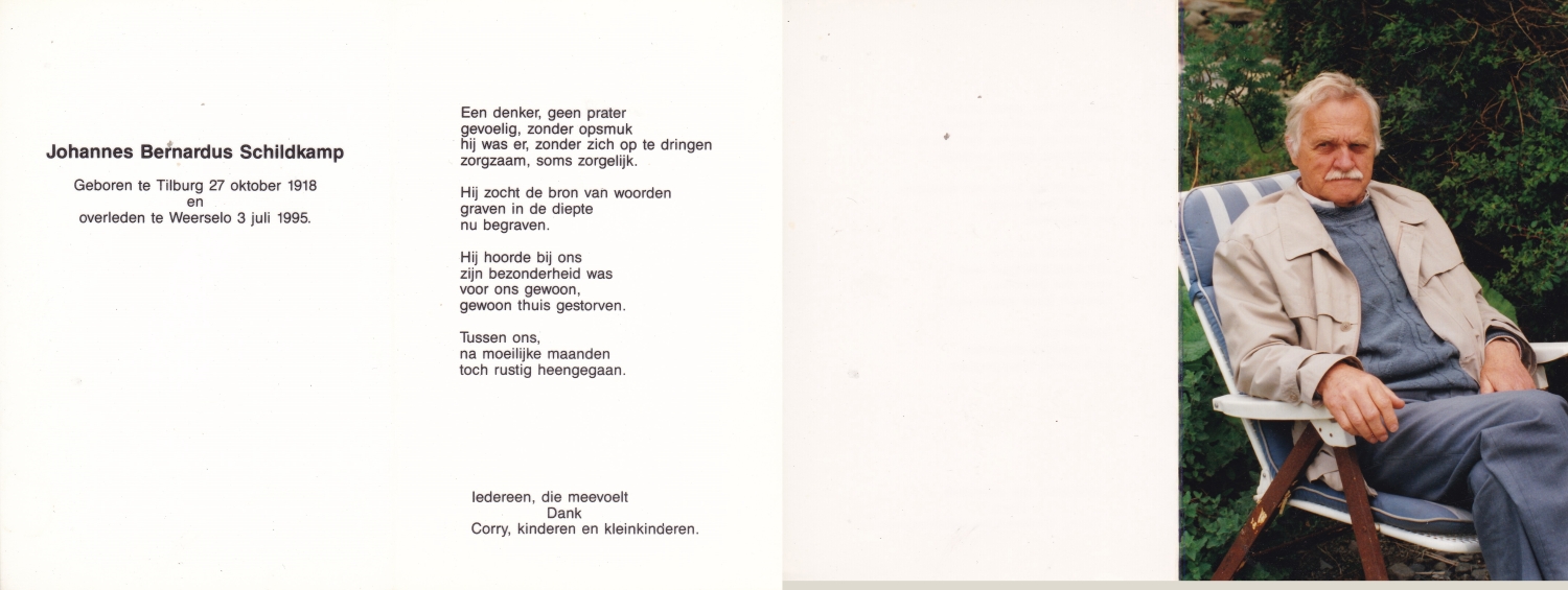 SCHILDKAMP, Johannes Jozef, geboren op 1-3-1913 te Lonneker, overleden op 1-3-1992 te Enschede op 79-jarige leeftijd, gecremeerd op 5-3-1992 te Usselo.