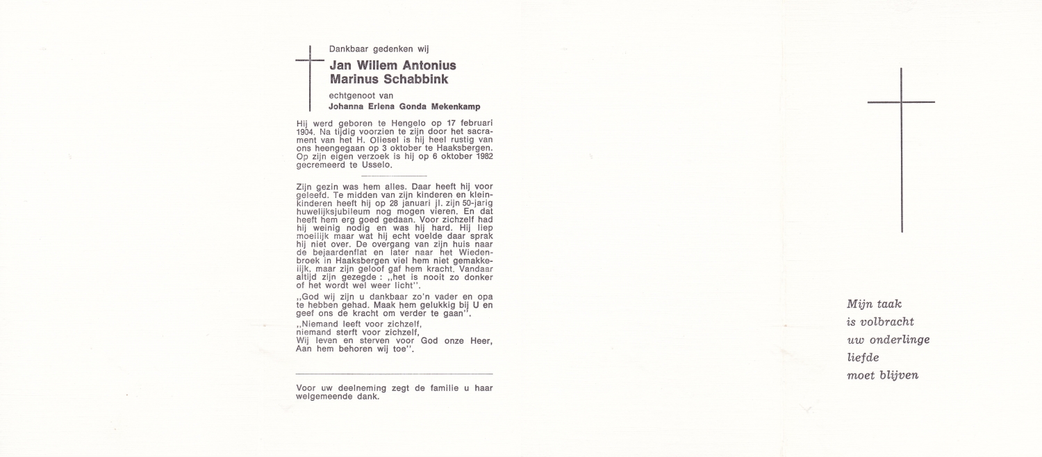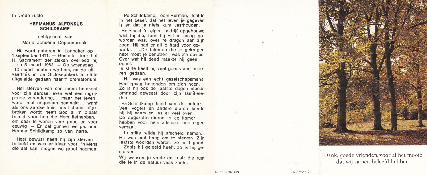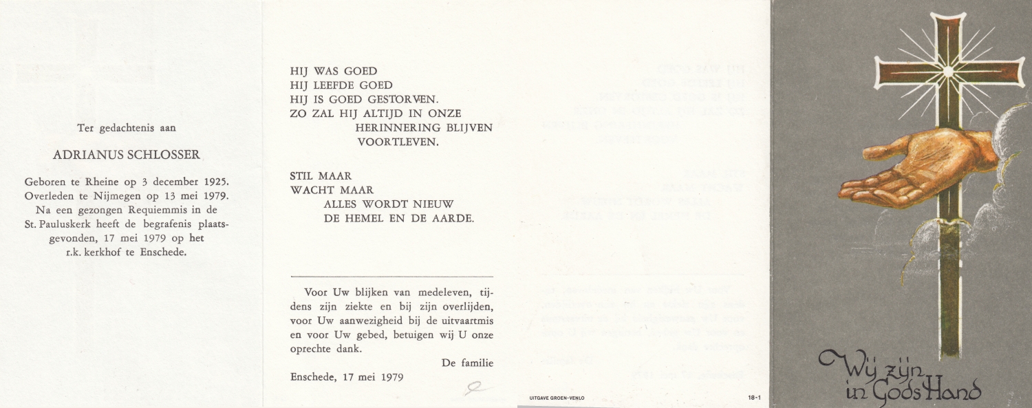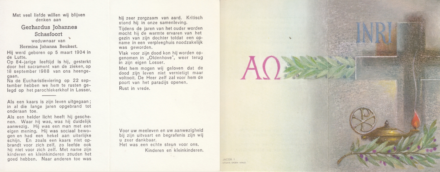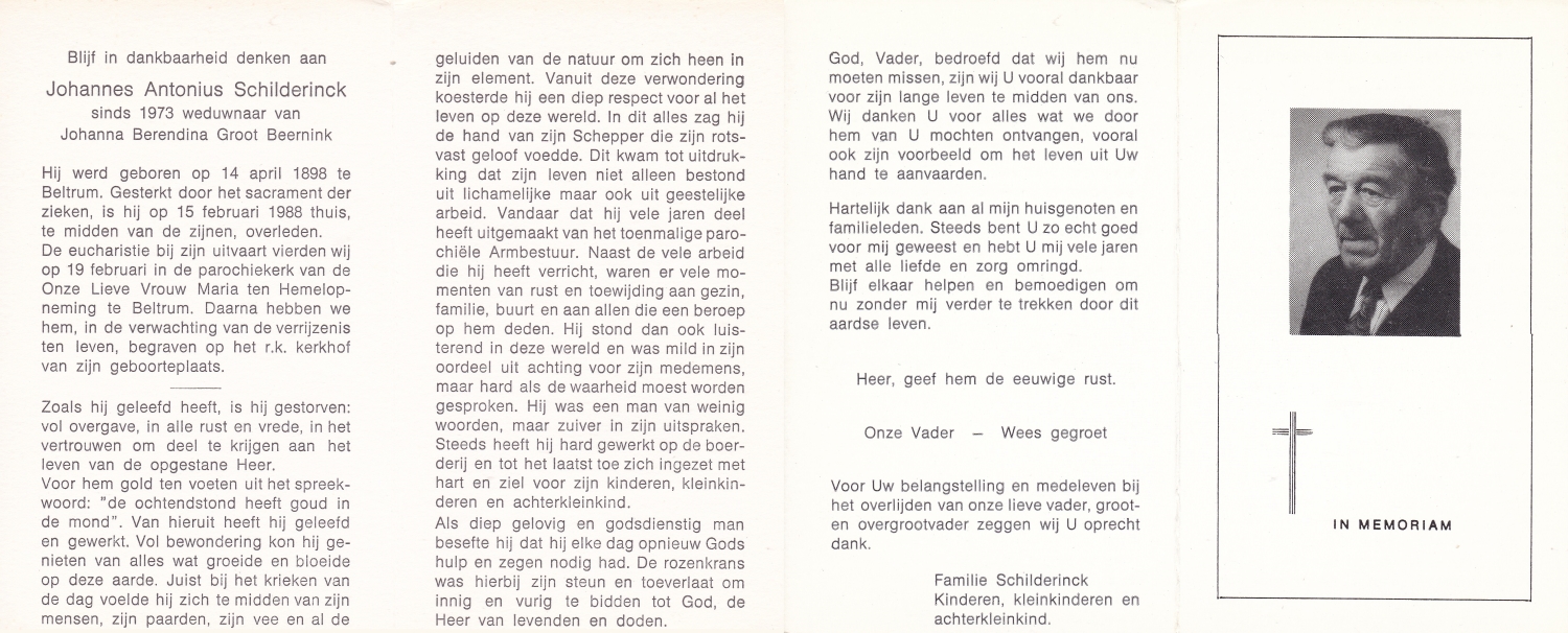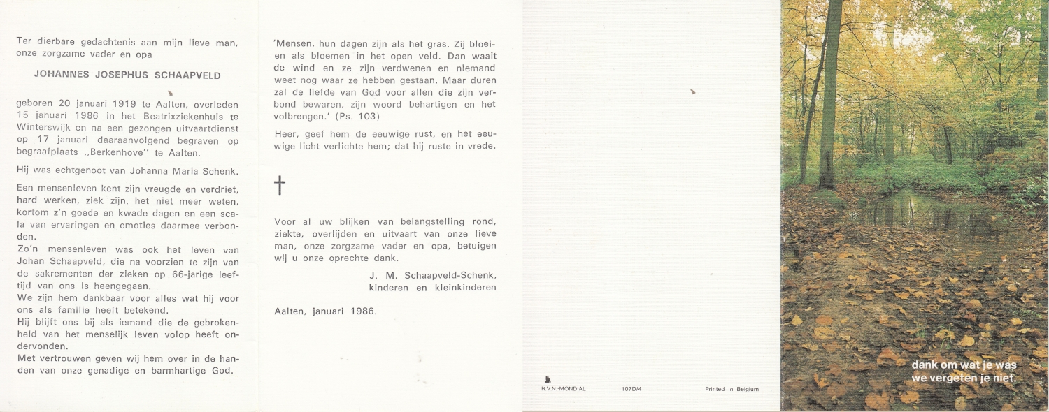 SCHILDKAMP, Johannes Jozef, geboren op 1-3-1913 te Lonneker, overleden op 1-3-1992 te Enschede op 79-jarige leeftijd, gecremeerd op 5-3-1992 te Usselo.
