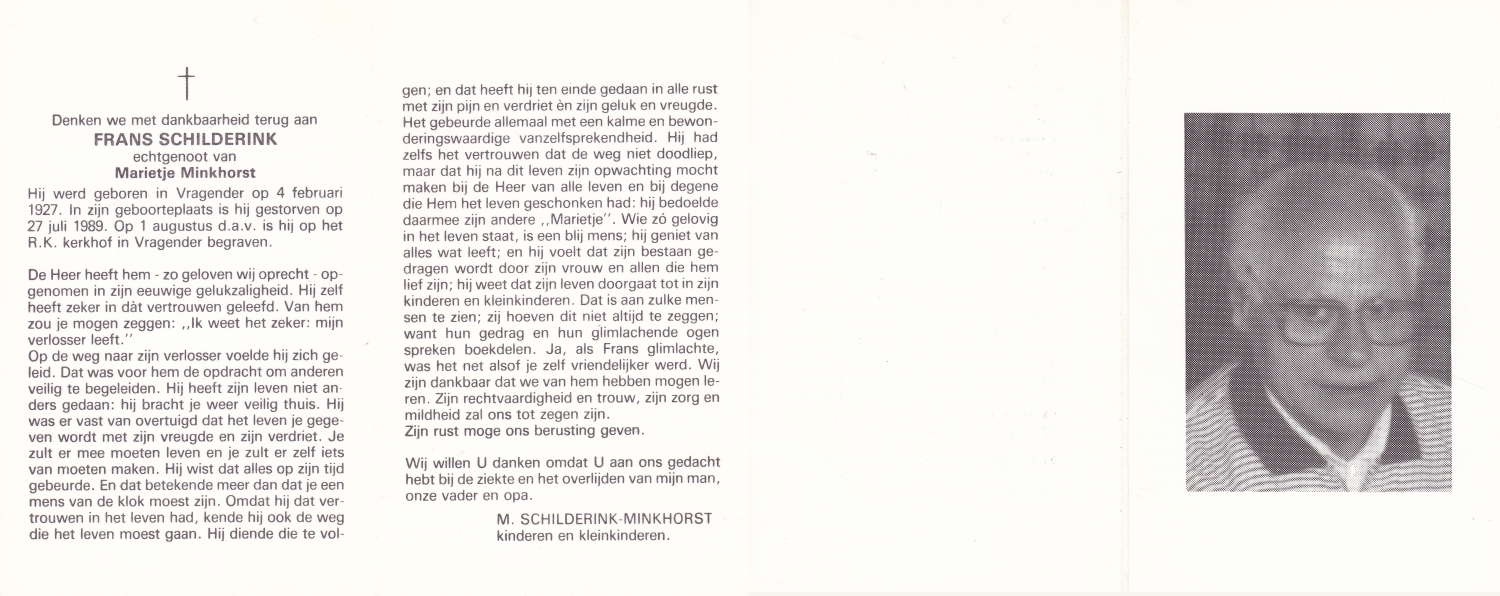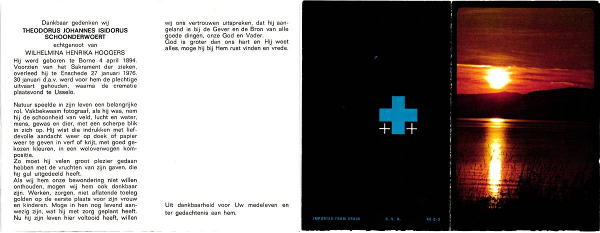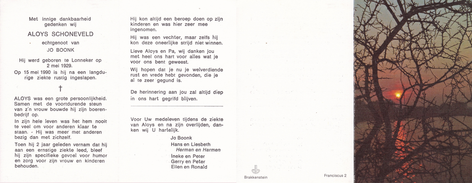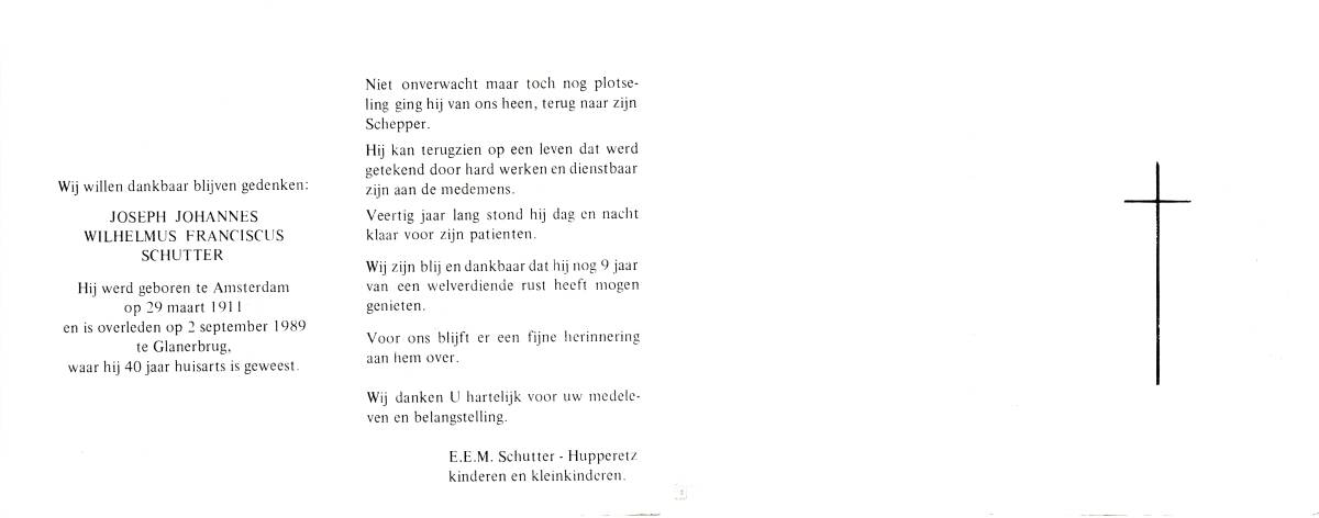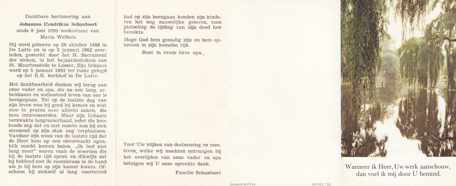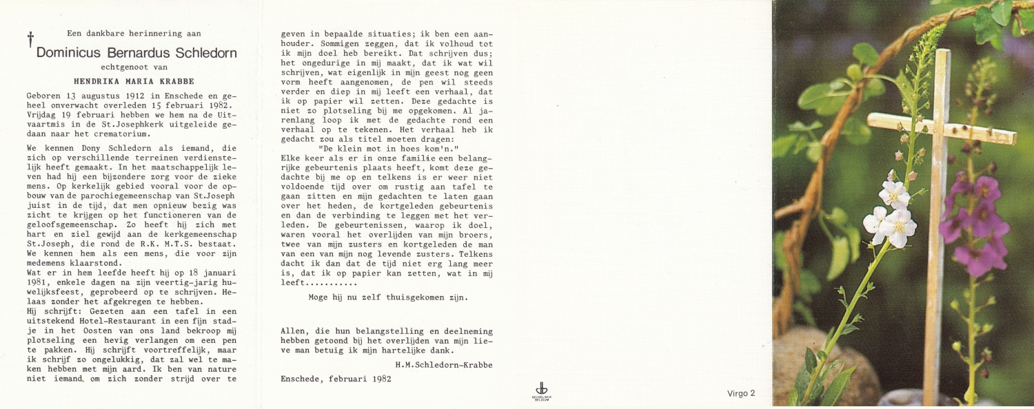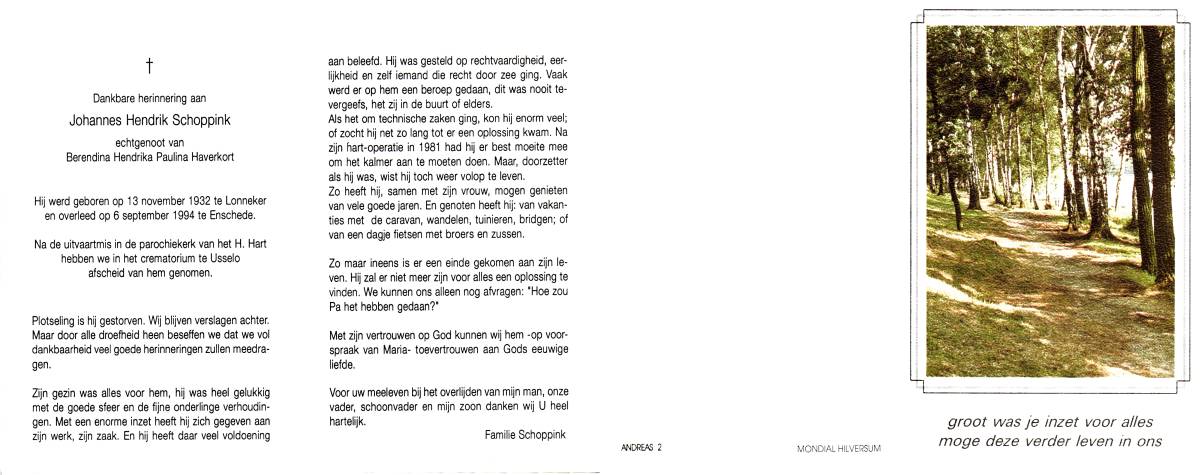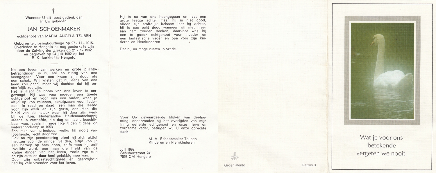 SCHILDKAMP, Johannes Jozef, geboren op 1-3-1913 te Lonneker, overleden op 1-3-1992 te Enschede op 79-jarige leeftijd, gecremeerd op 5-3-1992 te Usselo.