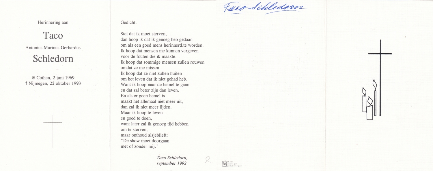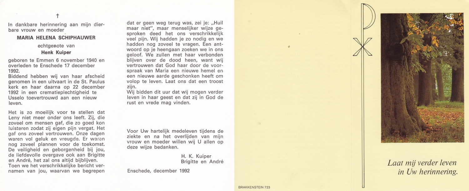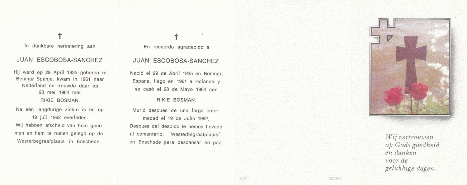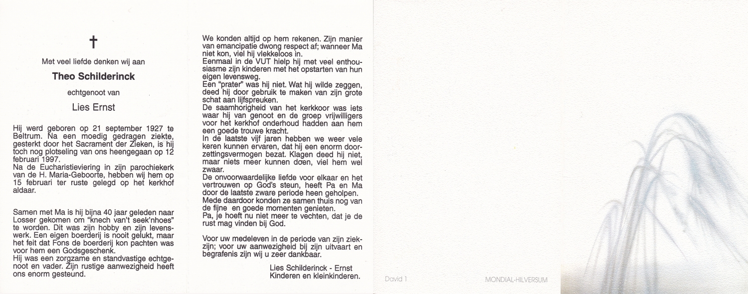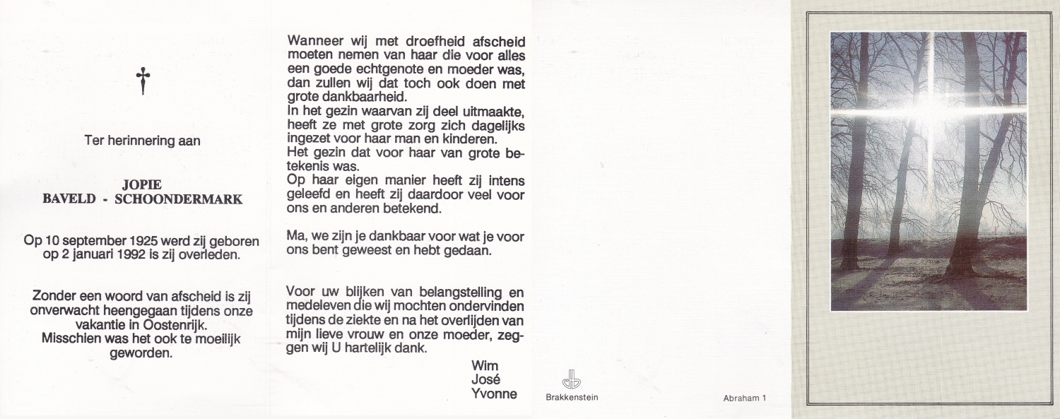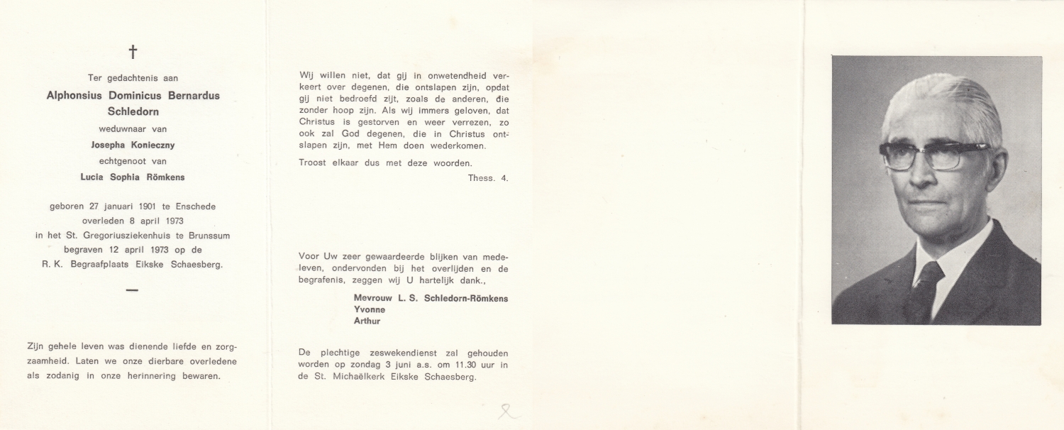 SCHILDKAMP, Johannes Jozef, geboren op 1-3-1913 te Lonneker, overleden op 1-3-1992 te Enschede op 79-jarige leeftijd, gecremeerd op 5-3-1992 te Usselo.
