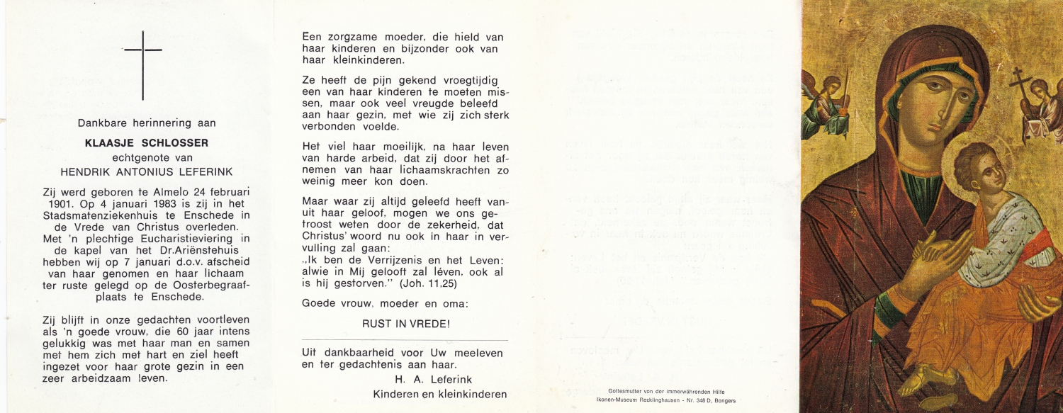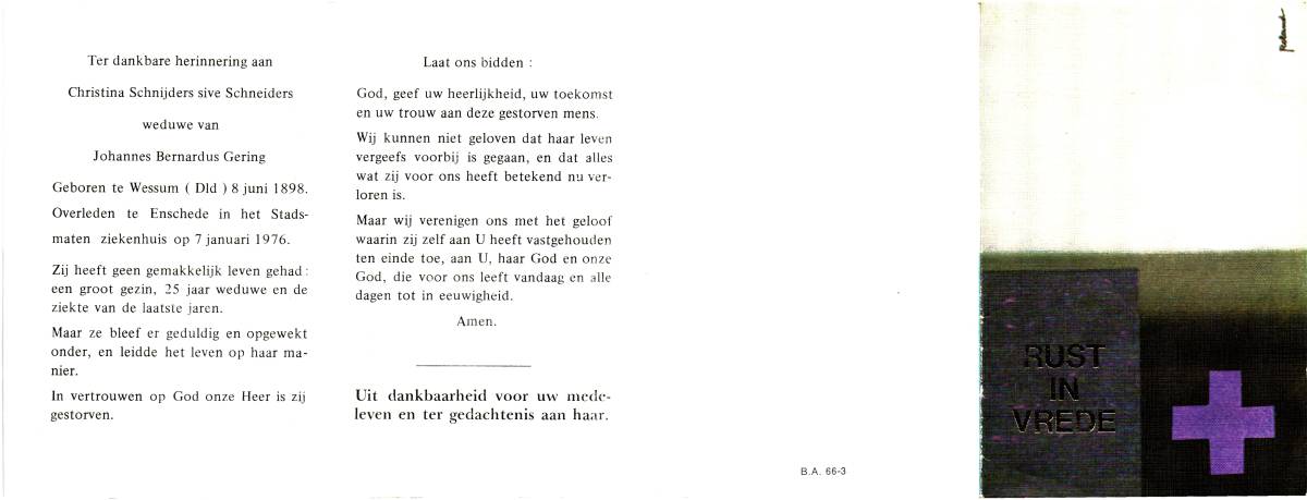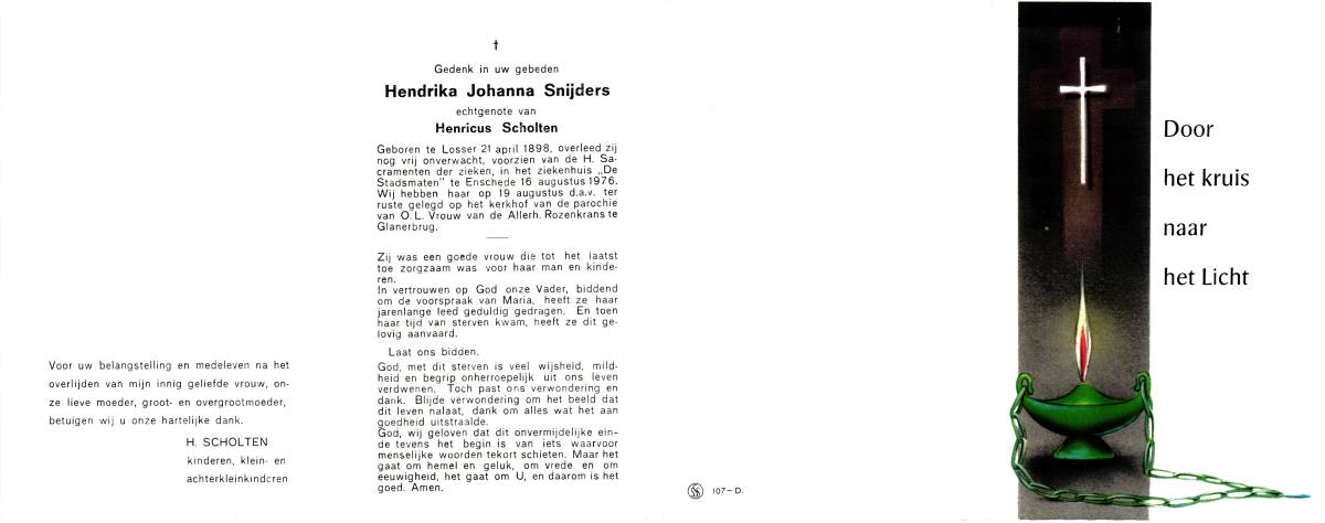 SNIJDERS, Hendrika Johanna, geboren op 21-04-1898 te Losser, overleden op 16-8-1976 te Enschede, ziekenhuis op 78-jarige leeftijd, begraven op 19-8-1976 te Glanerbrug.