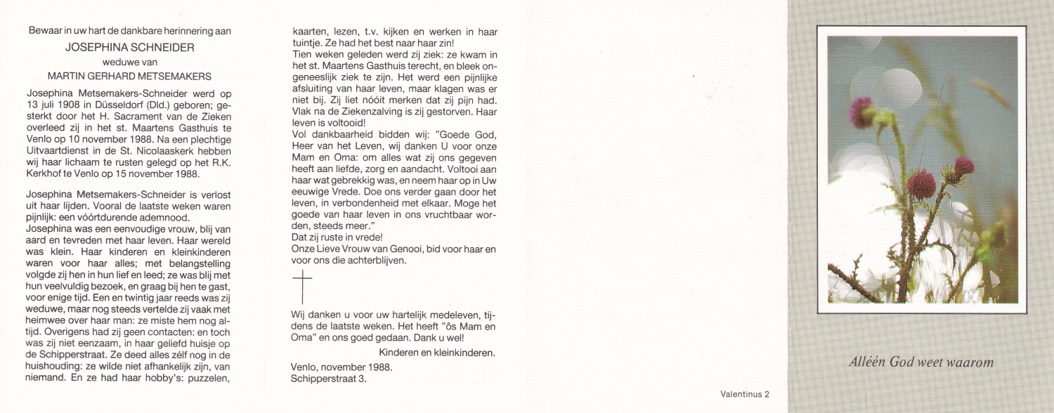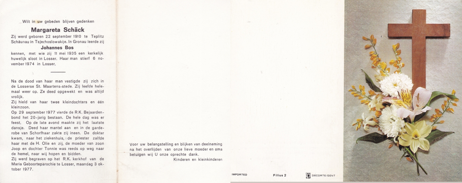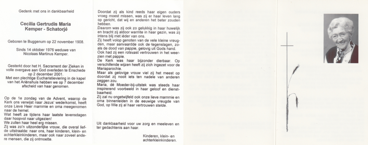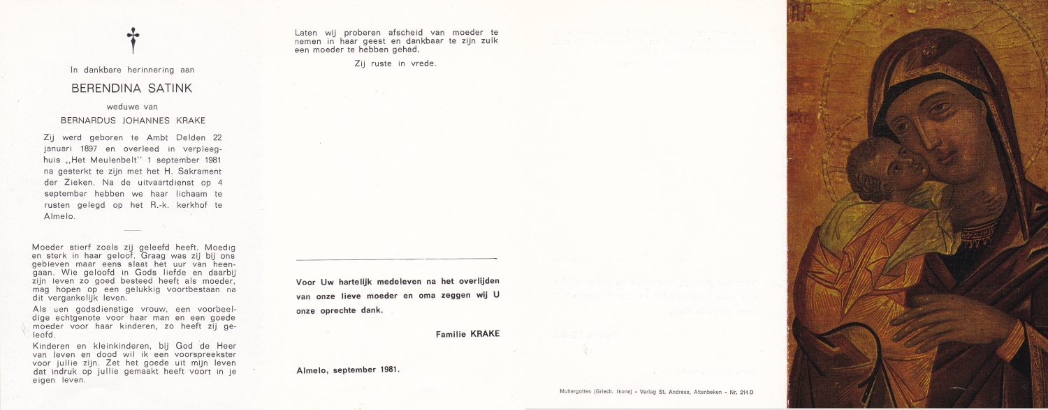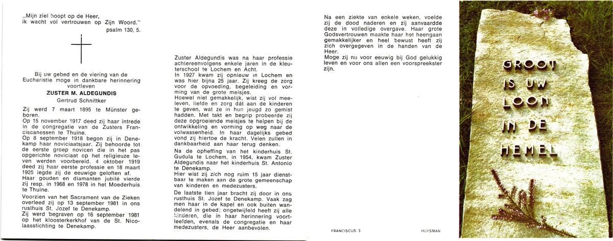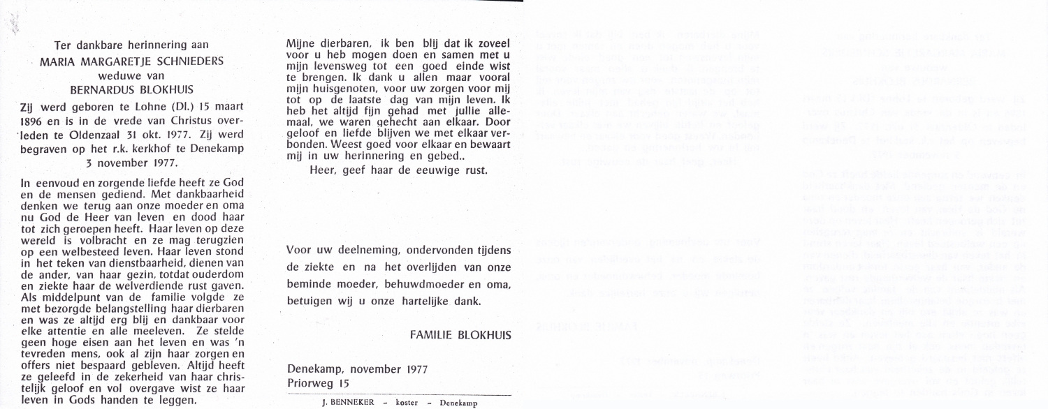 SCHNITTKER, Gertrud, geboren op 07-03-1895 te Munster, Dld, overleden op 13-9-1981 te Denekamp op 86-jarige leeftijd, begraven op 16-9-1981 te Denekamp.