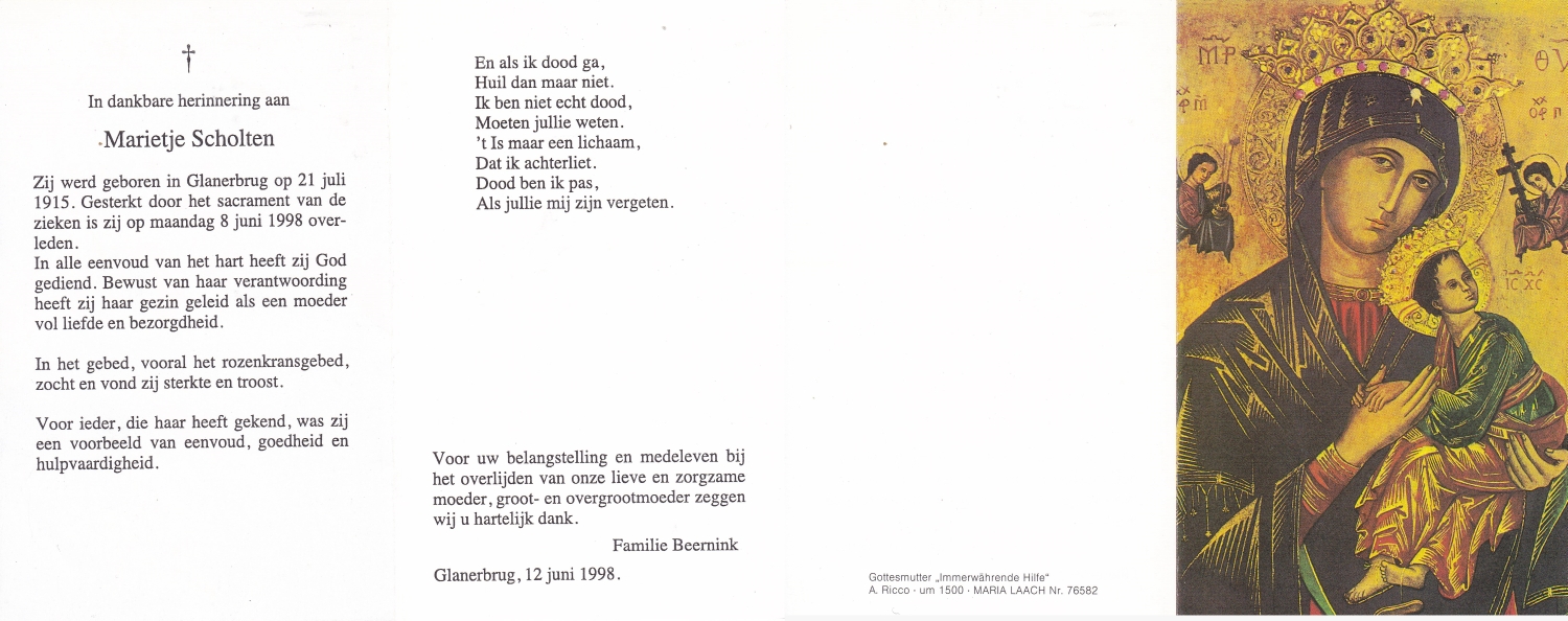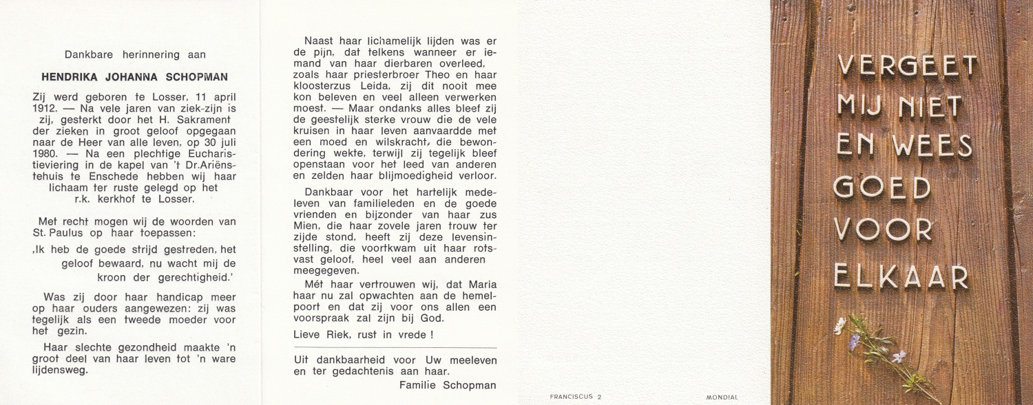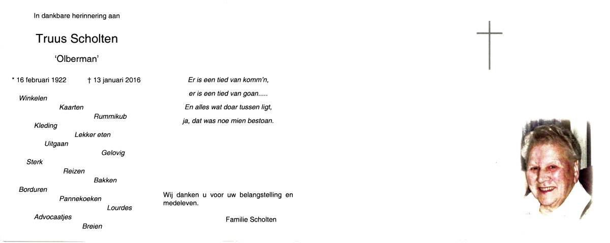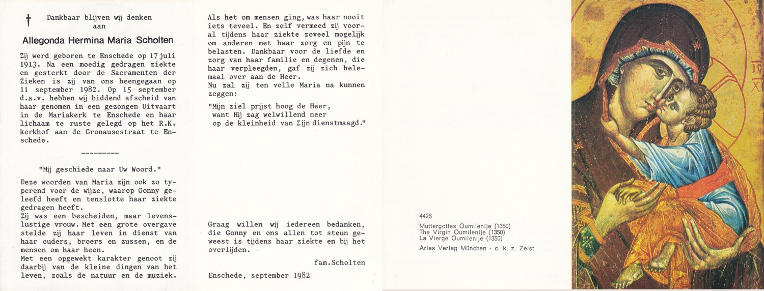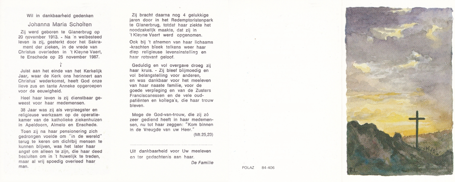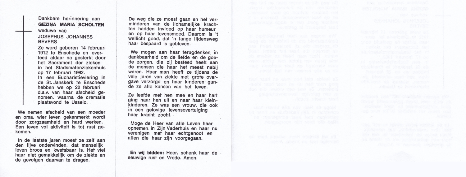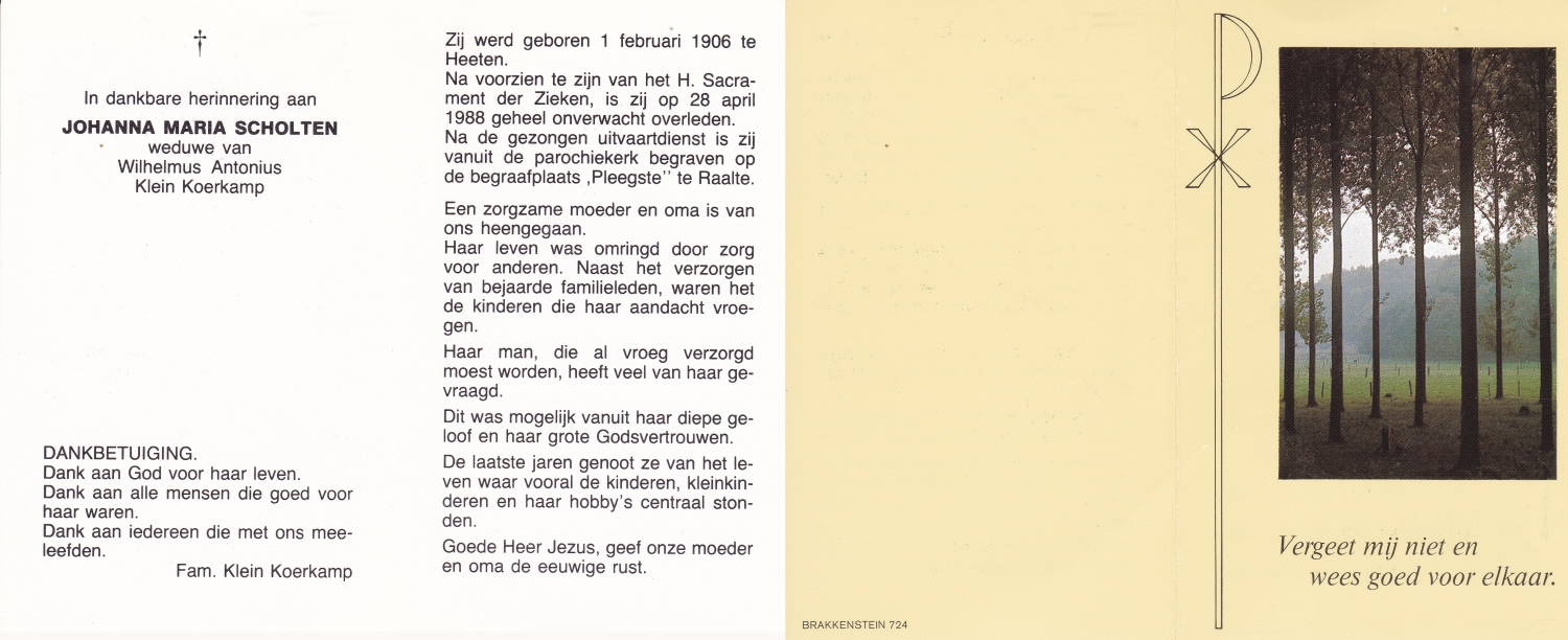 SCHOLTEN, Johanna Maria, geboren op 10-7-1913 te Tilligte, overleden op 13-12-1983 te Ootmarsum op 70-jarige leeftijd, begraven op 16-12-1983 te Ootmarsum.