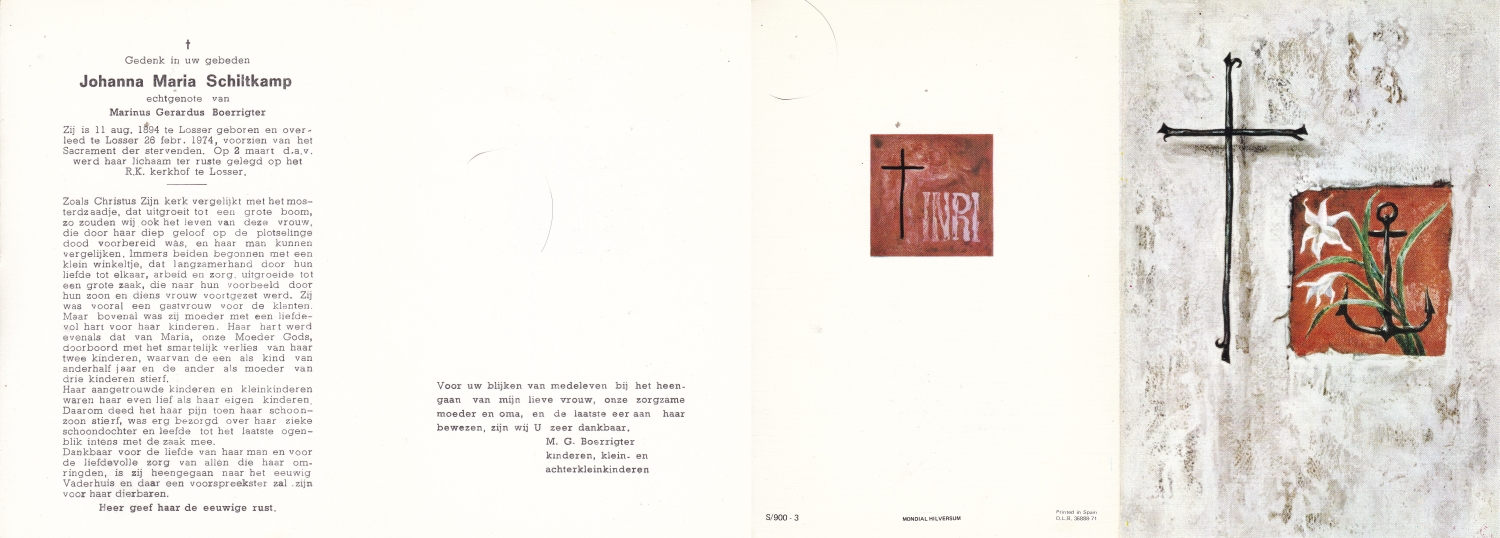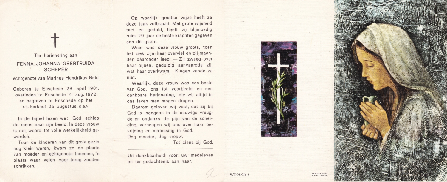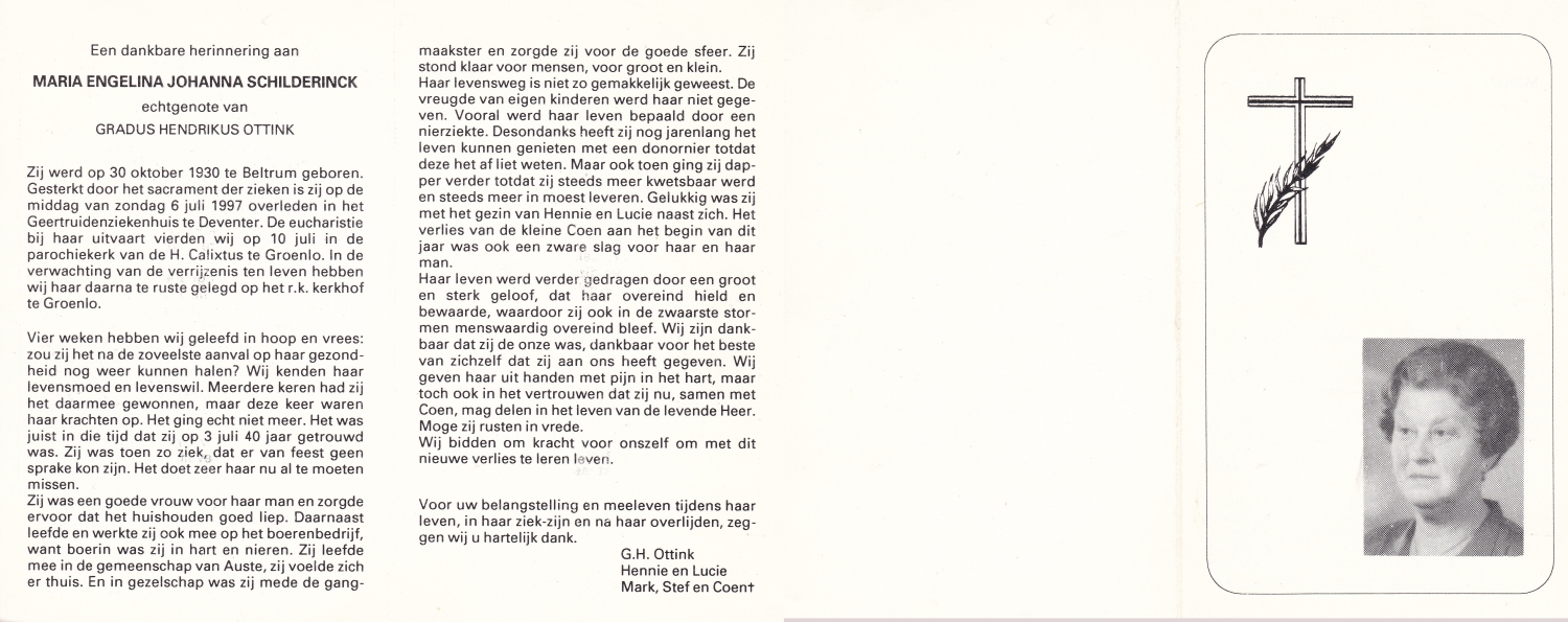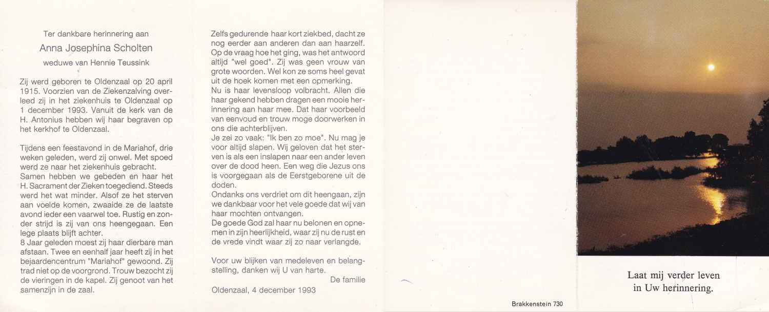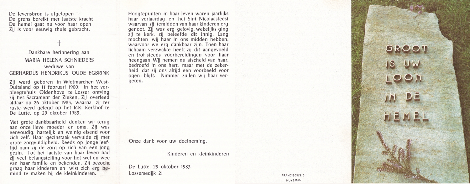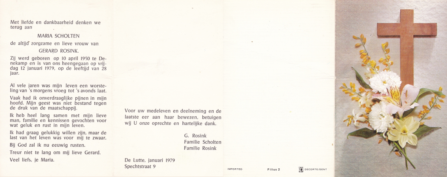 SCHOLTEN, Johanna Maria, geboren op 10-7-1913 te Tilligte, overleden op 13-12-1983 te Ootmarsum op 70-jarige leeftijd, begraven op 16-12-1983 te Ootmarsum.