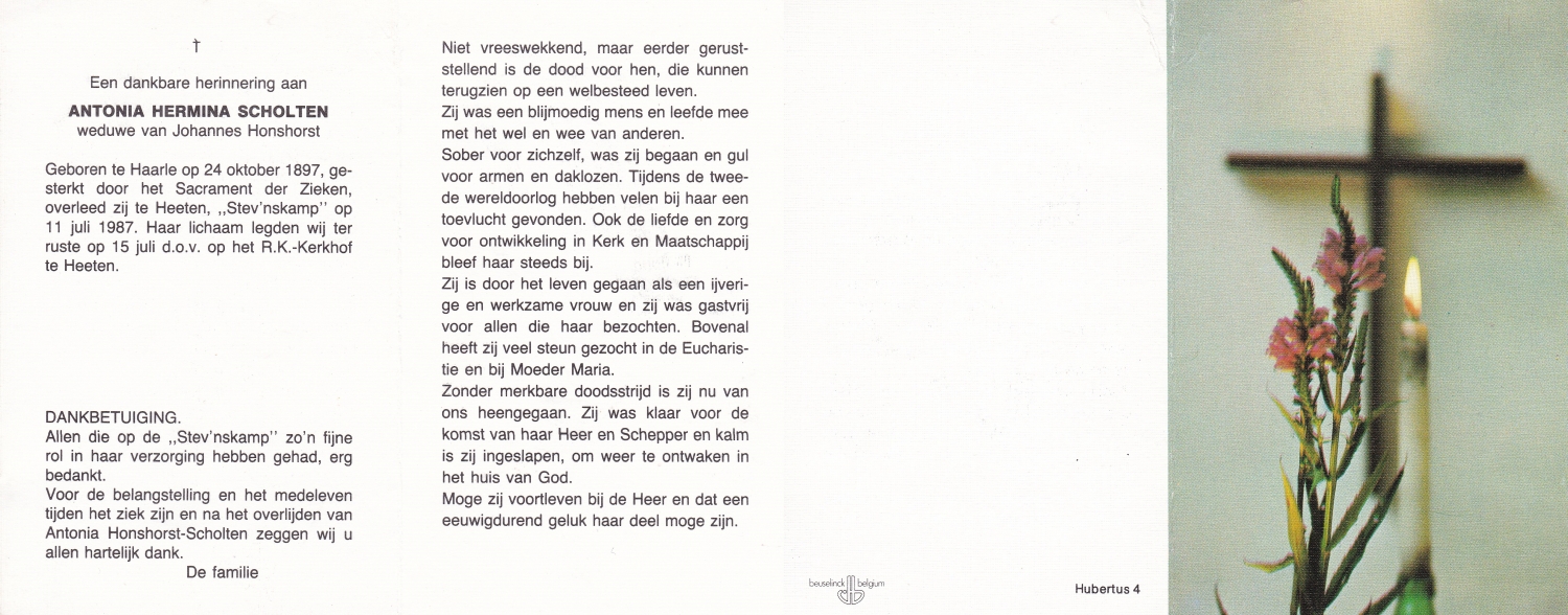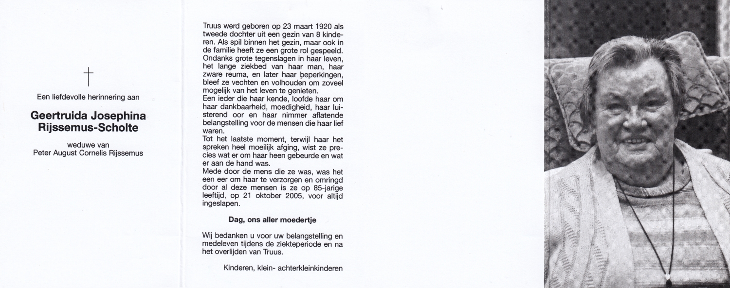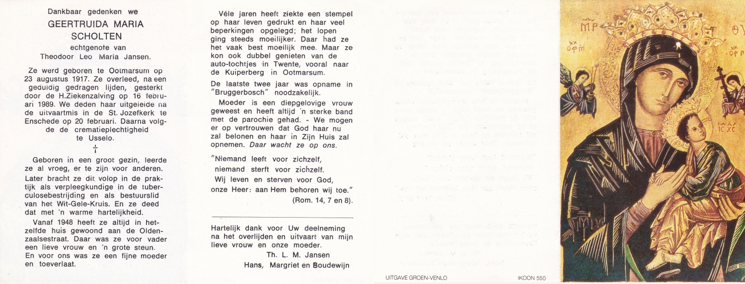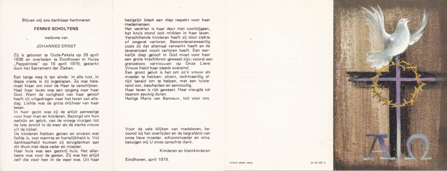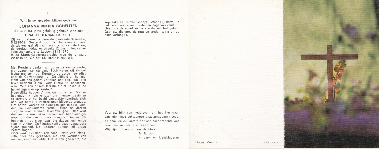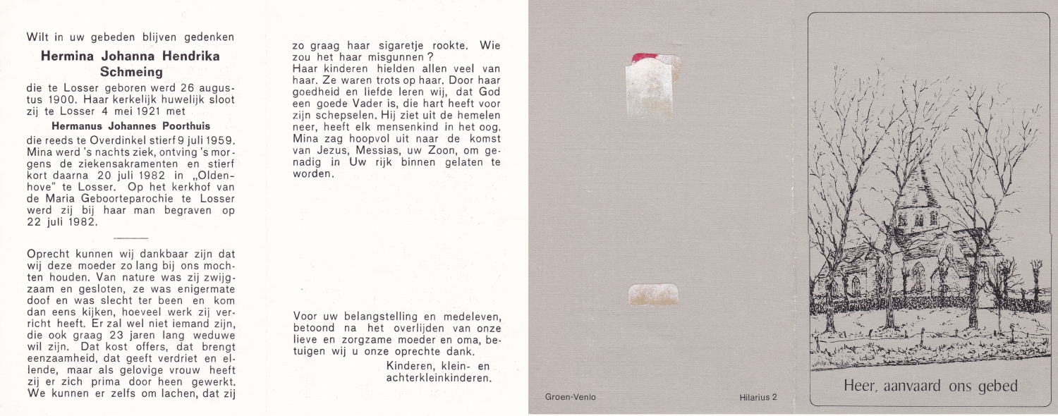SCHOLTEN, Johanna Maria, geboren op 10-7-1913 te Tilligte, overleden op 13-12-1983 te Ootmarsum op 70-jarige leeftijd, begraven op 16-12-1983 te Ootmarsum.