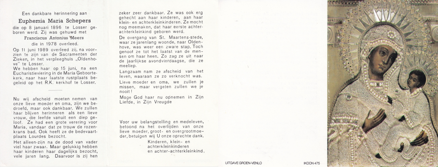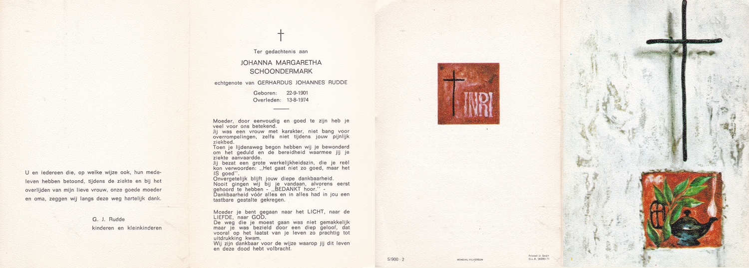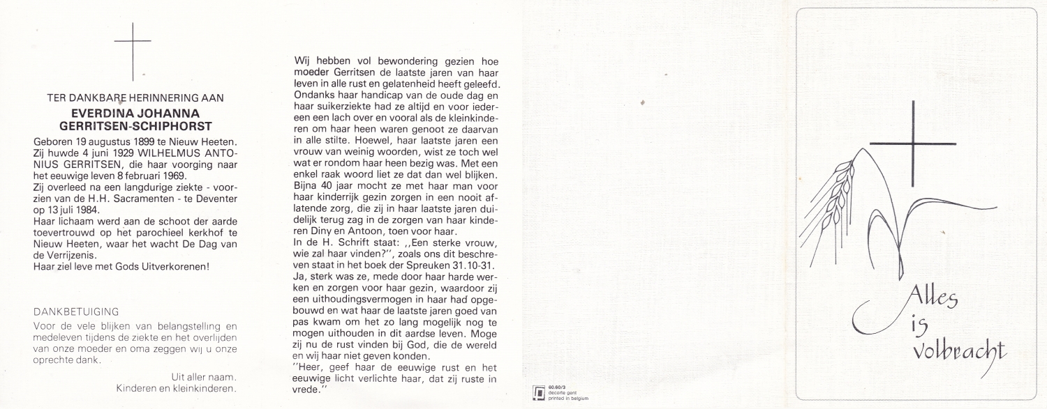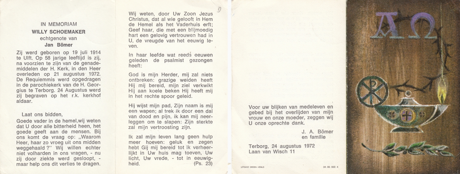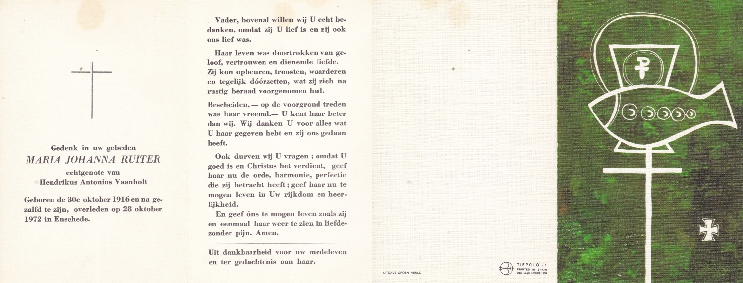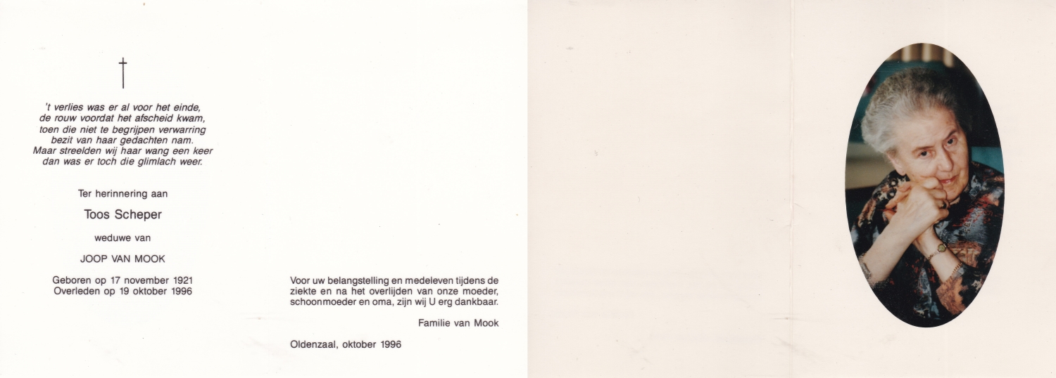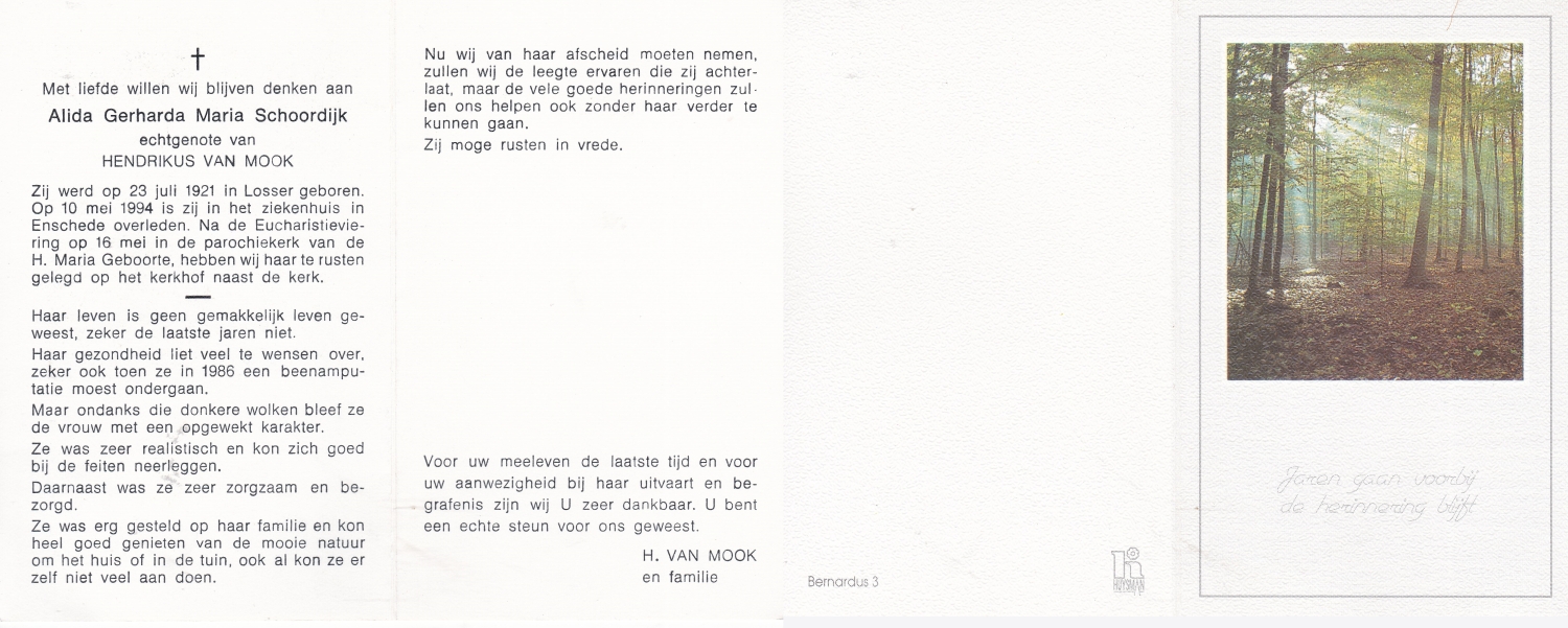 SCHOLTEN, Johanna Maria, geboren op 10-7-1913 te Tilligte, overleden op 13-12-1983 te Ootmarsum op 70-jarige leeftijd, begraven op 16-12-1983 te Ootmarsum.