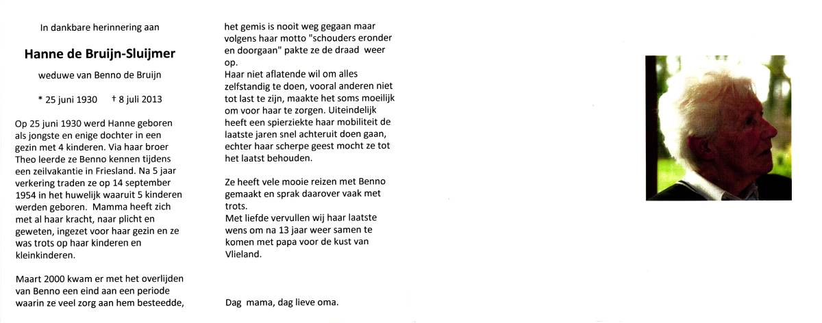 SLUIJMER, Hanne, geboren op 25-6-1930, overleden op 8-7-2013 op 83-jarige leeftijd.
