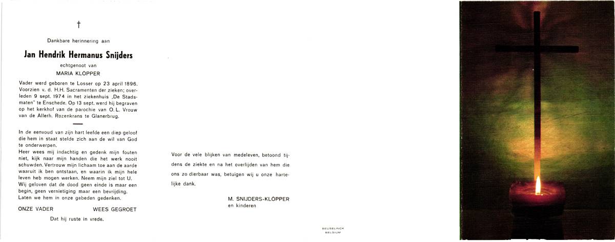 SNIJDERS, Jan Hendrik Hermanus, geboren op 23-04-1896 te Losser, overleden op 9-9-1974 te Enschede, ziekenhuis op 78-jarige leeftijd, begraven op 13-9-1974 te Glanerbrug.