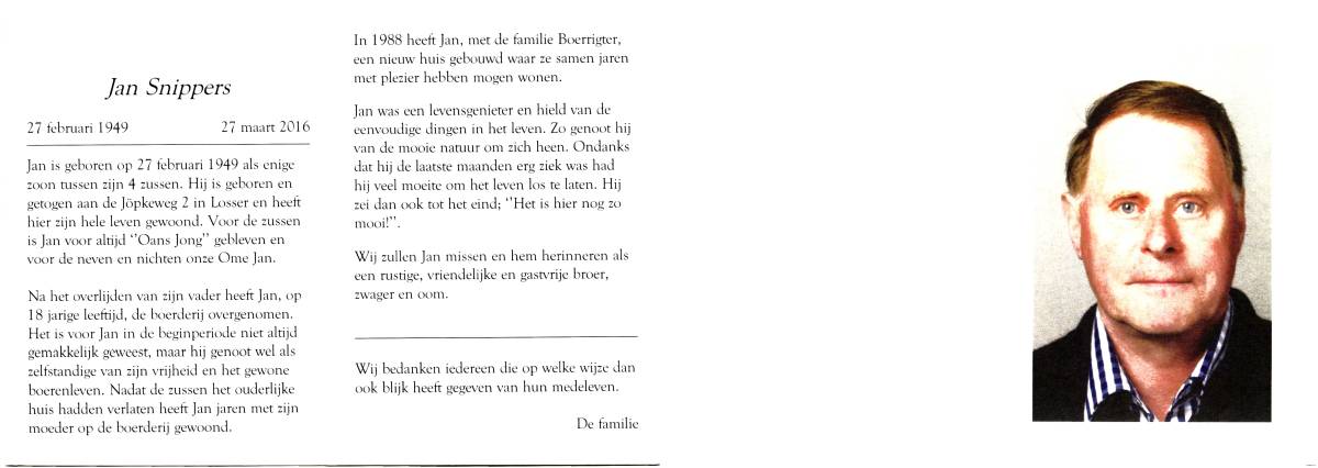 SNIPPERS, Jan, geboren op 27-2-1949 te Losser, overleden op 27-3-2016 op 67-jarige leeftijd.