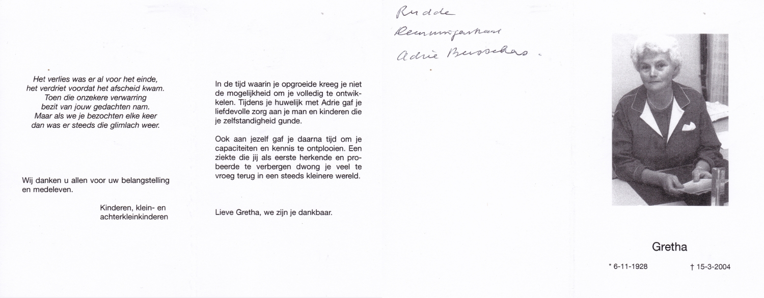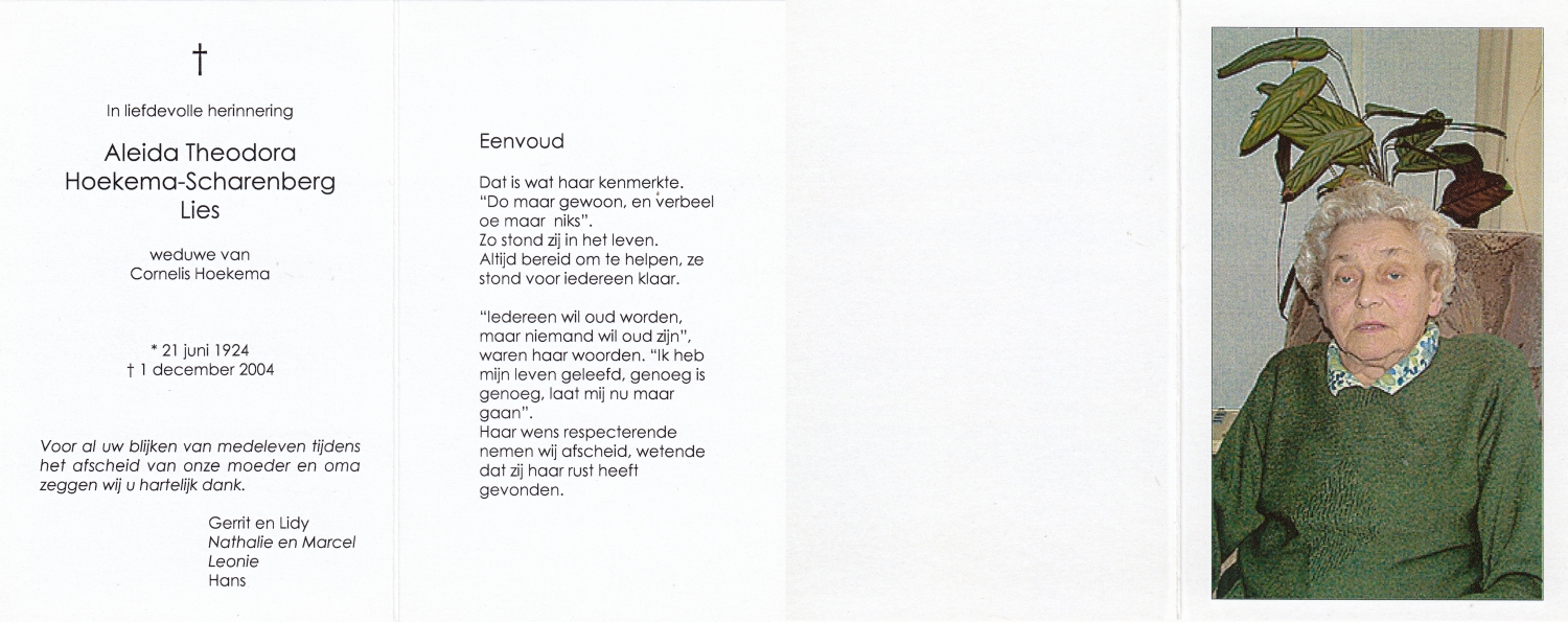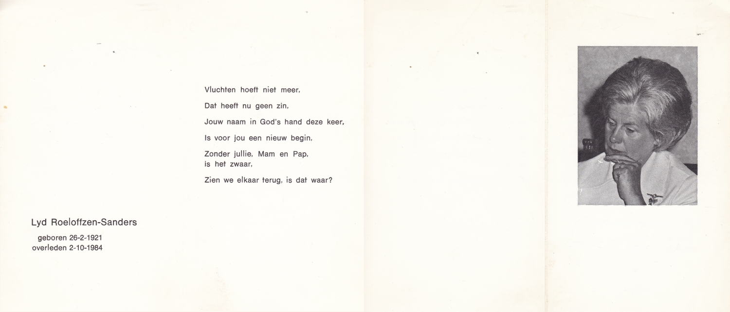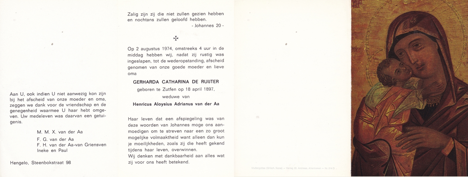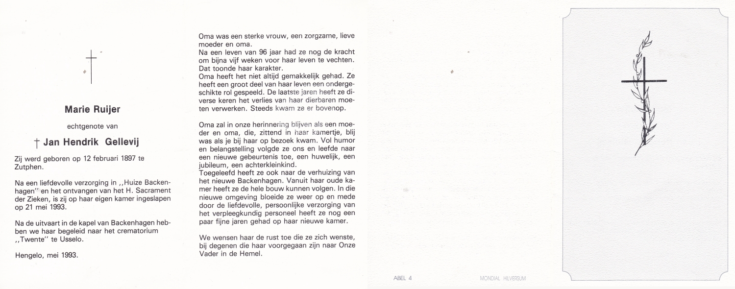 RUIGROK van der WERVEN, Elisabeth Adriana, geboren op 16-12-1910 te Haarlem, overleden op 11-12-1990 te Enschede op 79-jarige leeftijd, begraven op 14-12-1990 te Enschede.