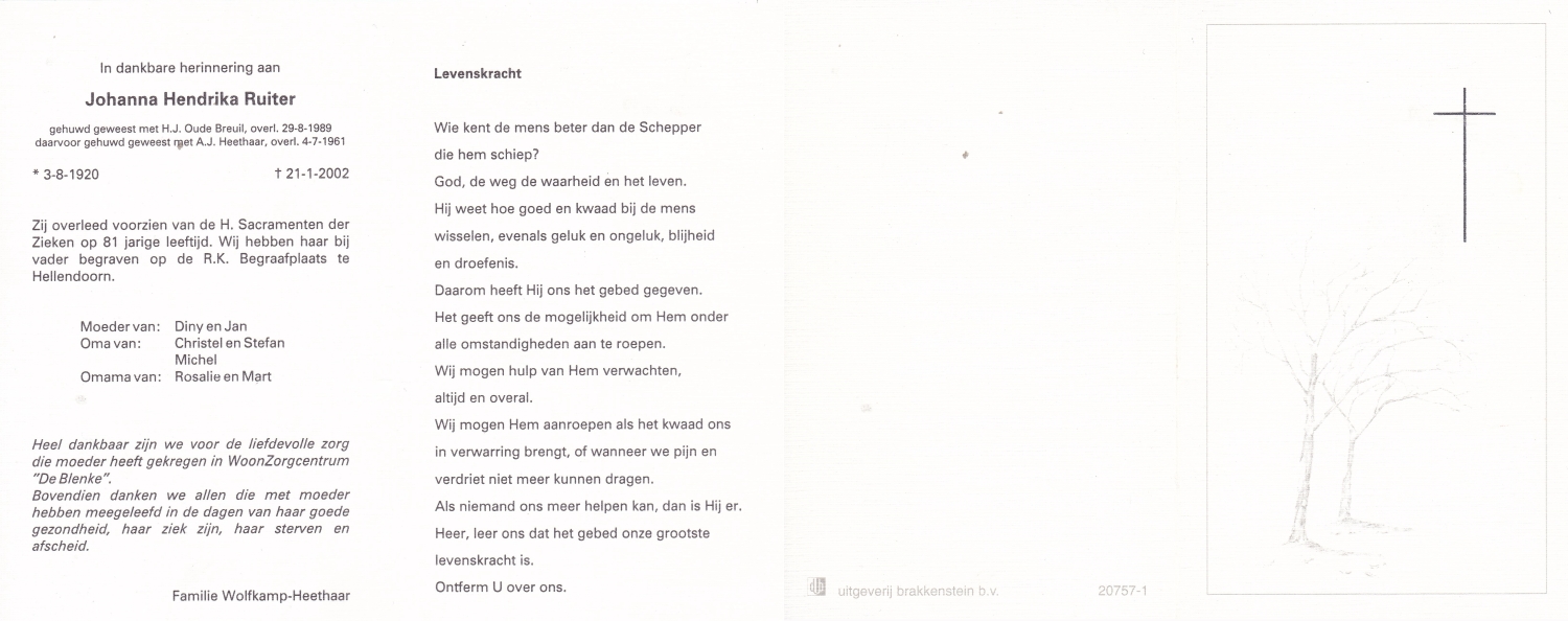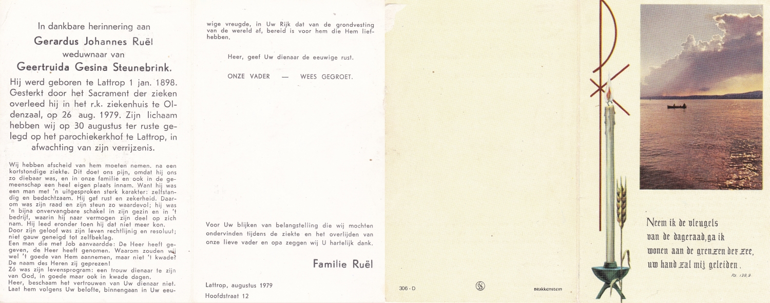 RUEL, Johanna Maria, geboren op 27-11-1918 te Lattrop, overleden op 29-11-2002 te Enschede, ziekenhuis op 84-jarige leeftijd, begraven op 3-12-2002 te Noord Deurningen.