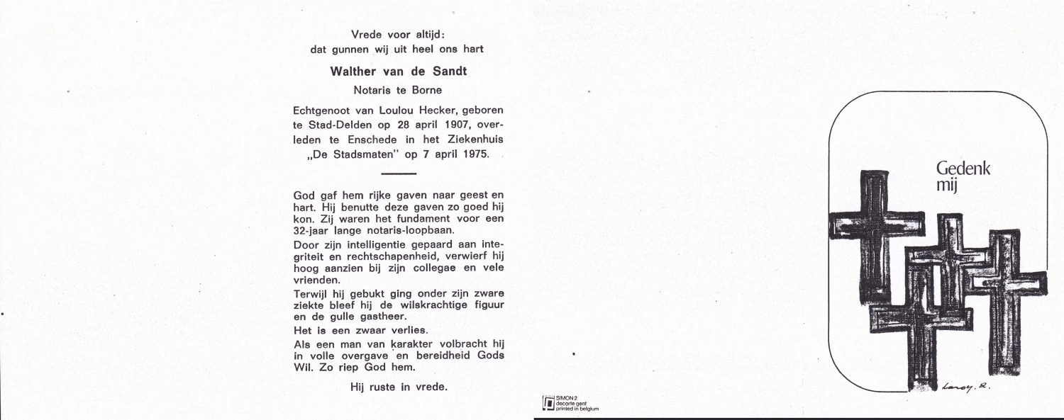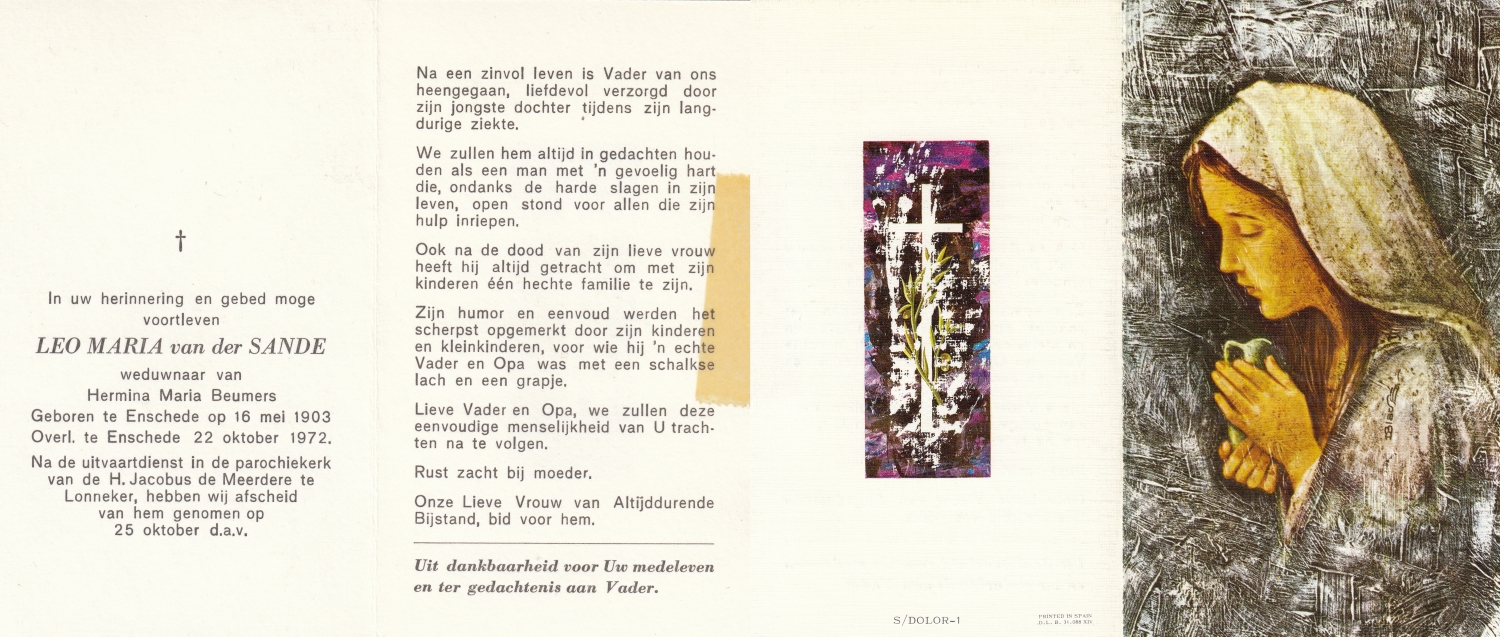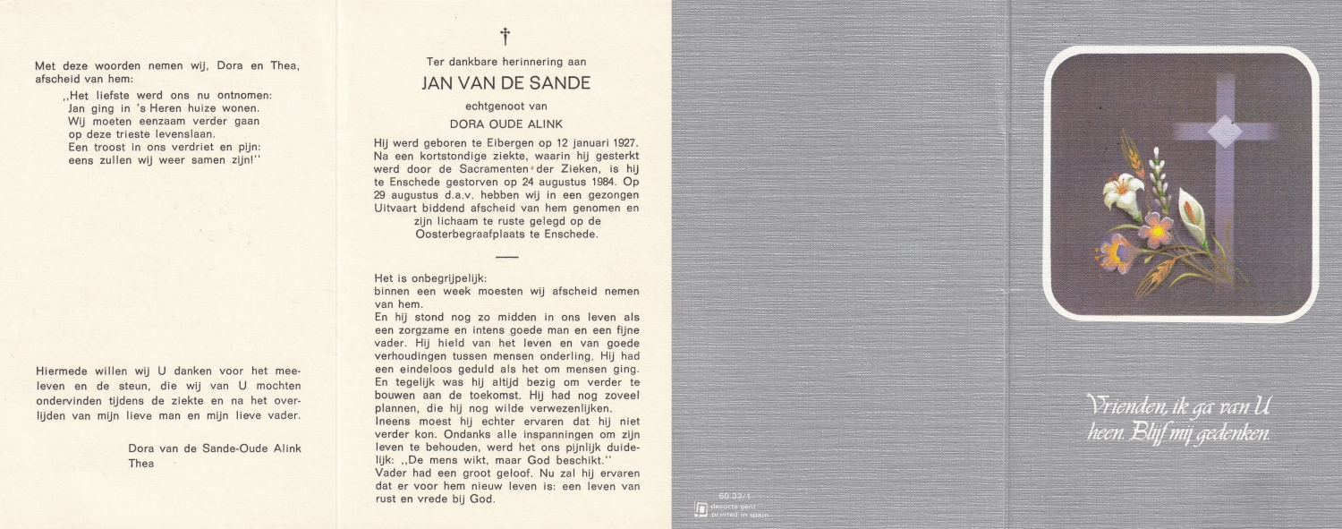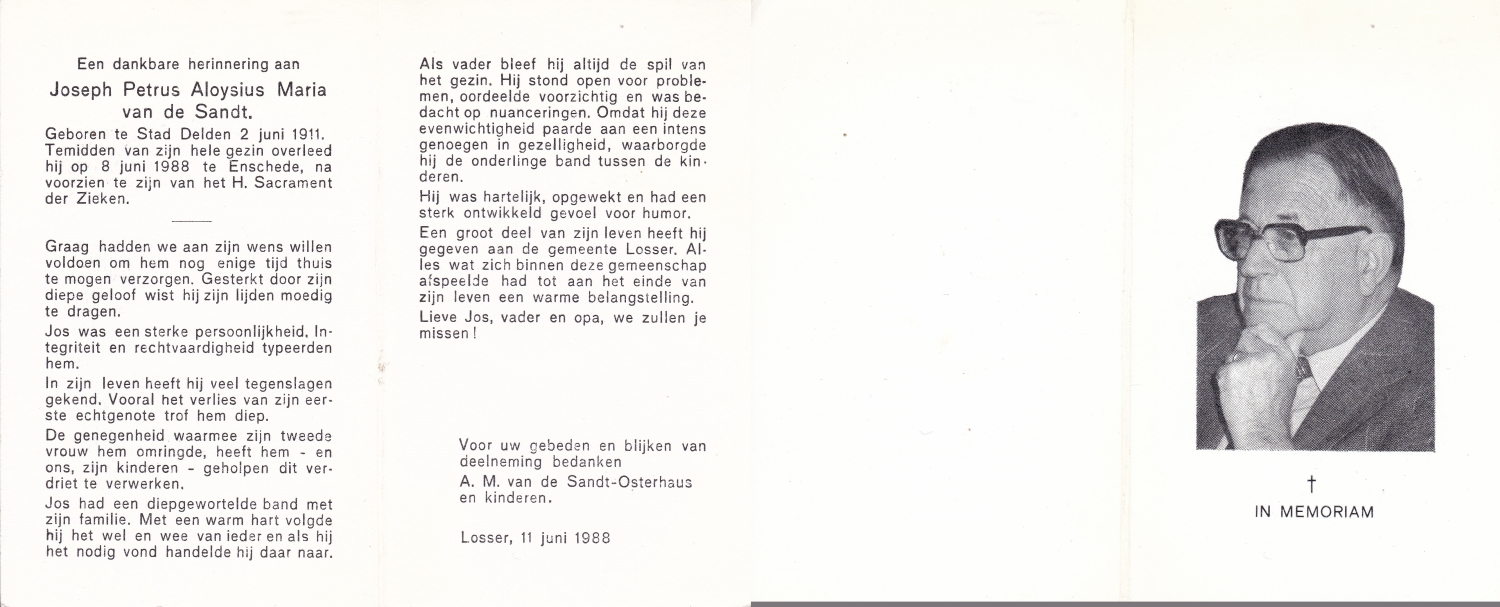 SANDE, van der, Antonius Joseph, geboren op 24-3-1905 te Enschede, overleden op 27-3-1987 te Enschede op 82-jarige leeftijd, gecremeerd op 31-3-1987 te Usselo.