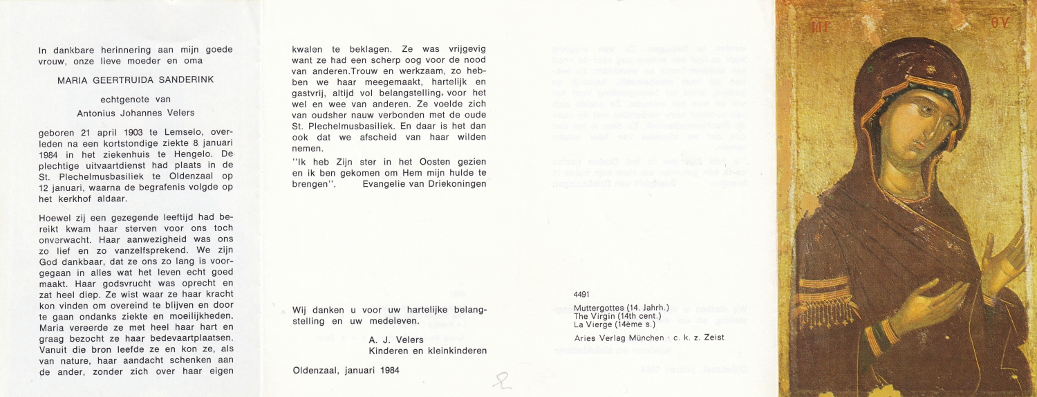 SANDERINK, Maria Anna Elisabeth, geboren op 19-2-1900 te Losser, overleden op 7-9-1975 te Hengelo, ziekenhuis op 75-jarige leeftijd, gecremeerd op 11-9-1975 te Usselo.