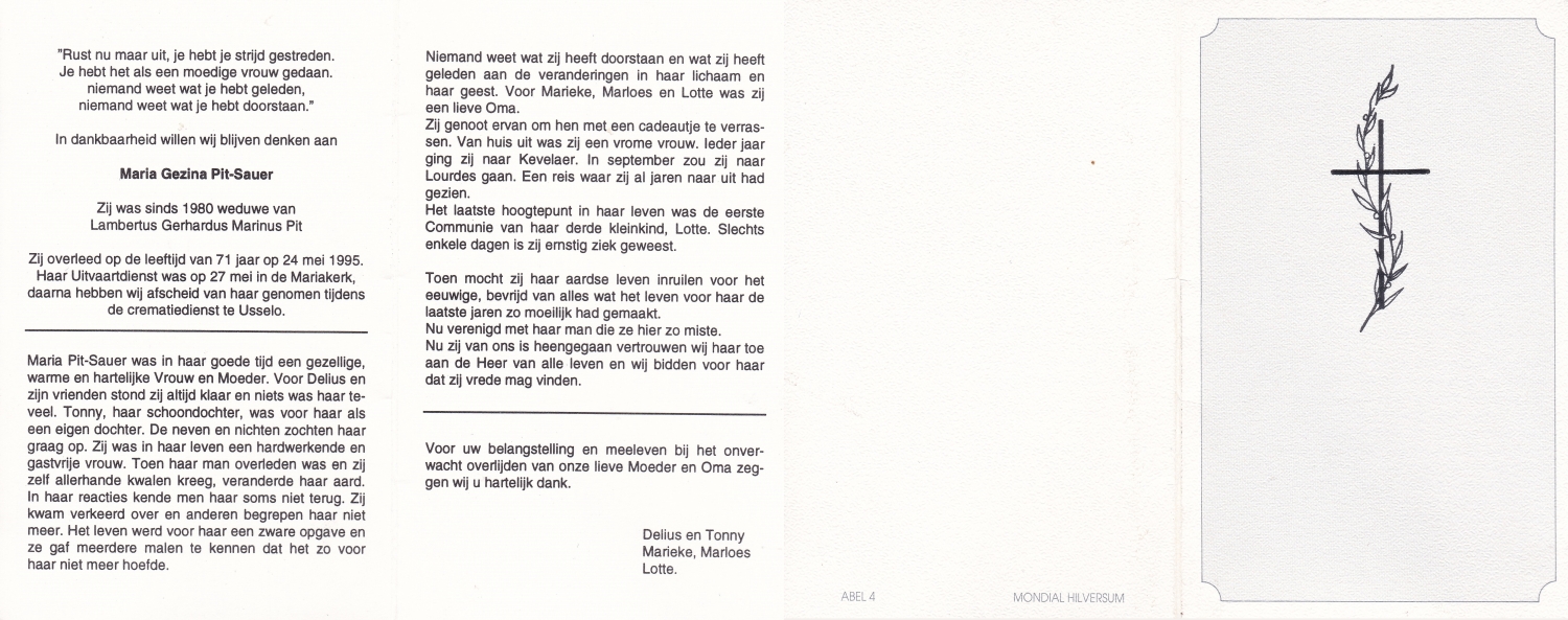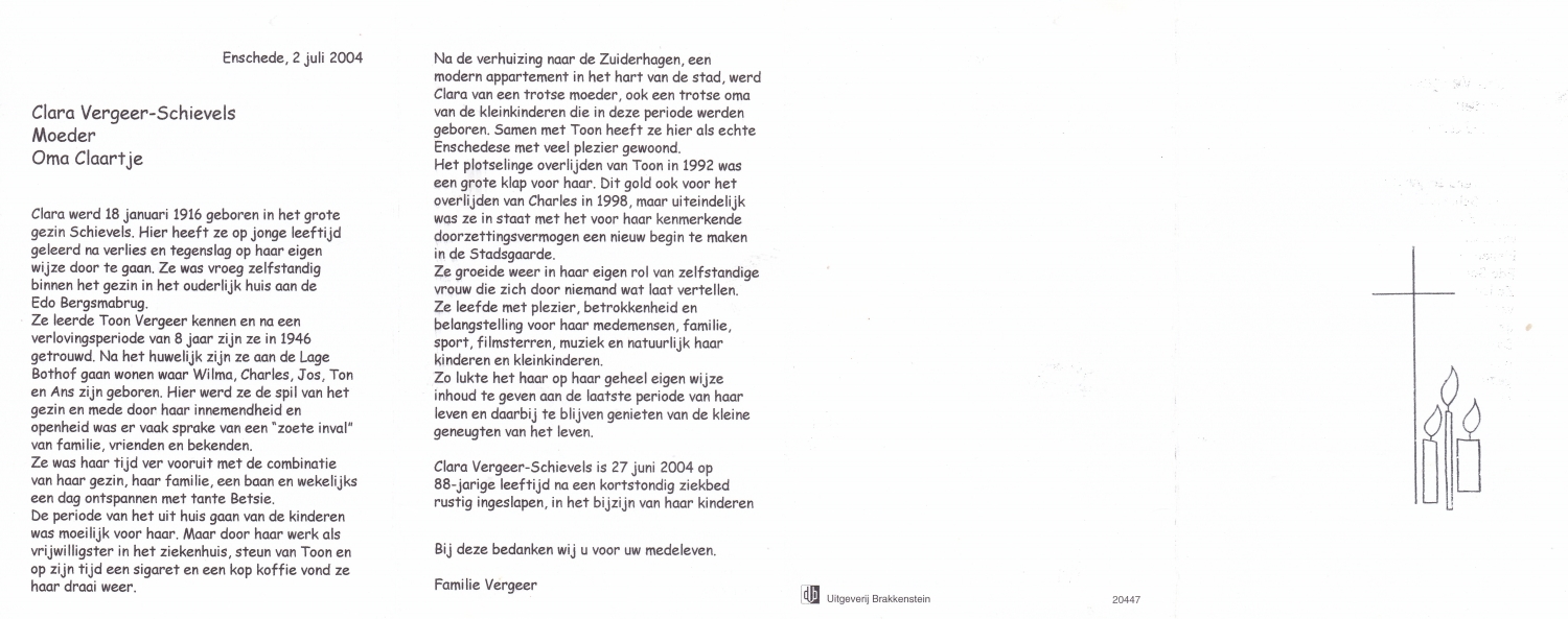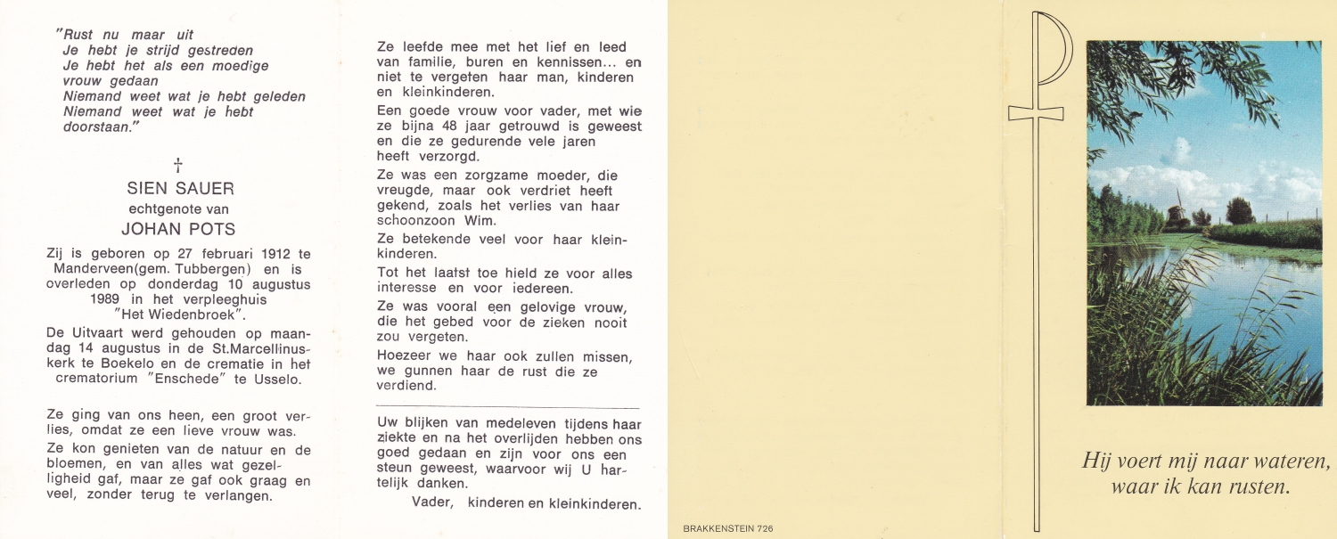 SLUIJMER, Anna Maria, geboren op 24-10-1899 te Enschede, overleden op 18-7-1988 te Enschede, ziekenhuis op 88-jarige leeftijd, gecremeerd op 21-7-1988 te Usselo.