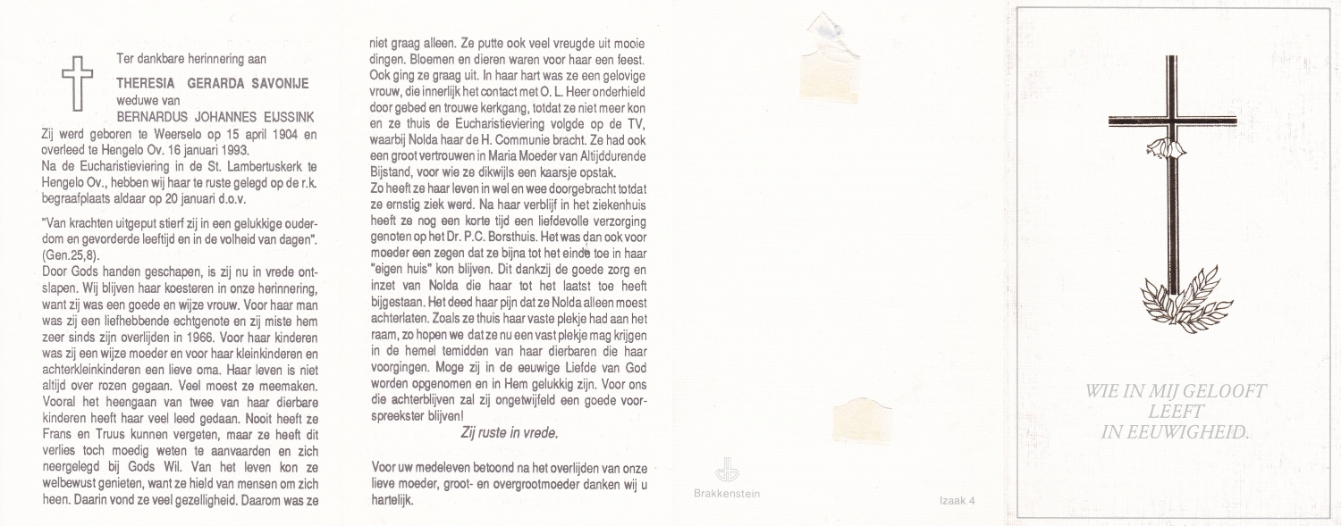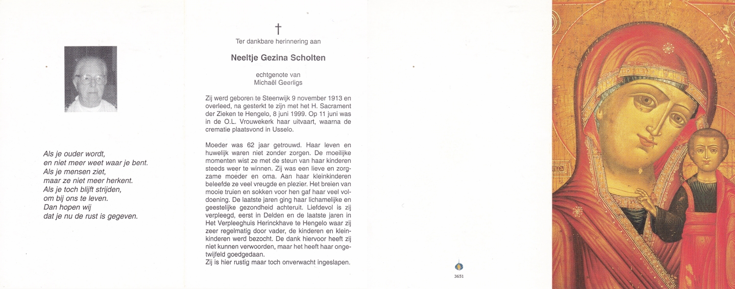 SNIPPERS, Engelbertha Christina, geboren op 23-7-1903 te Lonneker, overleden op 1-3-1999 te Lonneker op 95-jarige leeftijd, begraven op 5-3-1999 te Lonneker.