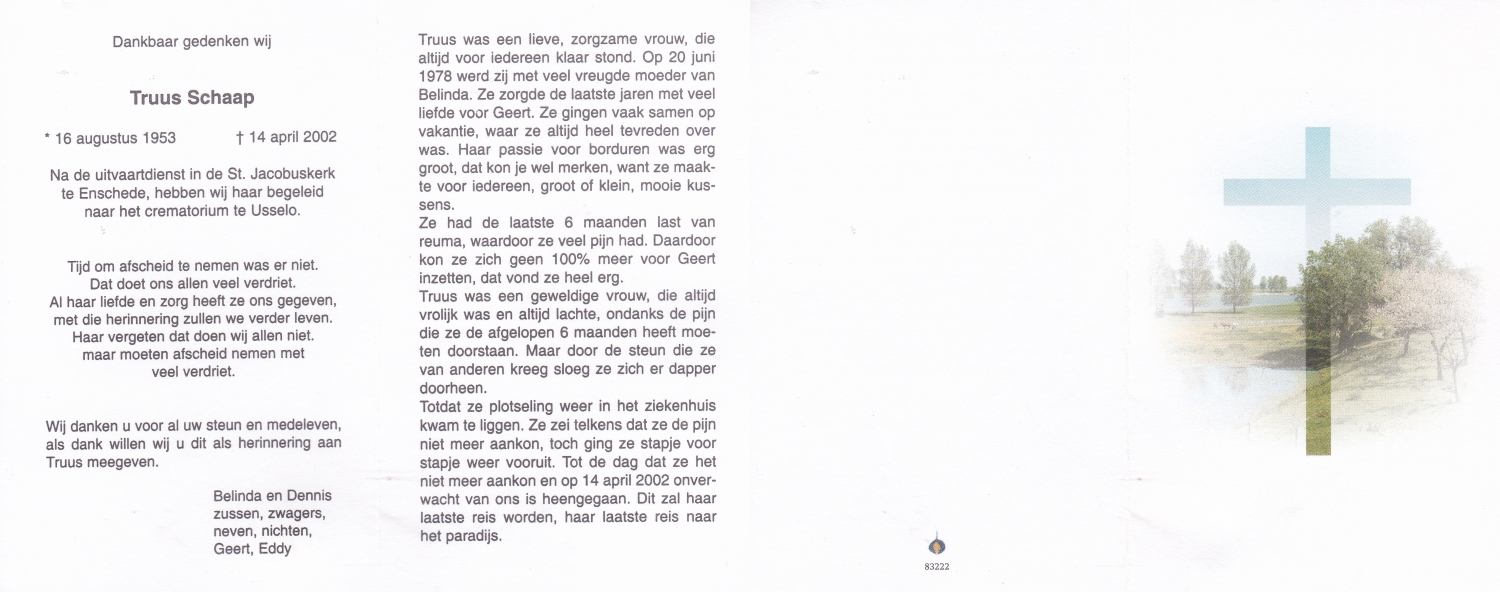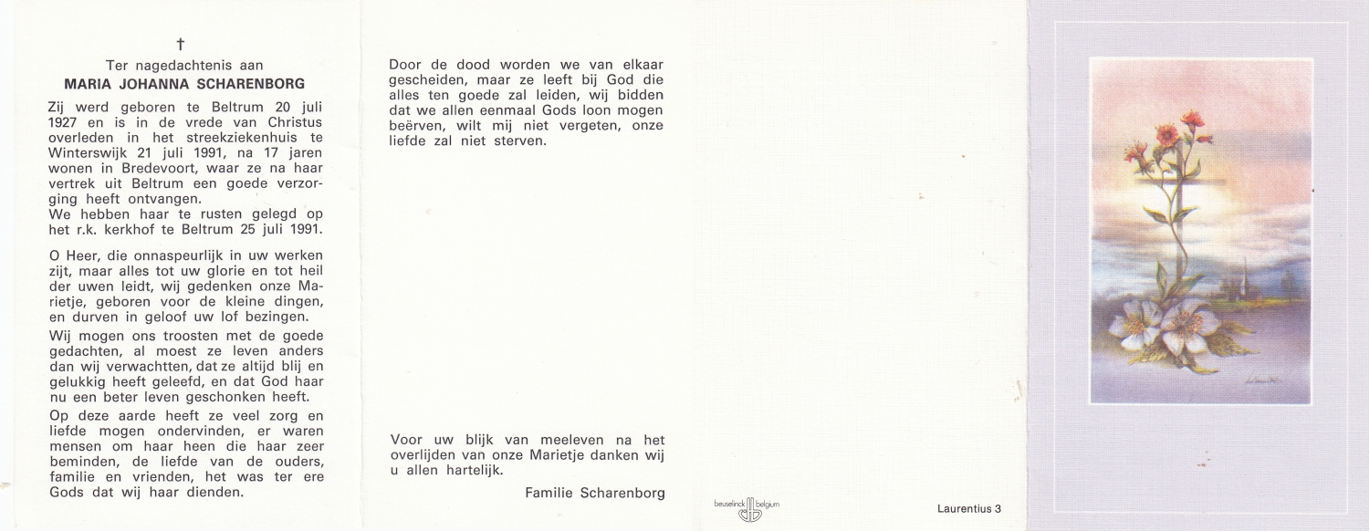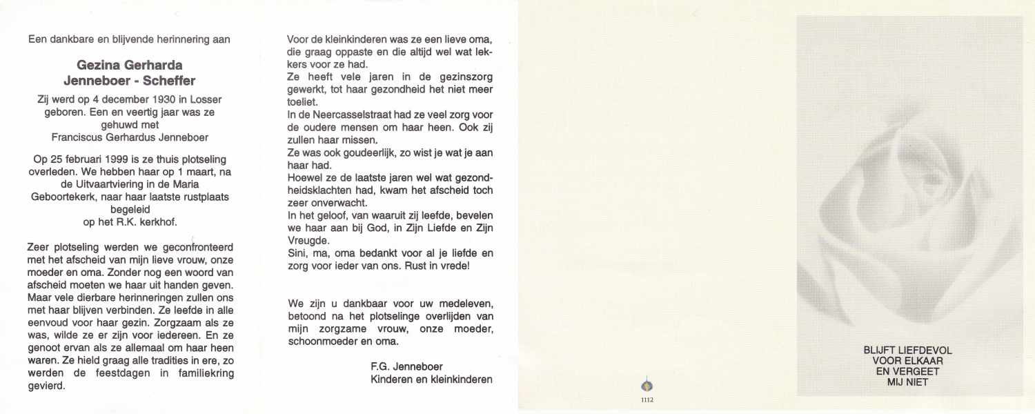 SCHARENBORG, Johanna Gezina, geboren op 6-2-1910 te Beckum, overleden op 12-8-1988 te Haaksbergen op 78-jarige leeftijd, begraven op 17-8-1988 te Beckum.