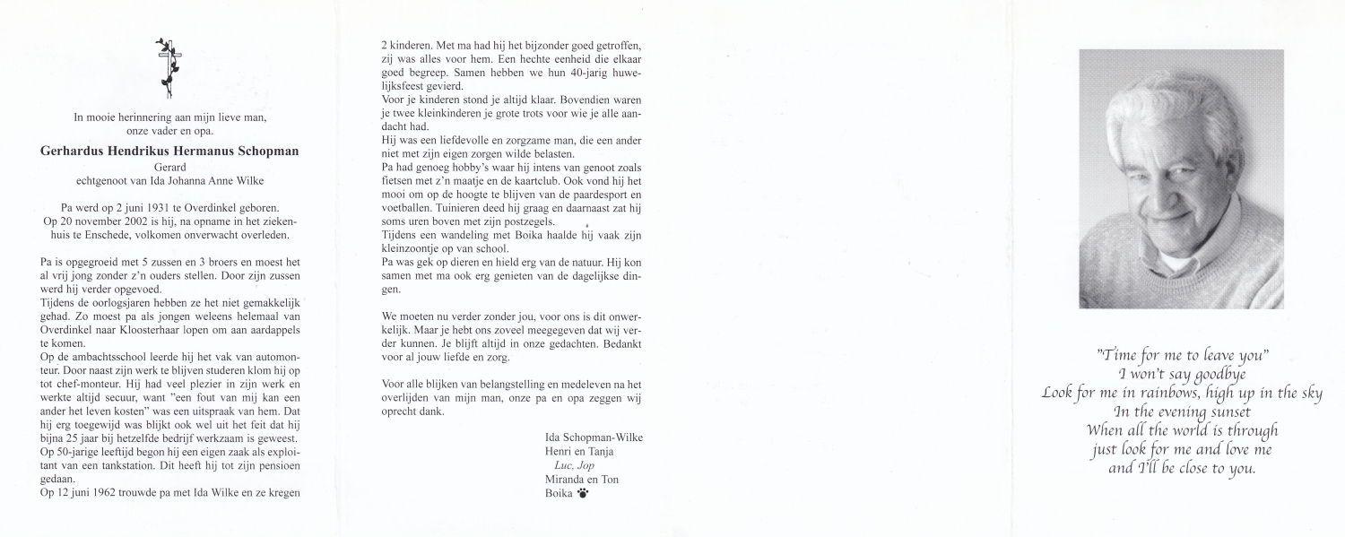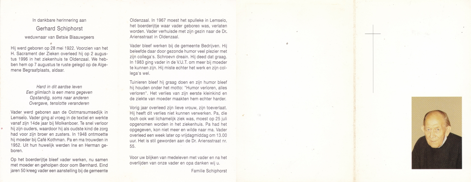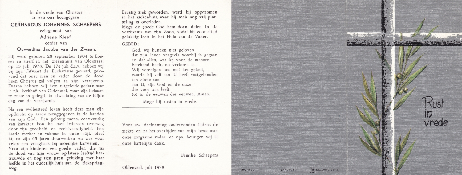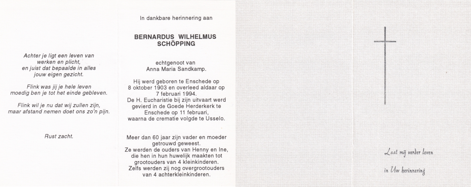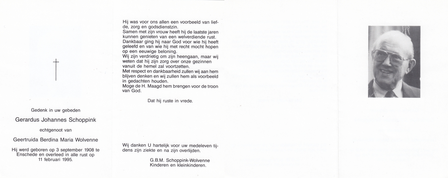 SCHOPMAN, Gerhard Johann, geboren op 15-8-1902 te Rheine, Dld, overleden op 4-10-1994 te Oldenzaal op 92-jarige leeftijd, begraven op 7-10-1994 te Oldenzaal.