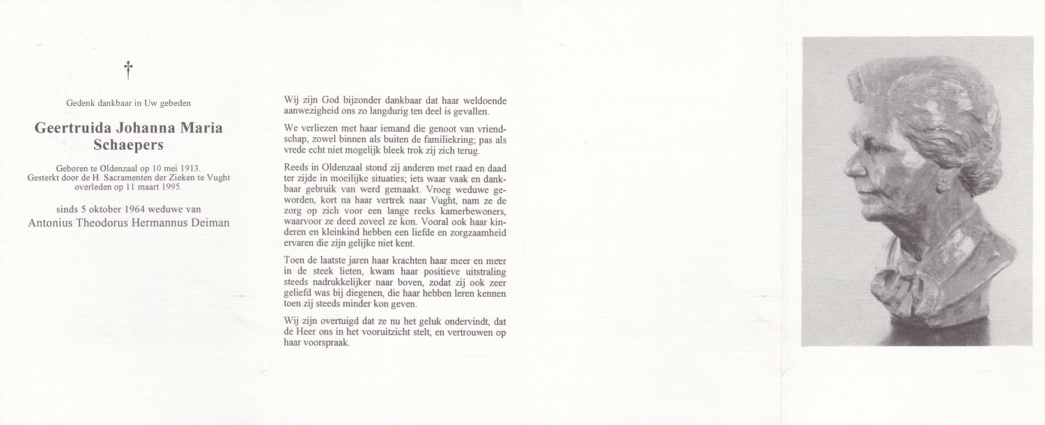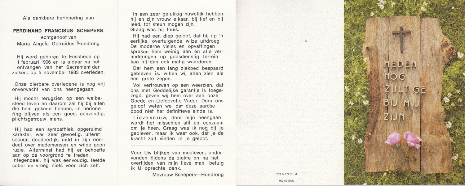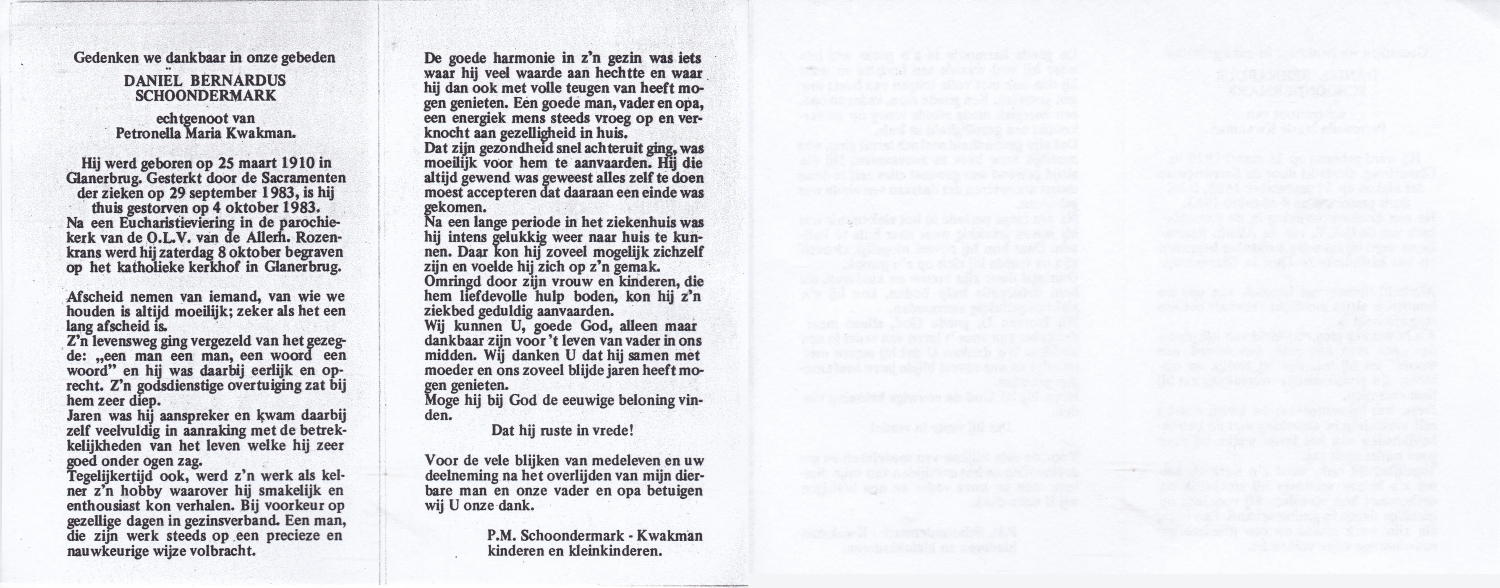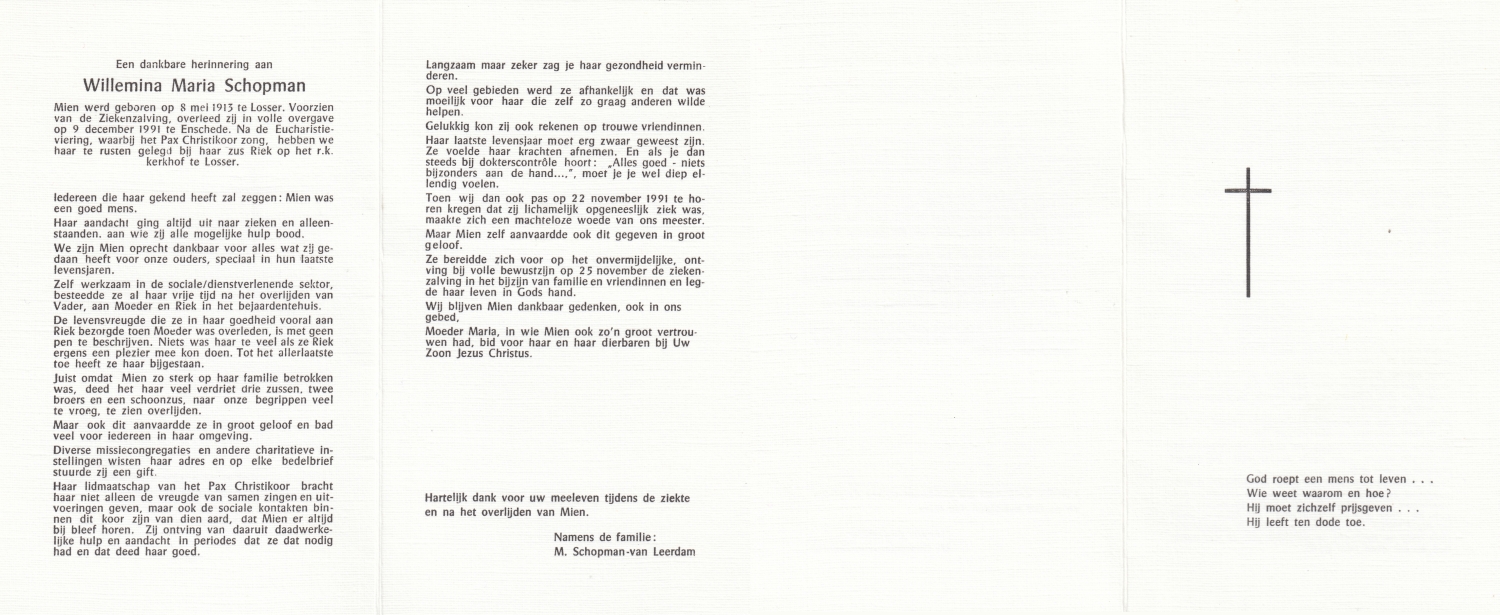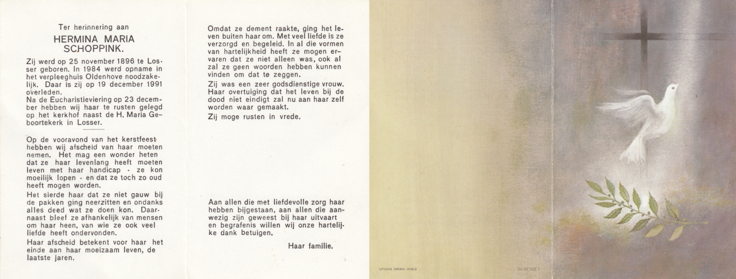 SCHOPMAN, Gerhard Johann, geboren op 15-8-1902 te Rheine, Dld, overleden op 4-10-1994 te Oldenzaal op 92-jarige leeftijd, begraven op 7-10-1994 te Oldenzaal.