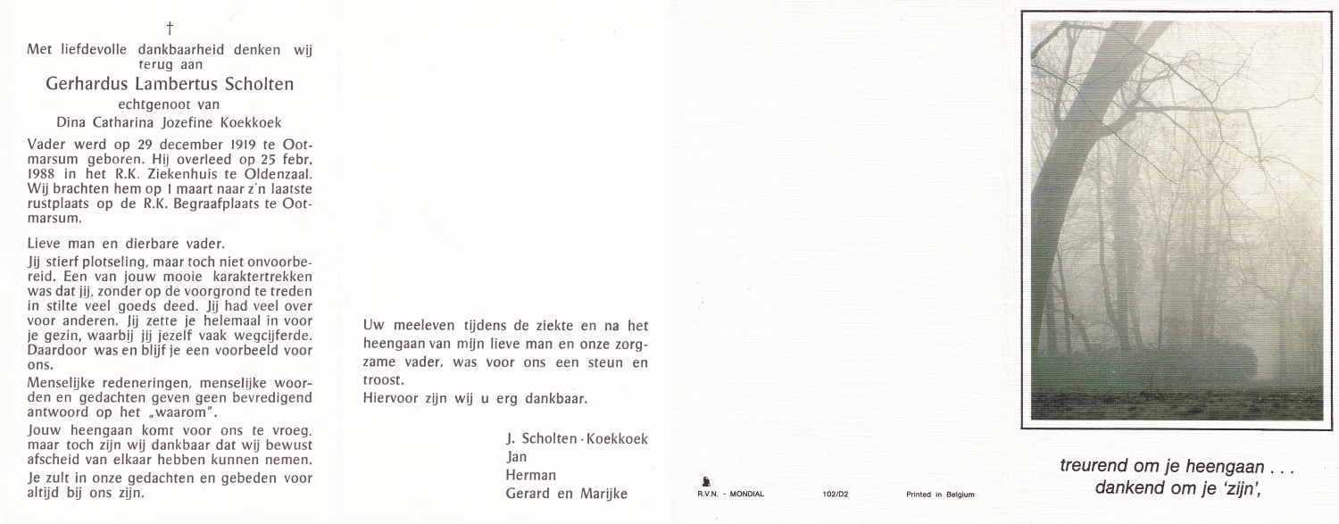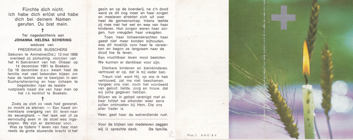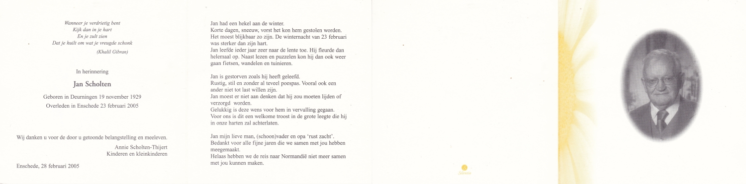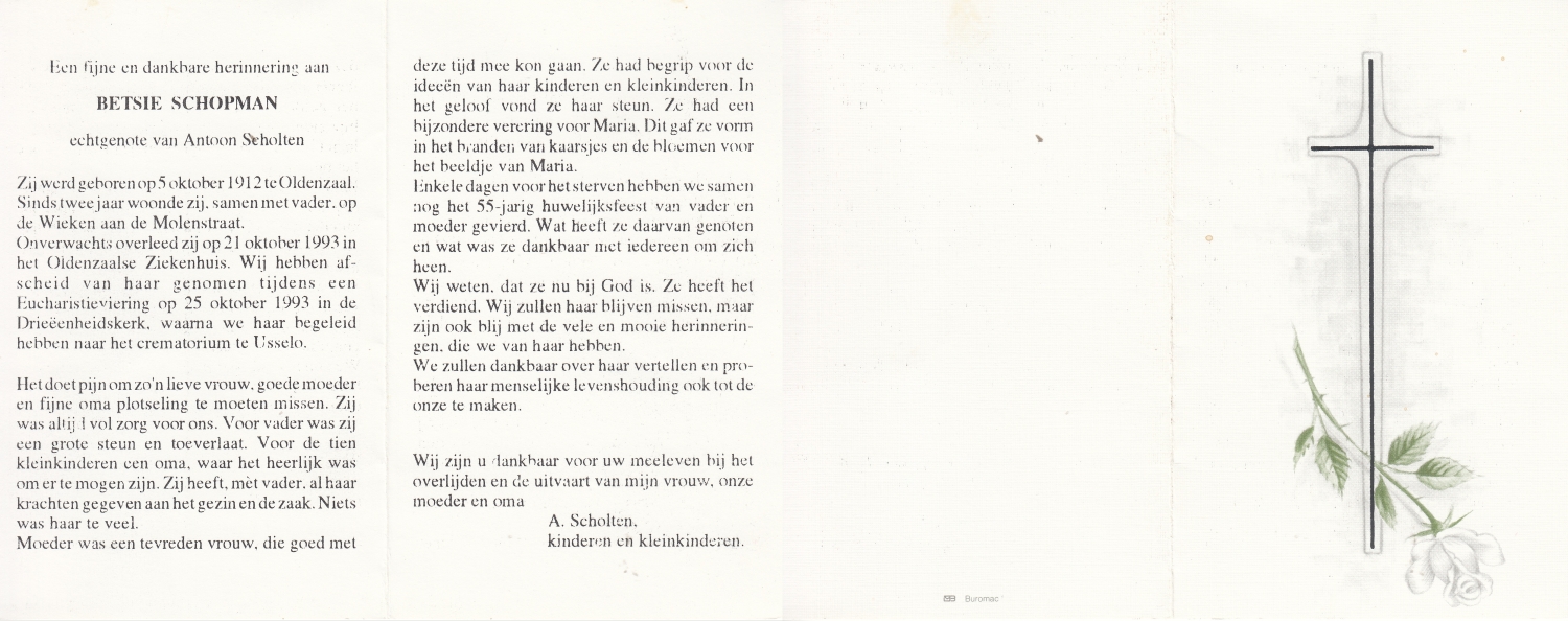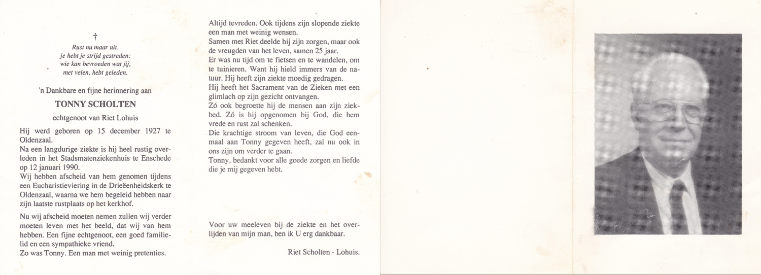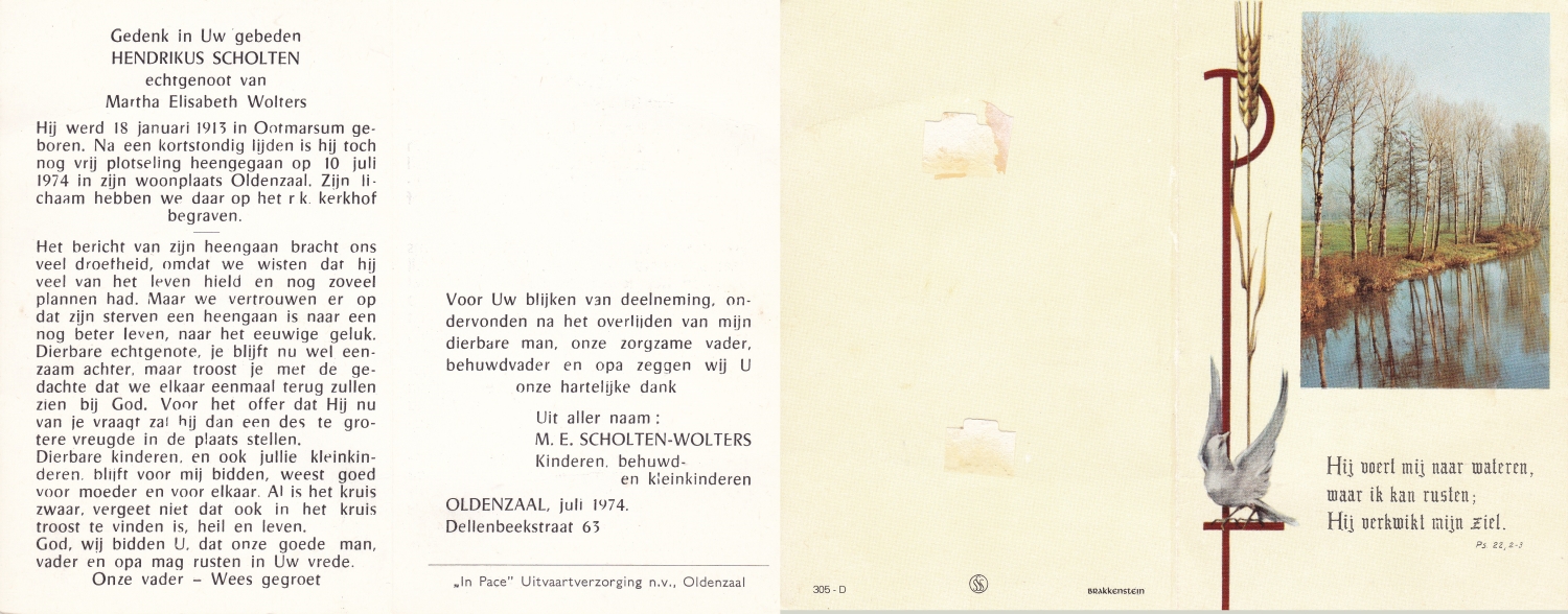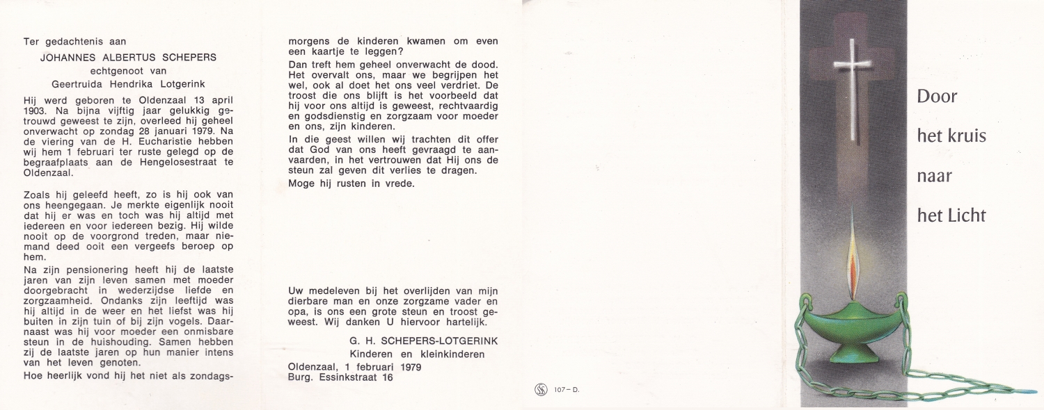 SCHOLTEN, Johannes Hendrikus, geboren op 17-11-1891 te Buurse, overleden op 27-10-1979 te Buurse op 87-jarige leeftijd, begraven op 31-10-1979 te Buurse.