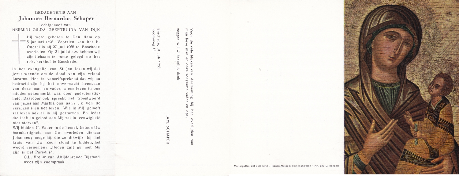 SCHURINK, Johannes Josephus, geboren op 03-03-1883 te Winterswijk, overleden op 2-9-1958 te Enschede op 75-jarige leeftijd, begraven op 5-9-1958 te Enschede.