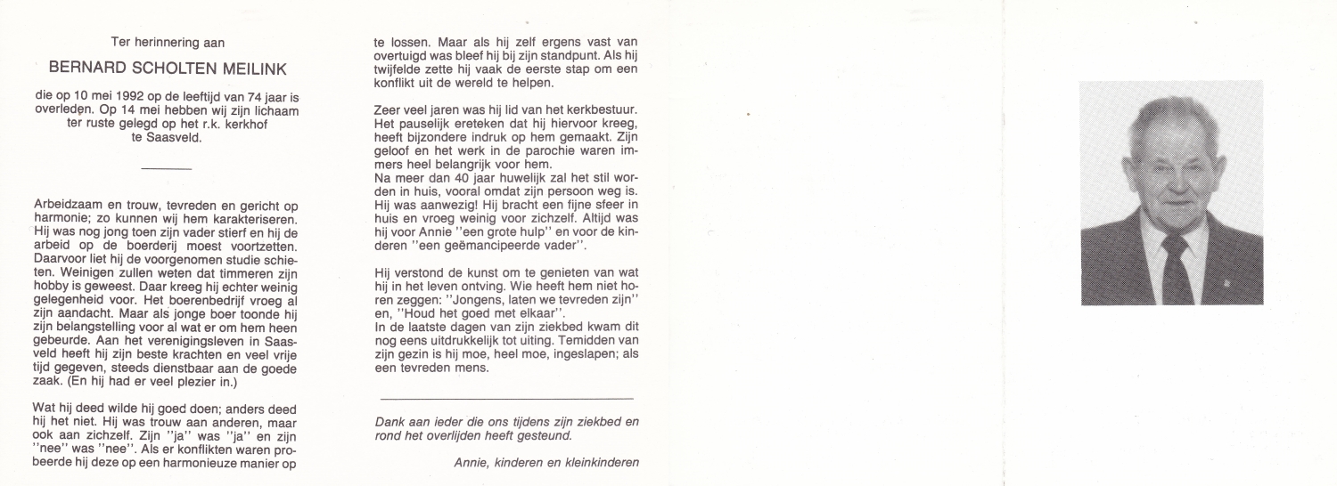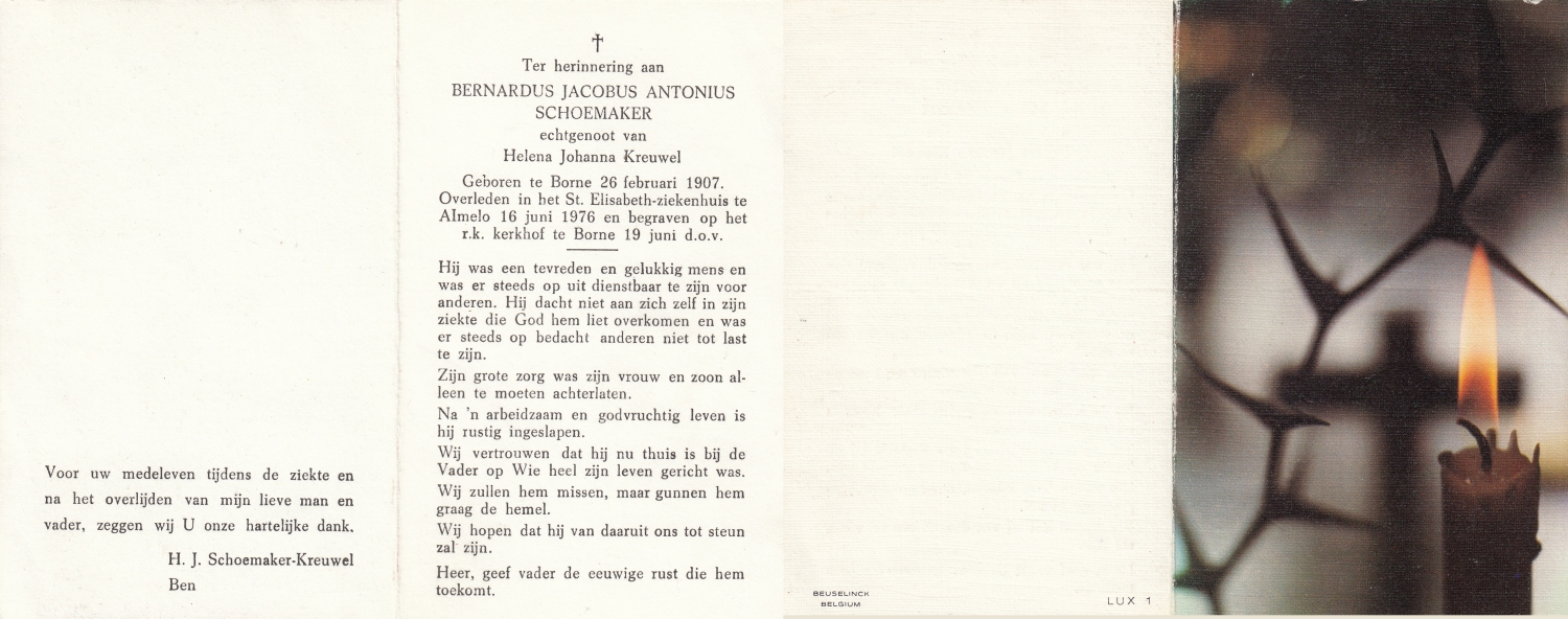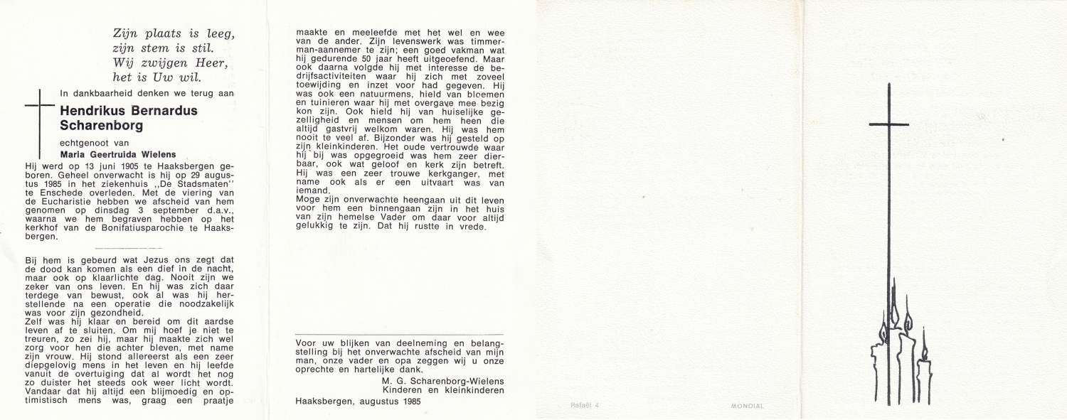 SCHARENBORG, Bernardus Wilhelmus, geboren op 30-3-1913 te Haaksbergen, overleden op 26-3-1976 te Haaksbergen op 62-jarige leeftijd, begraven op 30-3-1976 te Haaksbergen.