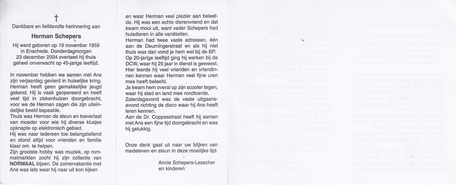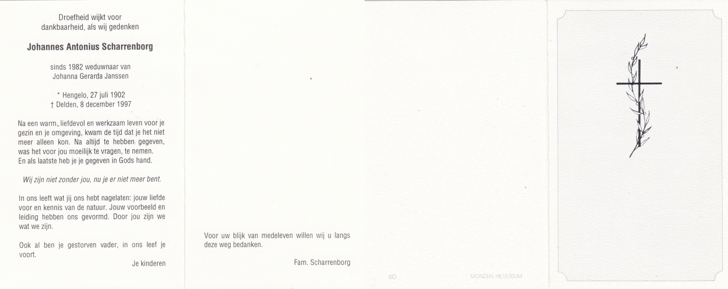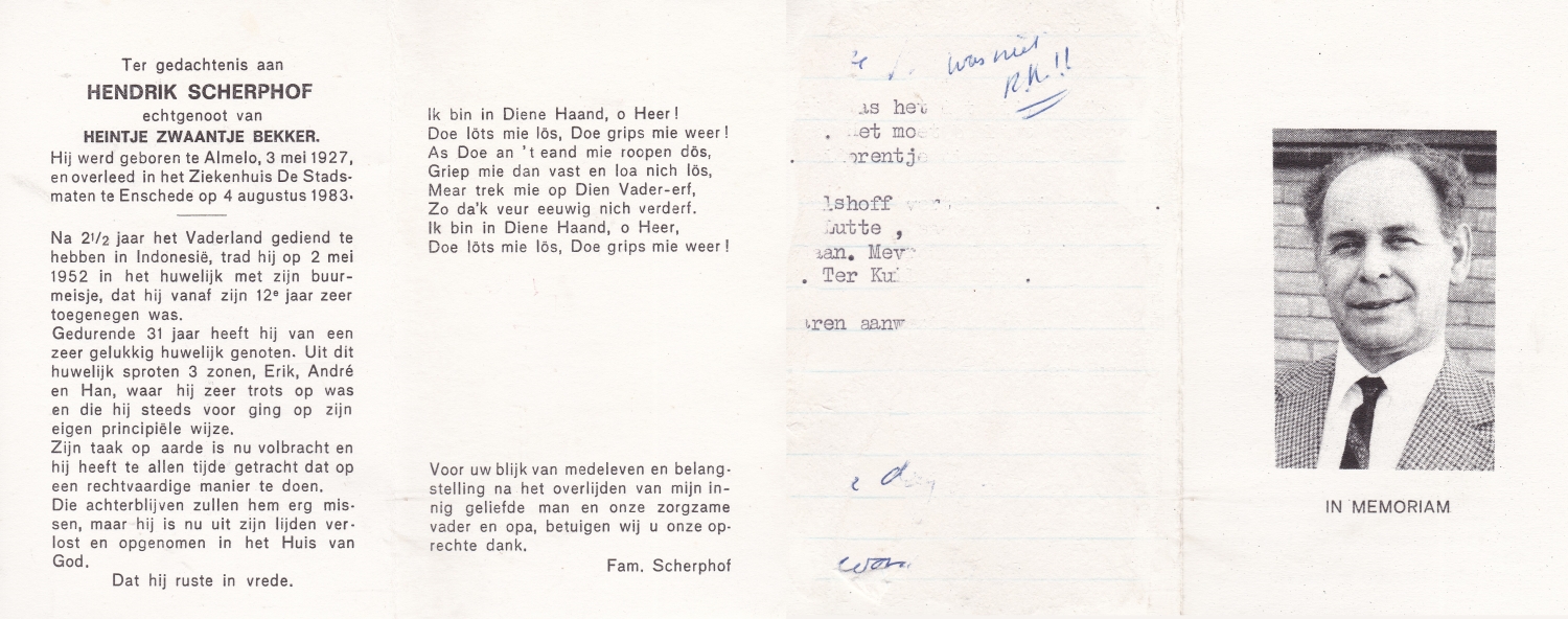 SCHARENBERG, Hendrikus Hermannus, geboren op 20-8-1919 te Haaksbergen, overleden op 12-3-1986 te Enschede, ziekenhuis op 66-jarige leeftijd, gecremeerd op 17-3-1986 te Usselo.
