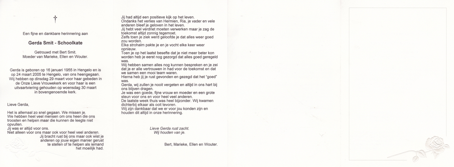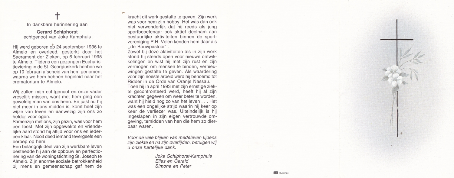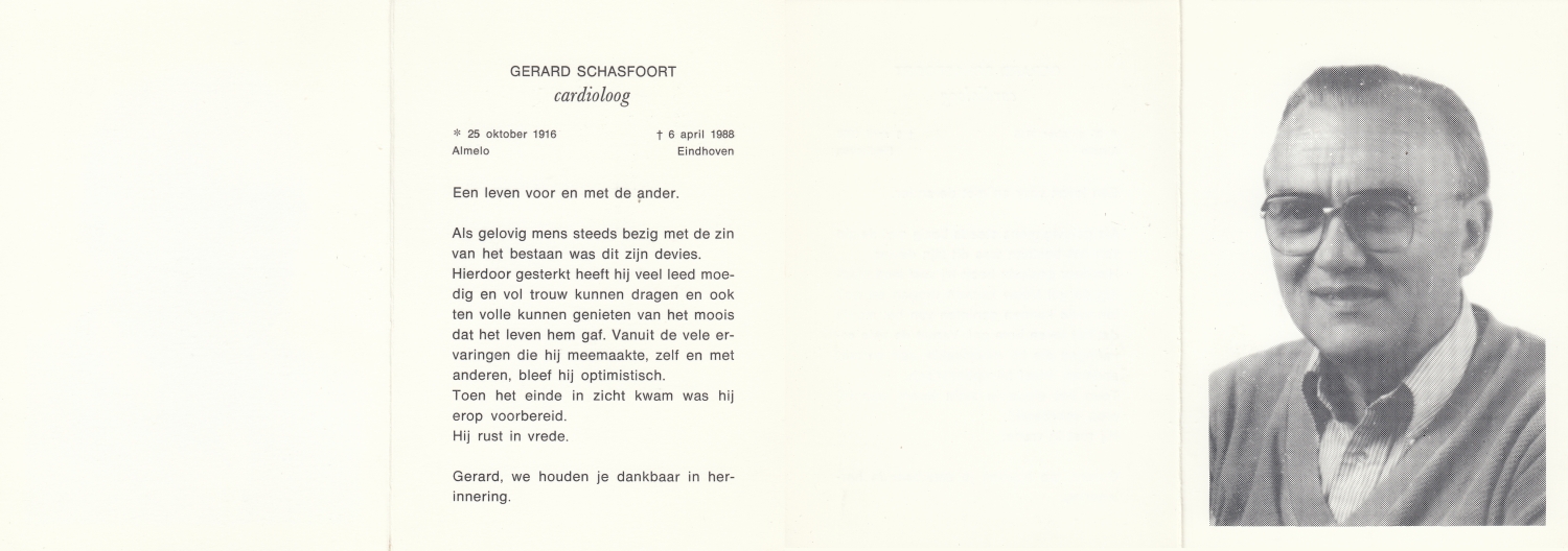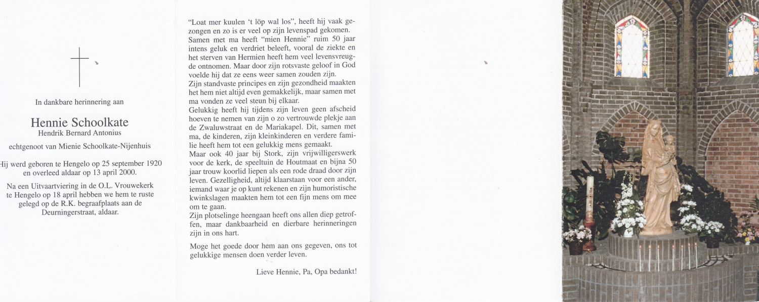 SCHOOLKATE, Gerard John, geboren op 26-11-1921 te Hengelo (O), overleden op 29-3-1993 te Hengelo (O) op 71-jarige leeftijd, gecremeerd op 2-4-1993 te Usselo.