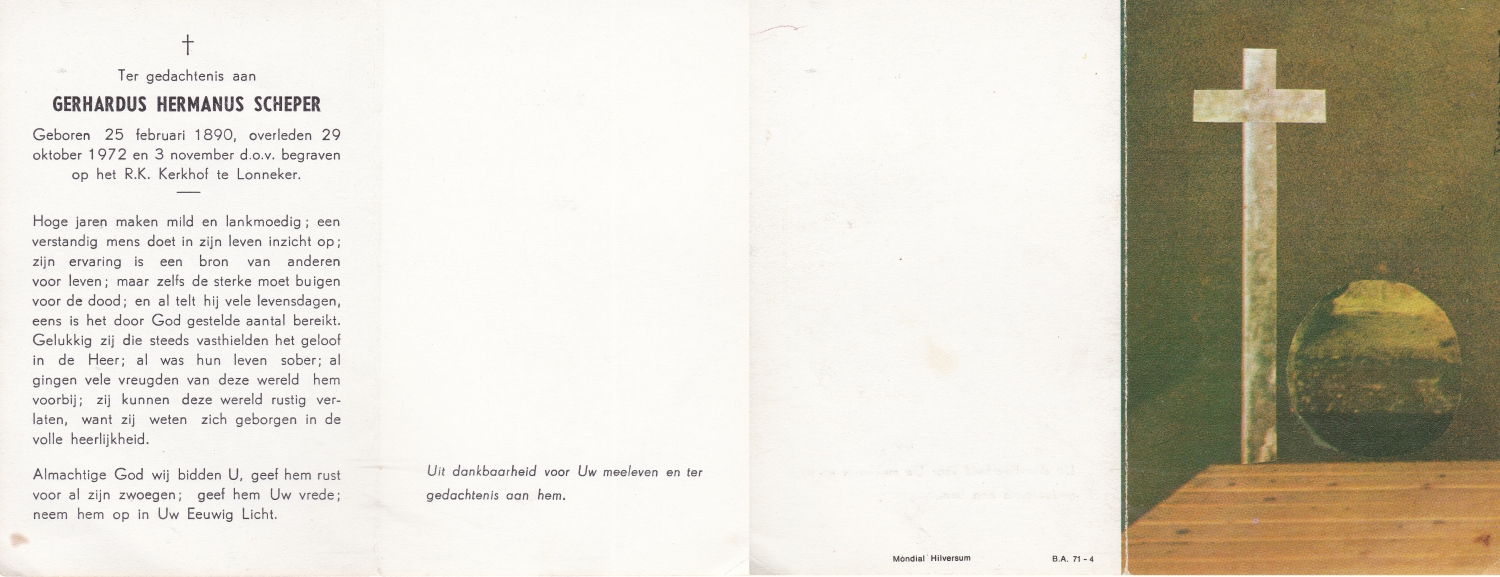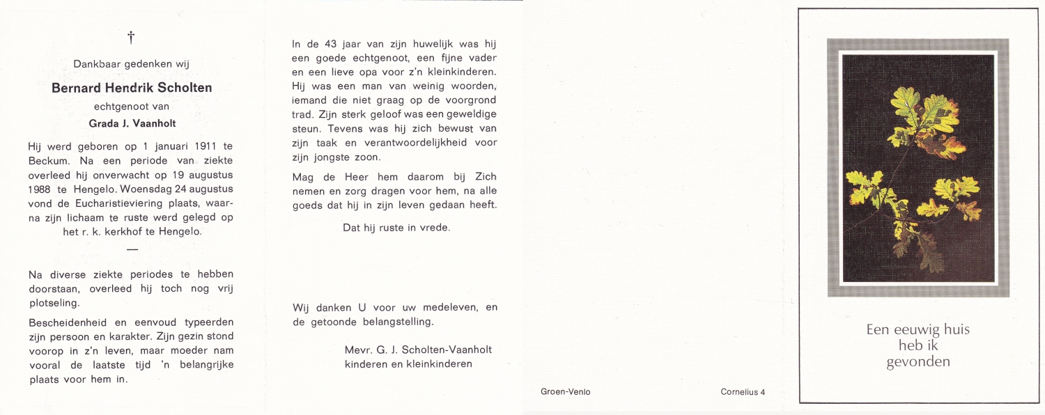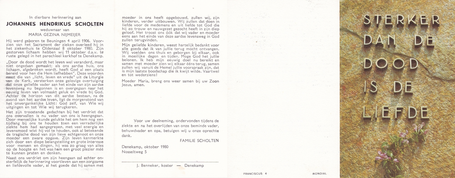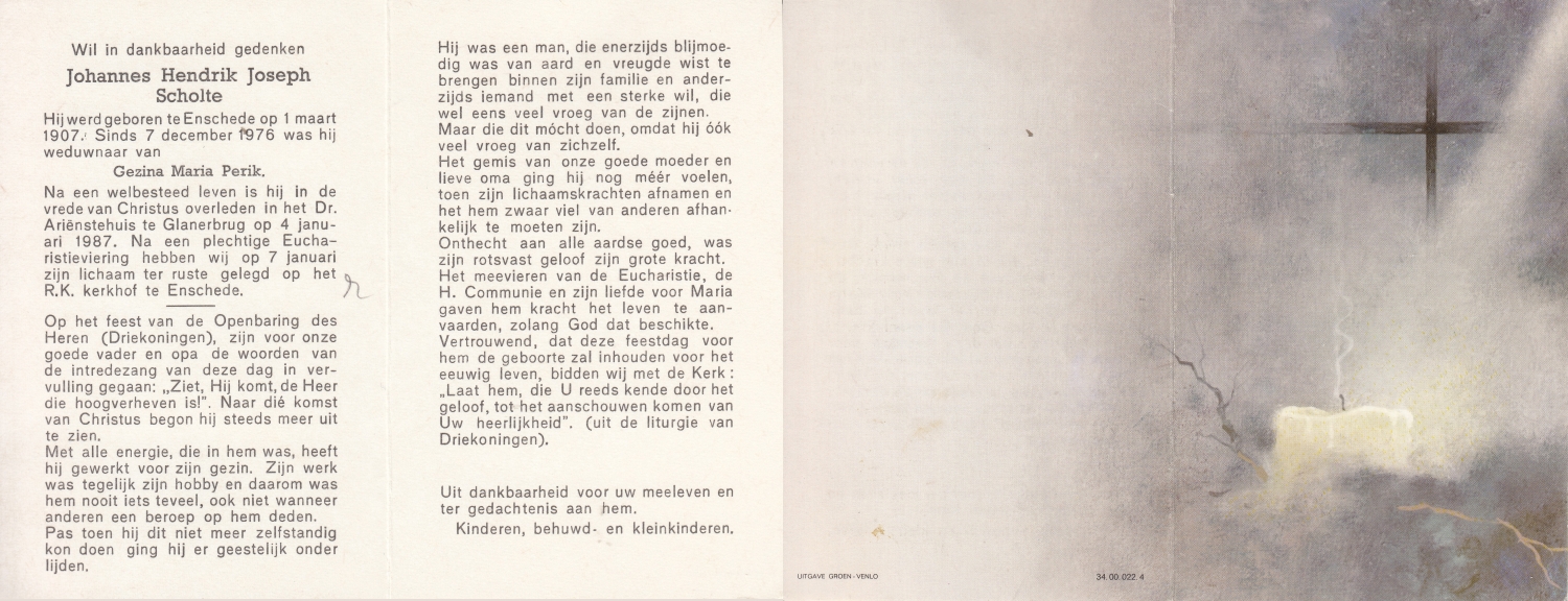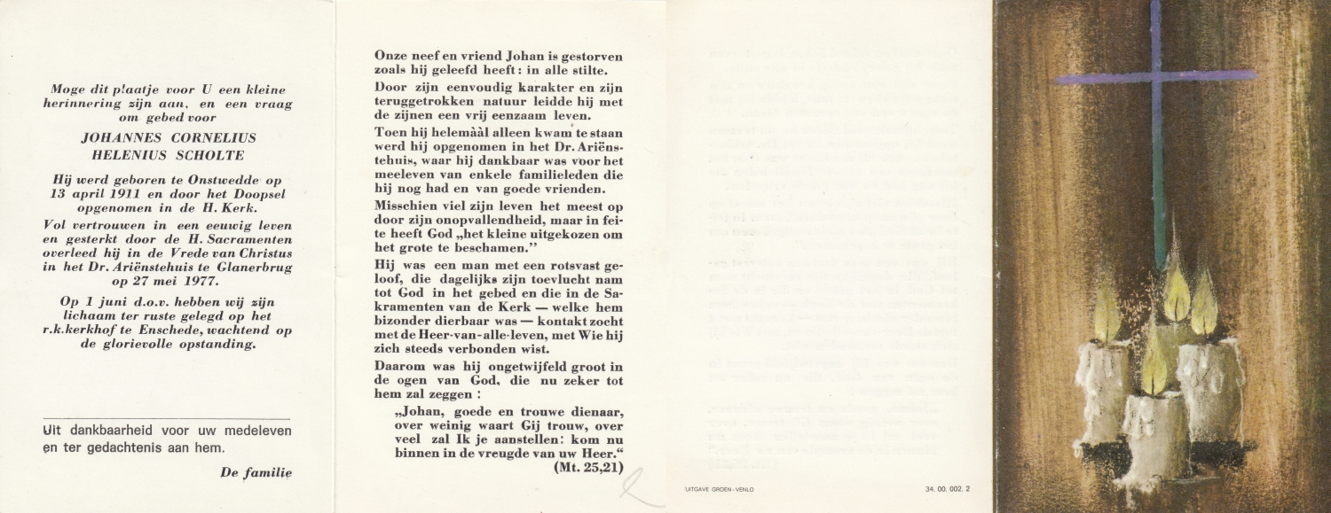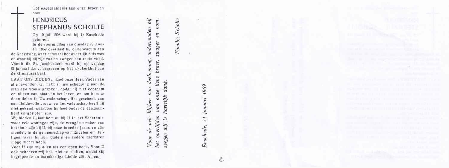 SCHOLTEN, Henricus Johannes, geboren op 14-5-1905 te Beckum, overleden op 3-5-1971 te Hengelo (O) op 65-jarige leeftijd, begraven op 7-5-1971 te Beckum.