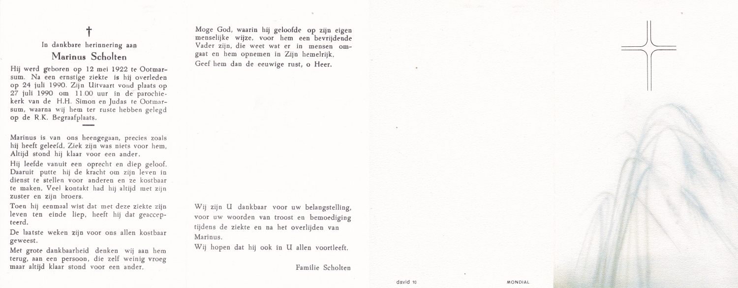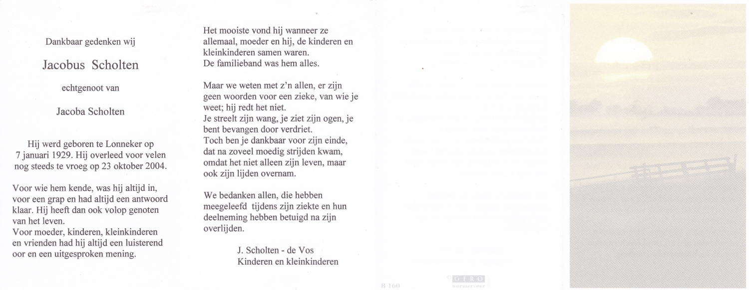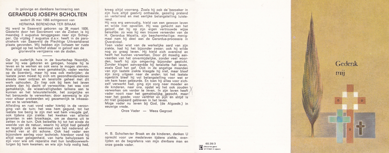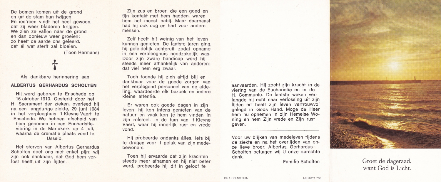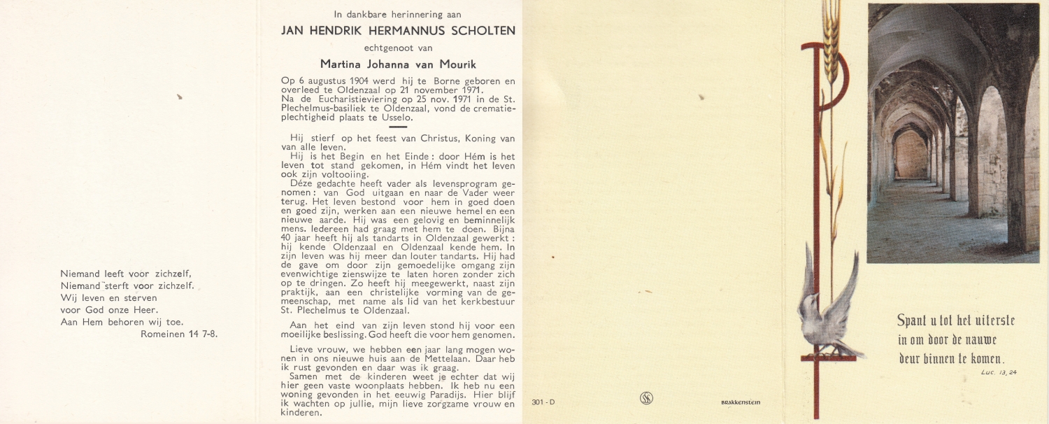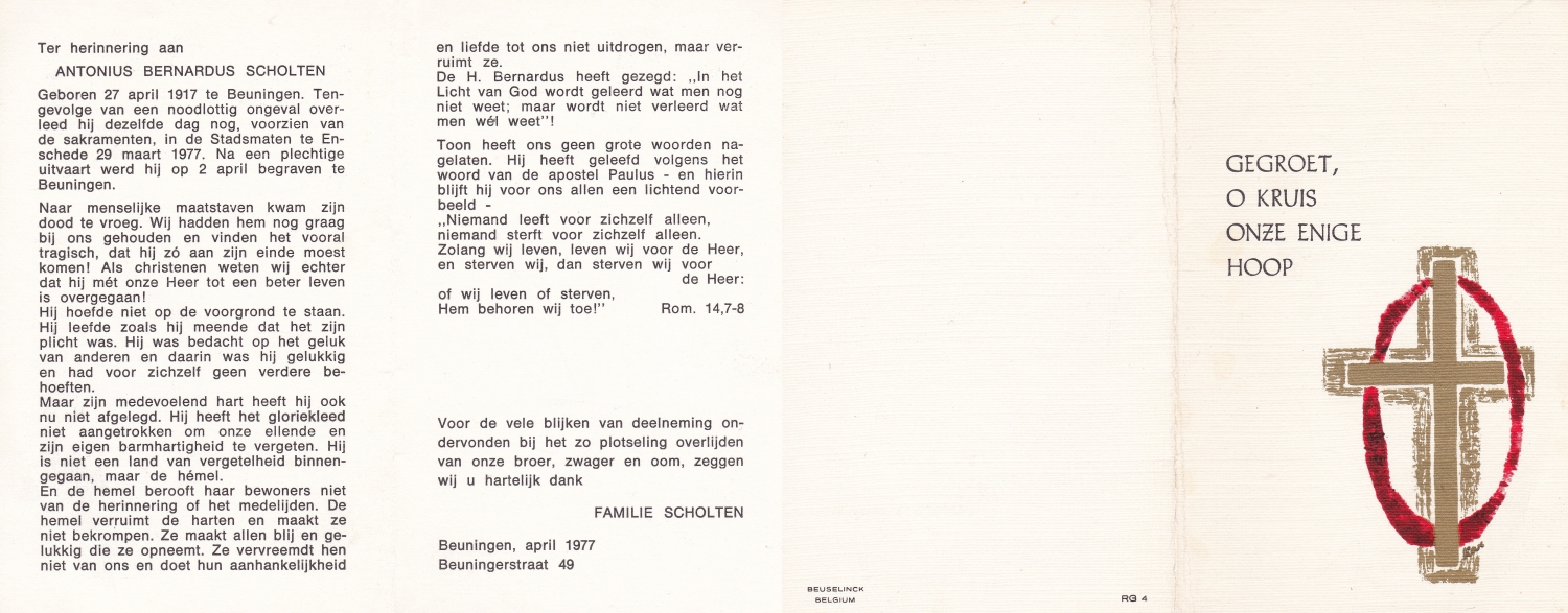 SCHOLTEN, Henricus Johannes, geboren op 14-5-1905 te Beckum, overleden op 3-5-1971 te Hengelo (O) op 65-jarige leeftijd, begraven op 7-5-1971 te Beckum.