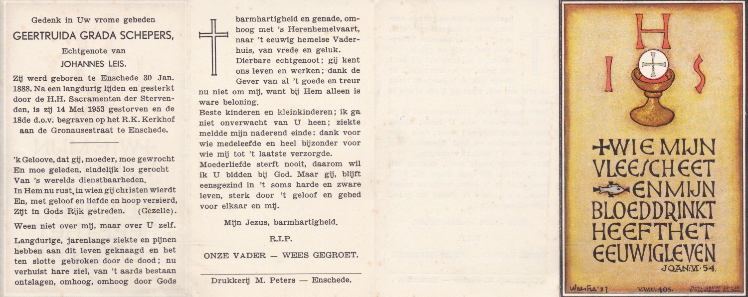 SCHOPMAN, Johanna Maria Francisca, geboren op 21-8-1902 te De Lutte, overleden op 6-6-1953 te Deurningen op 50-jarige leeftijd, begraven op 10-6-1953 te De Lutte.