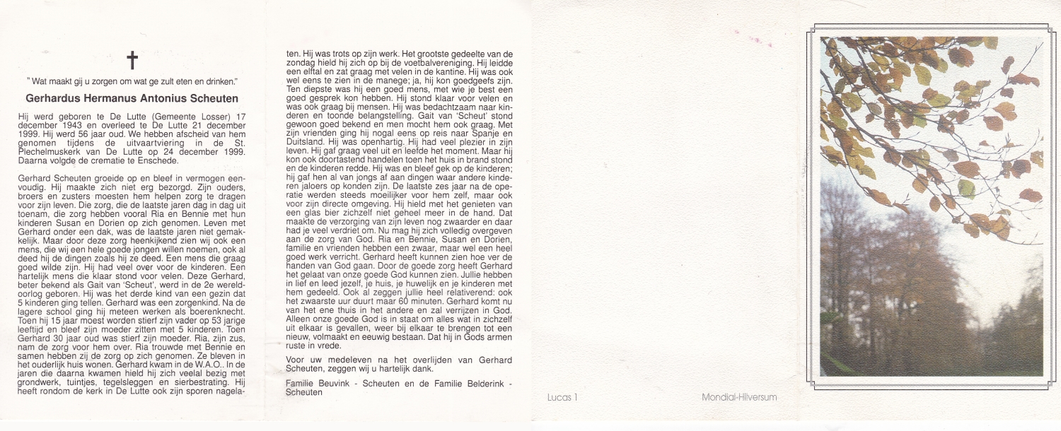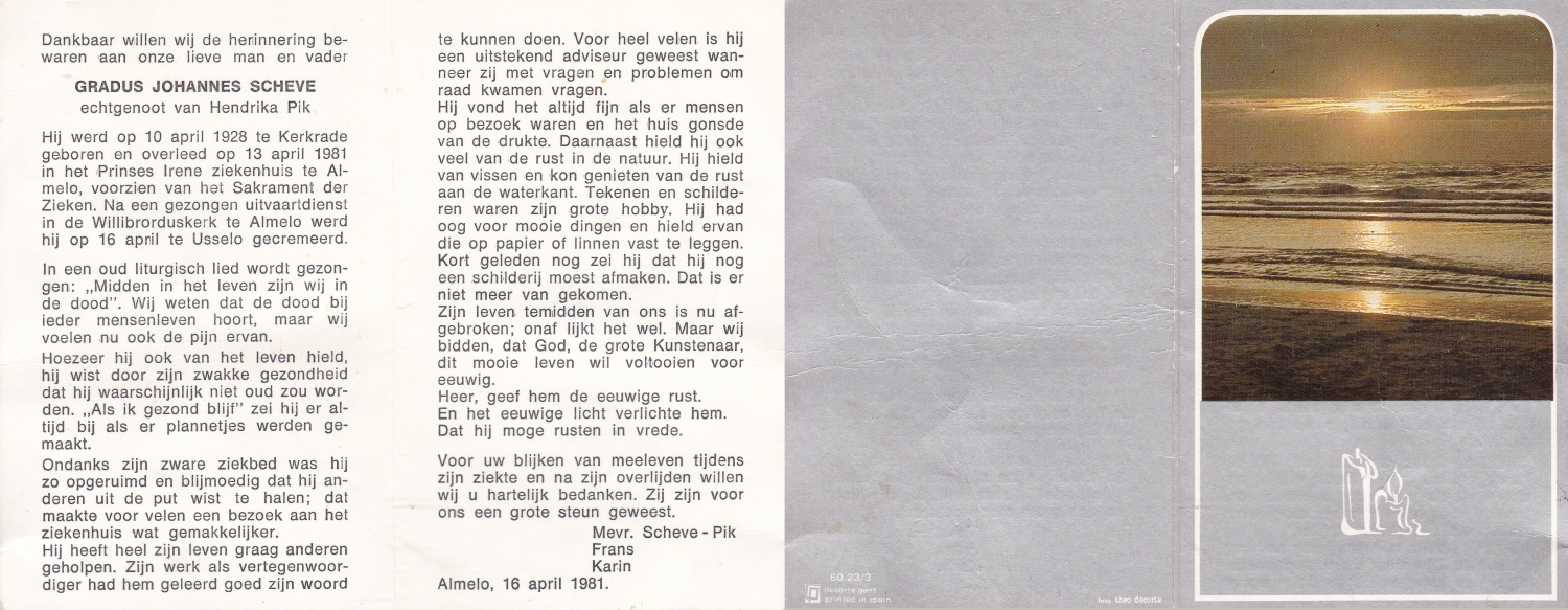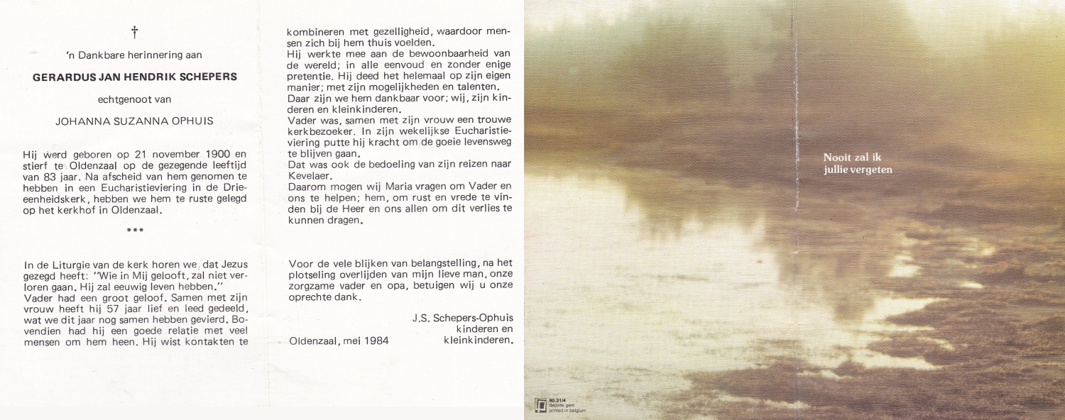 SCHEURINK, Gerhardus Antonius, geboren op 10-10-1910 te Oldenzaal, overleden op 6-1-1981 te Etten Leur op 70-jarige leeftijd, begraven op 10-1-1981 te Oldenzaal.