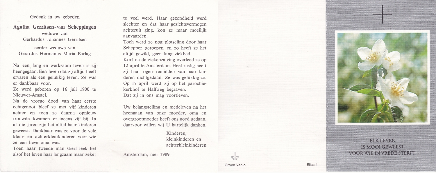 SCHARENBERG, Geertruida Berendina, geboren op 24-5-1914 te Losser, overleden op 20-3-1988 op 73-jarige leeftijd, begraven op 24-3-1988 te Beckum.