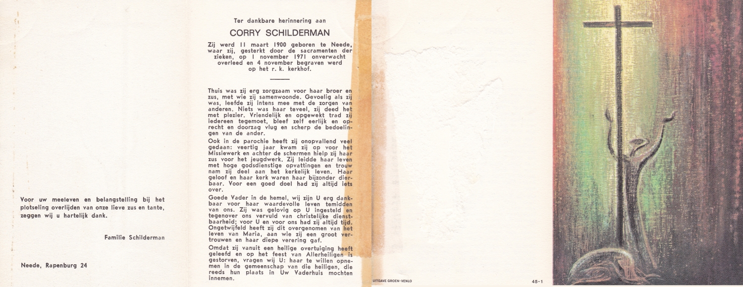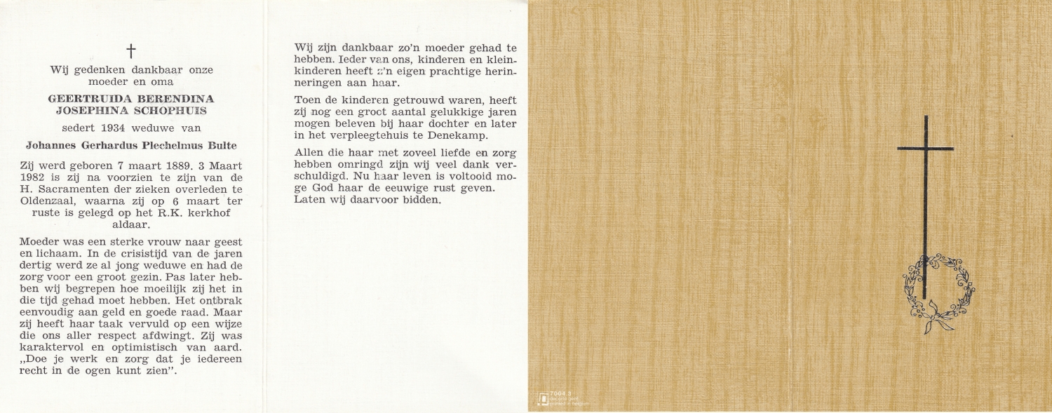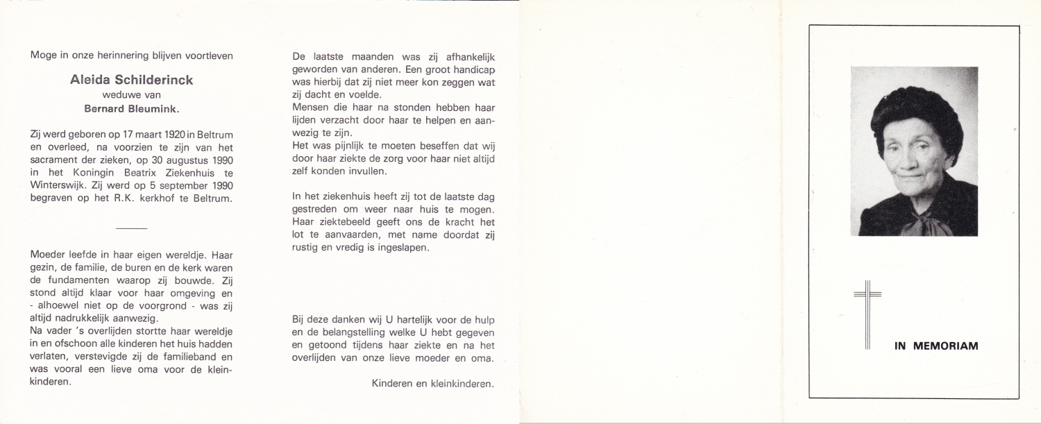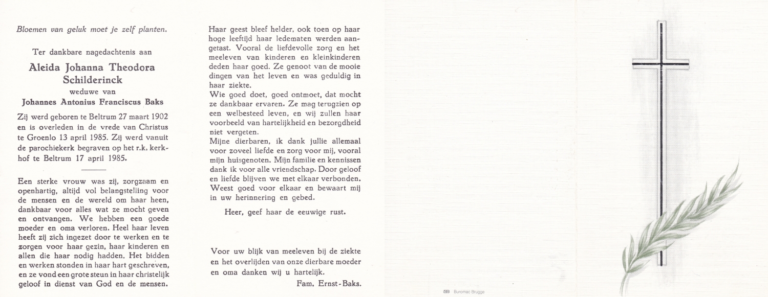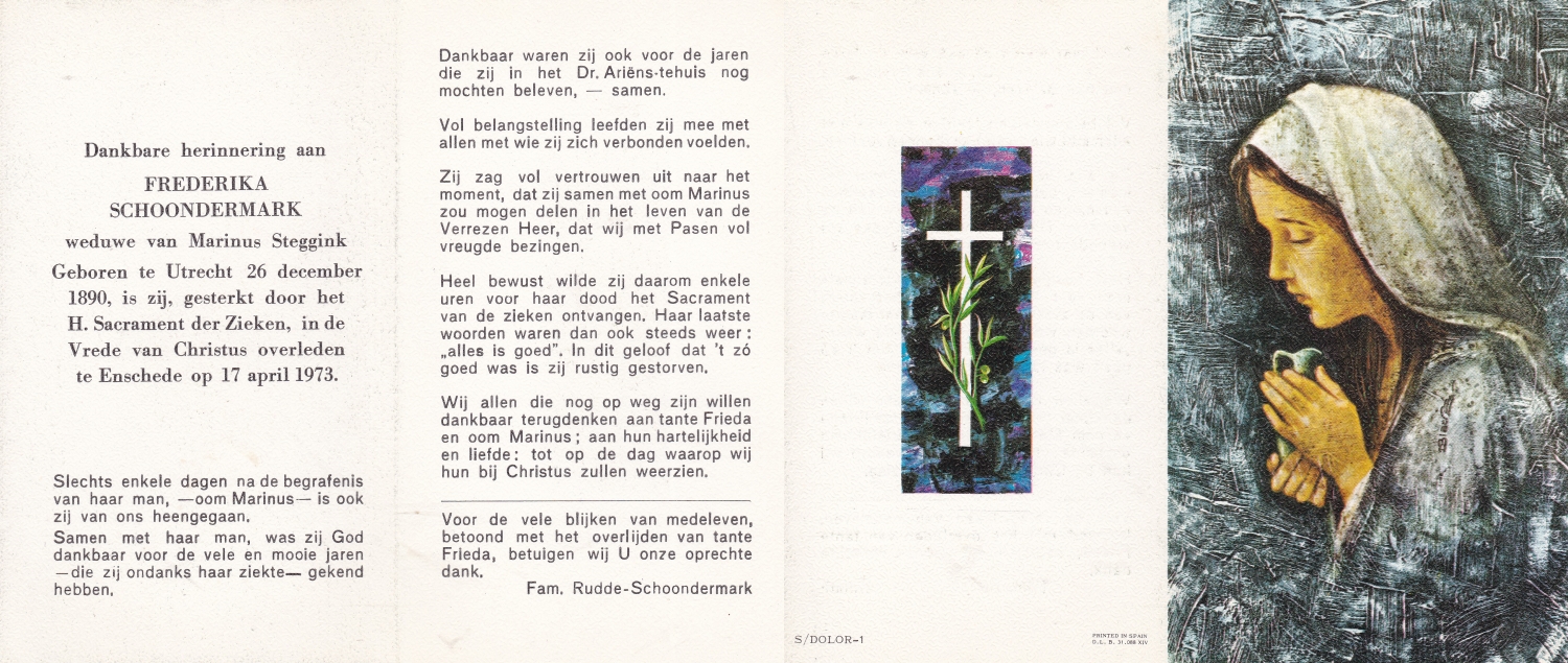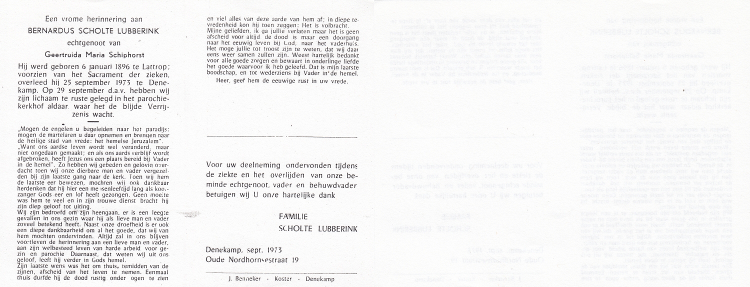SCHURINK, Berendina Juliana, geboren op 19-7-1911 te De Lutte, overleden op 22-3-1973 te Oldenzaal op 61-jarige leeftijd, begraven op 26-3-1973 te De Lutte.